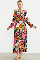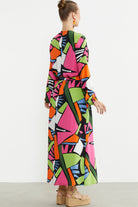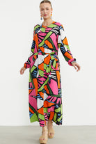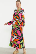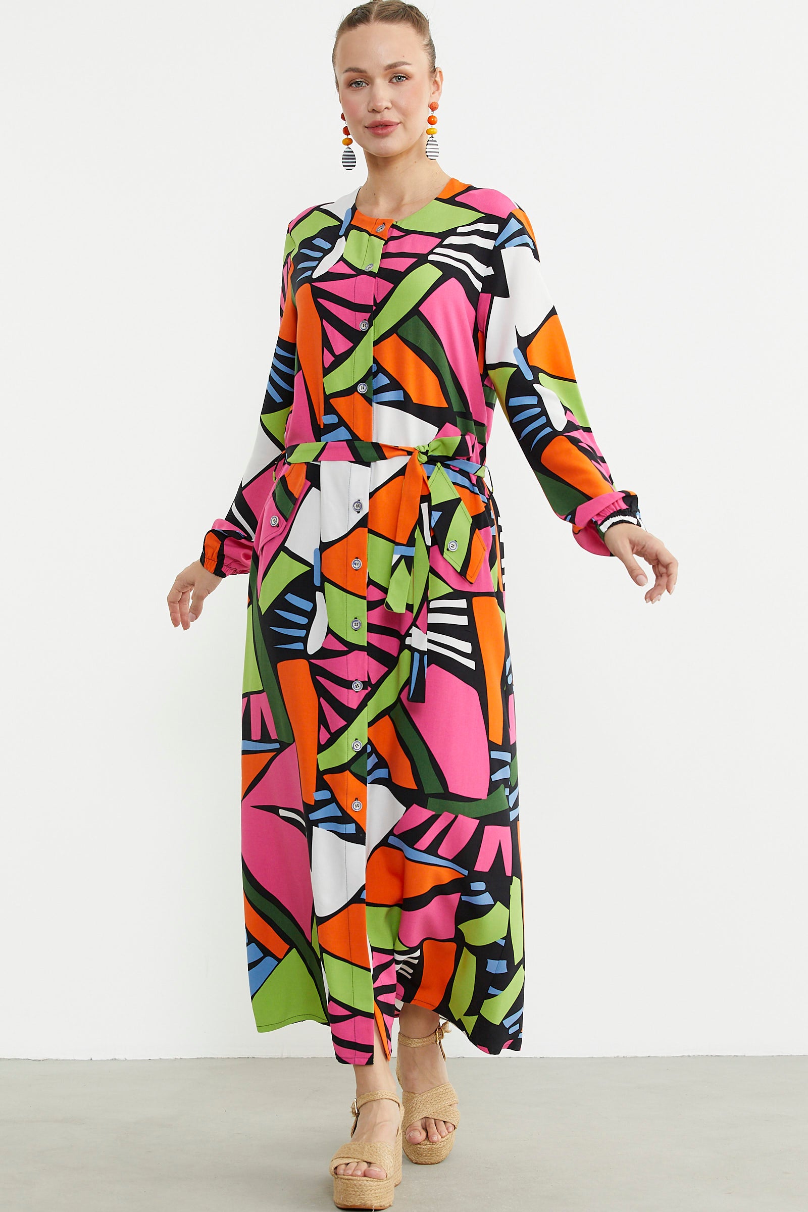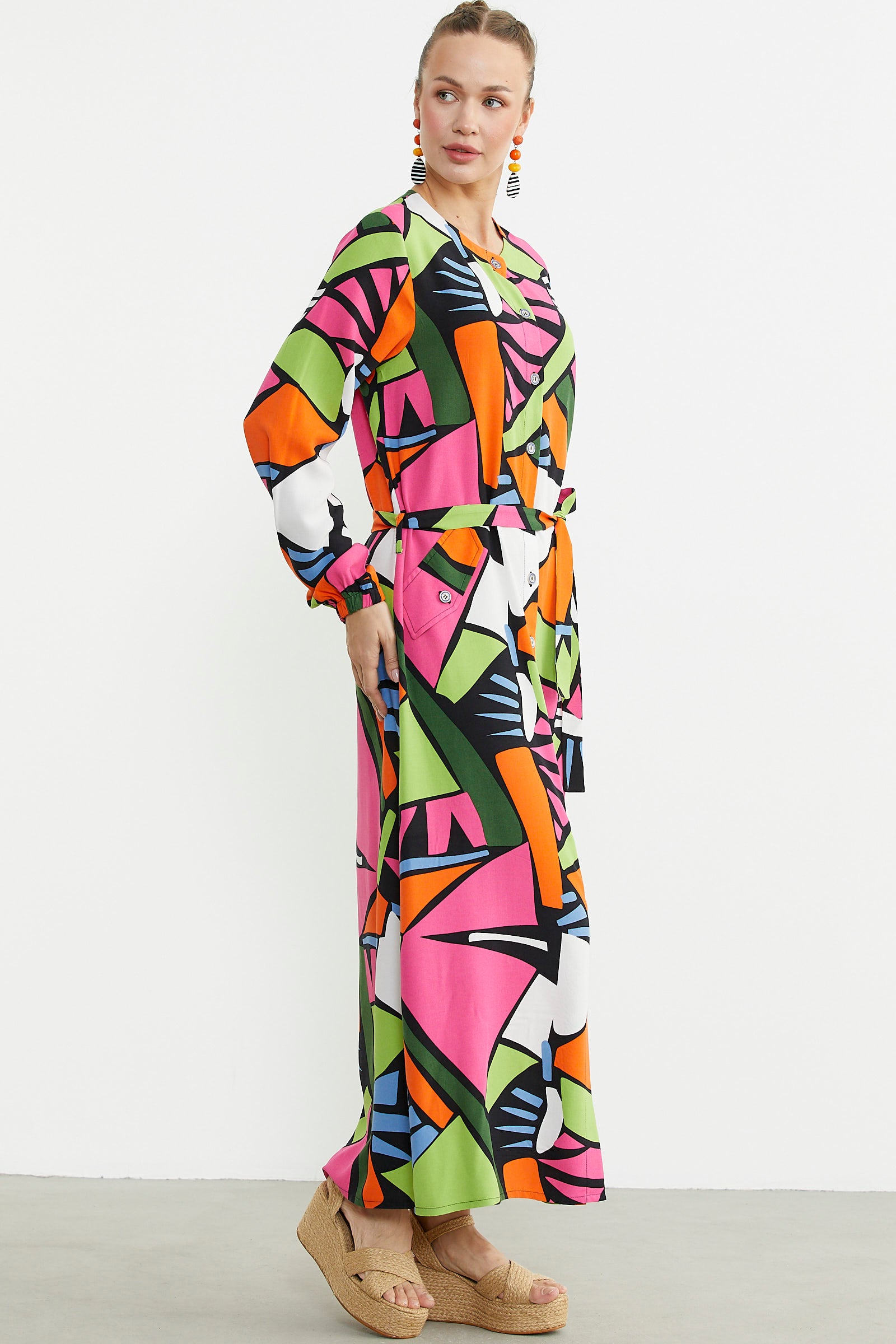 Büyük Beden Geometrik Desenli Uzun Elbise - Fuşya
