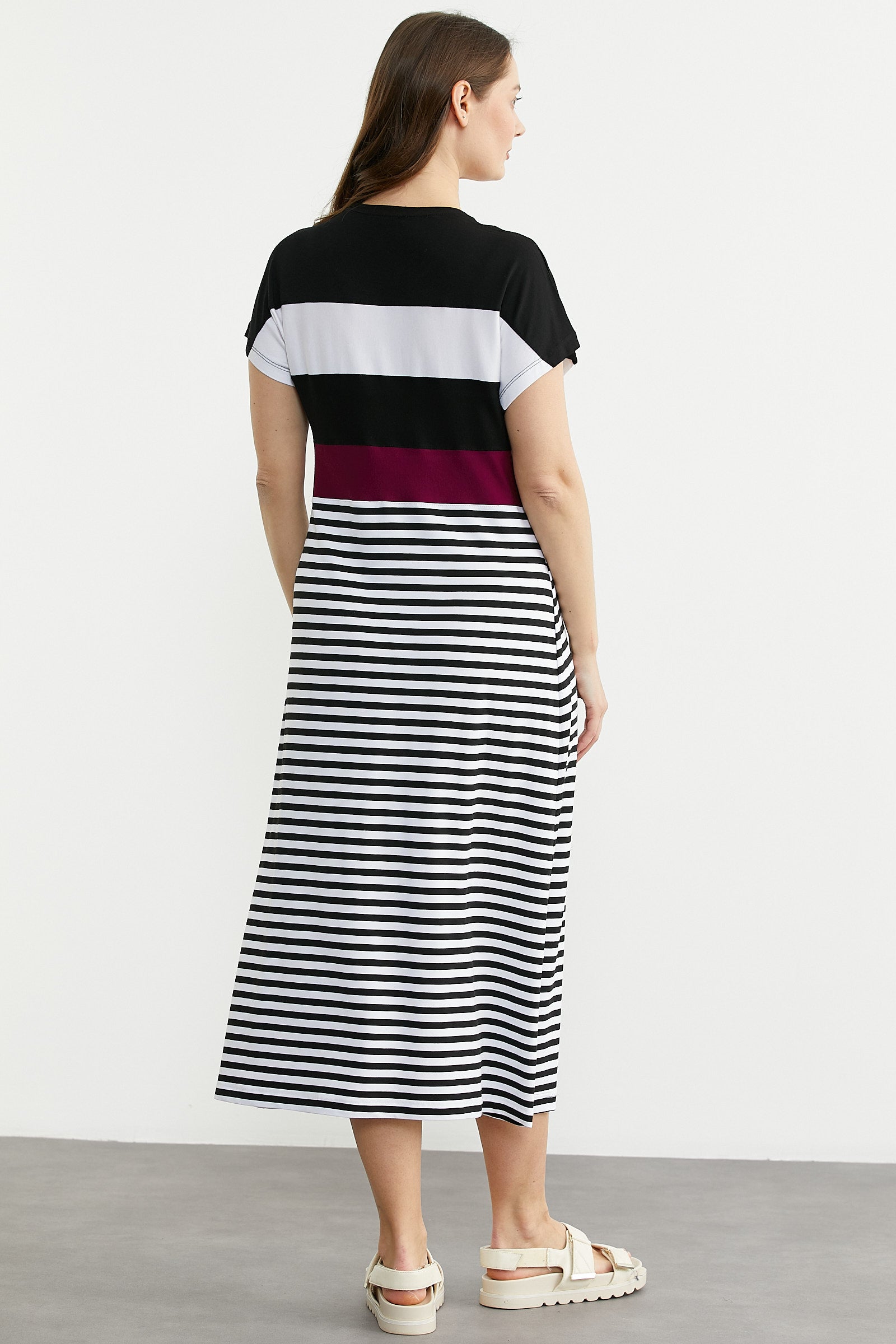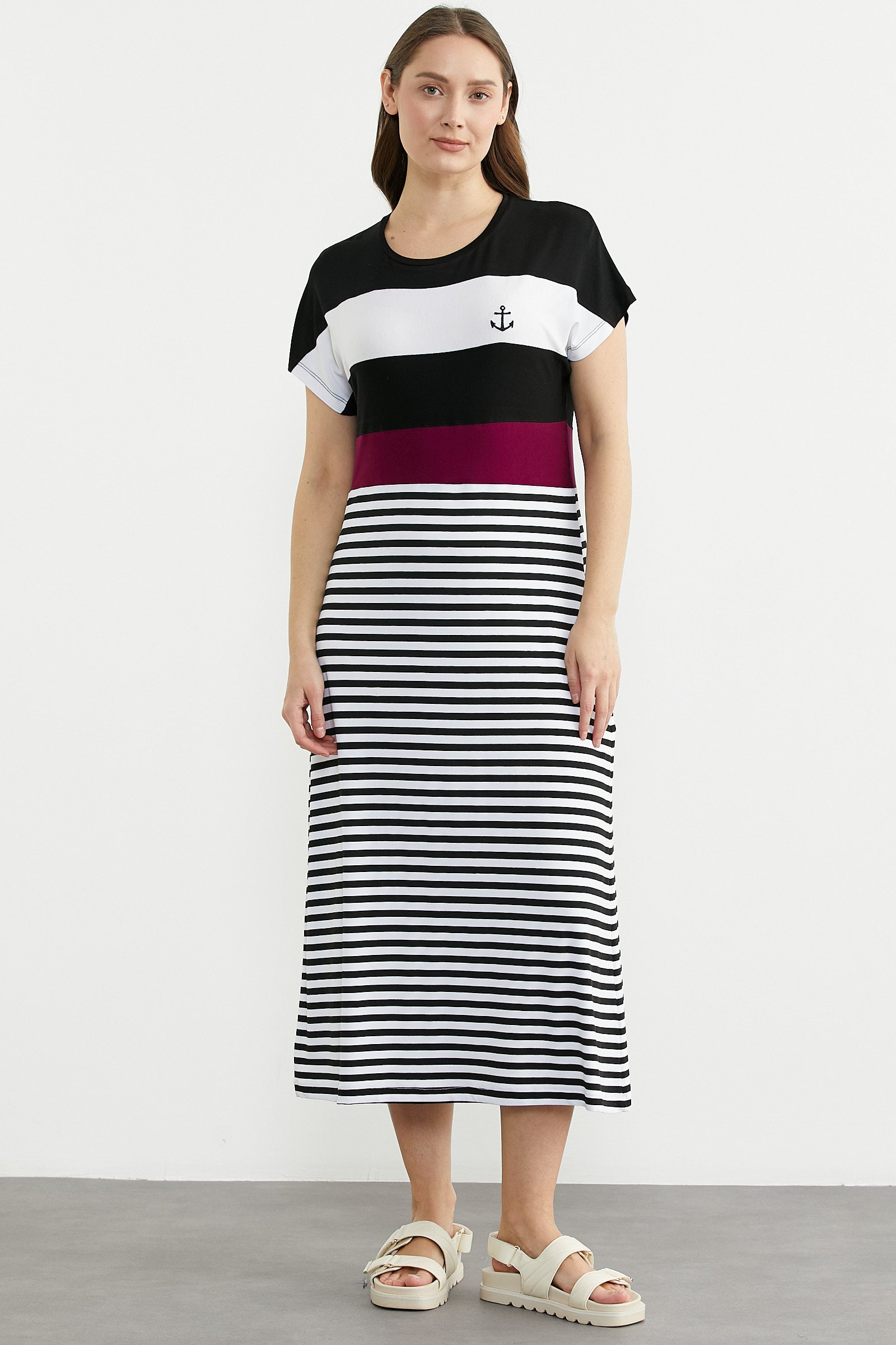 Viskoz penyeden üretilmiş, minimal çapa nakışlı, çizgili marine elbise. Düşük kol ve uzun boydur.