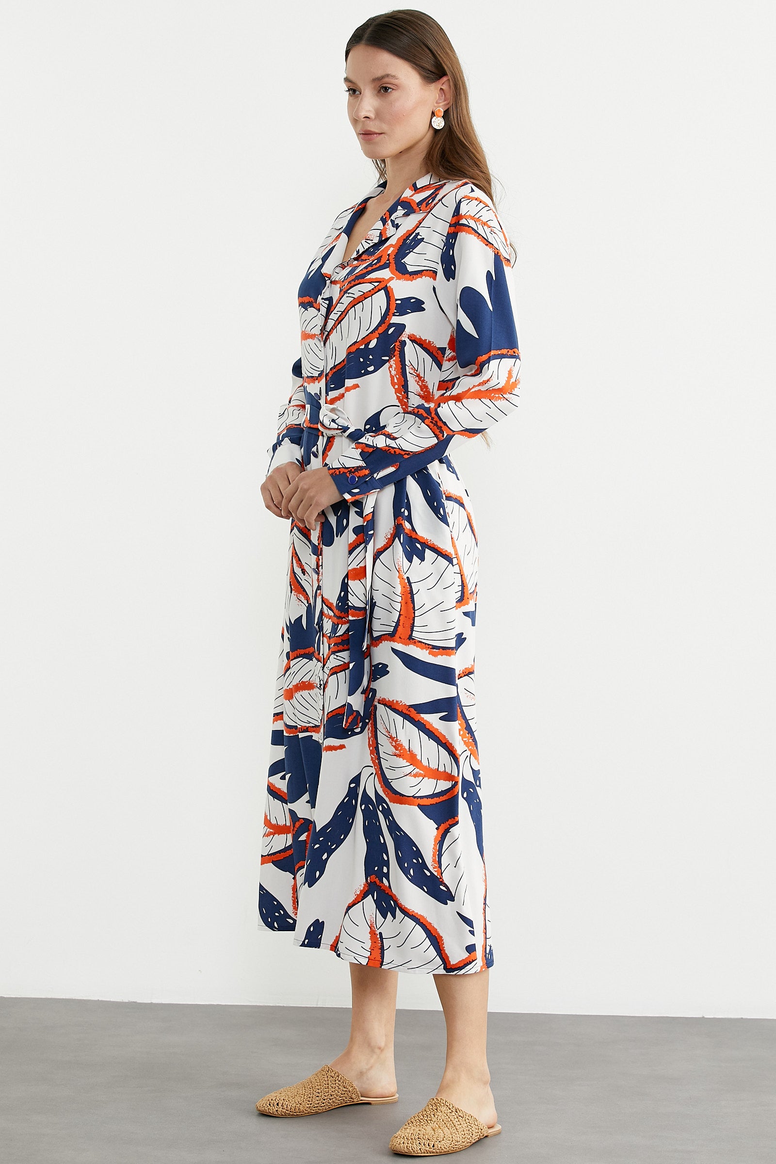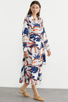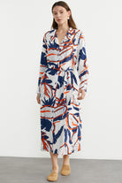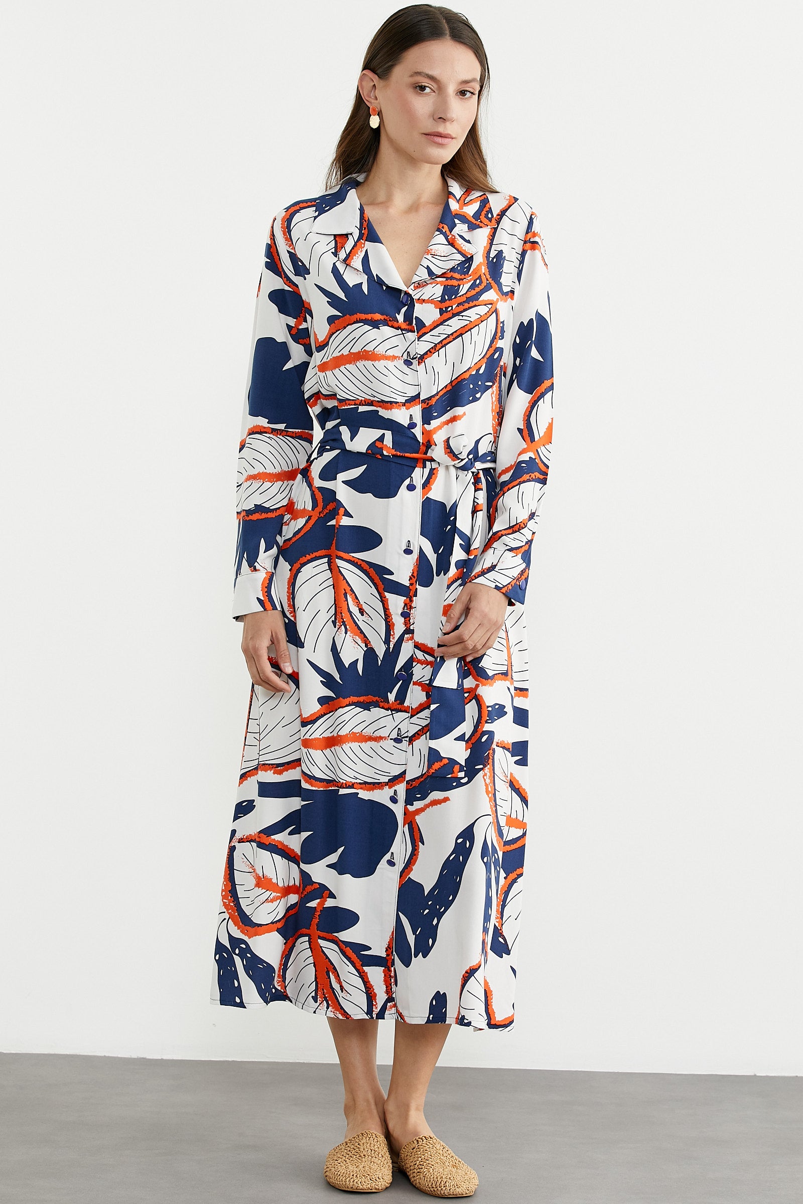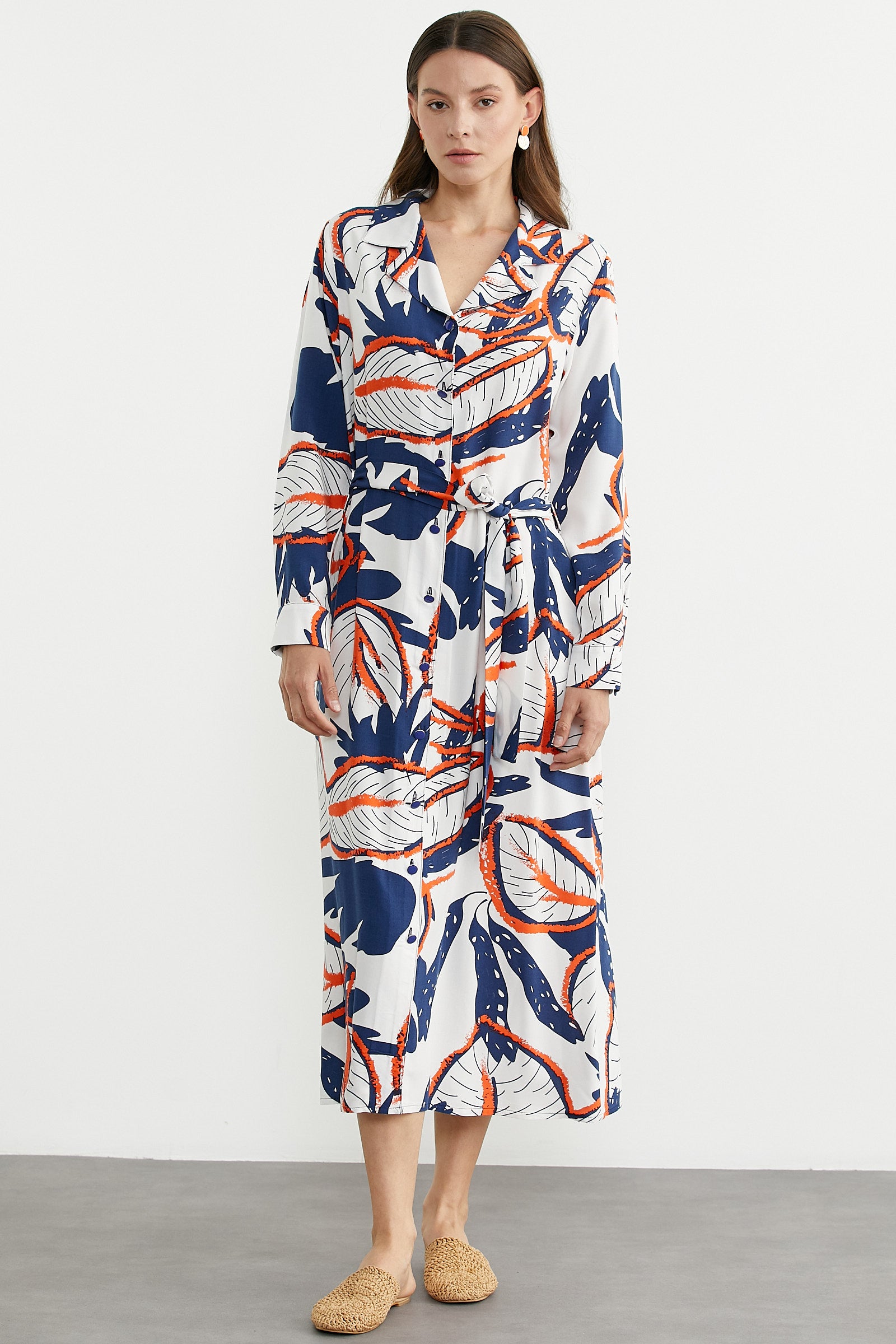 Yaprak desenli, yaz ruhunu yansıtan canlı renkli, kuşaklı, uzun kol, düğme kapamalı gömlek elbise.