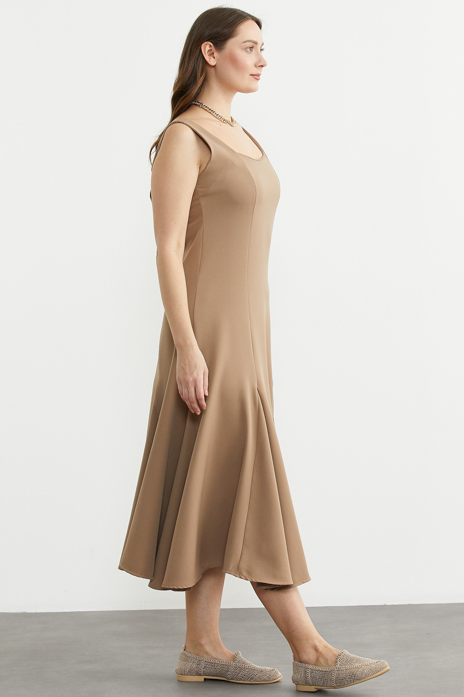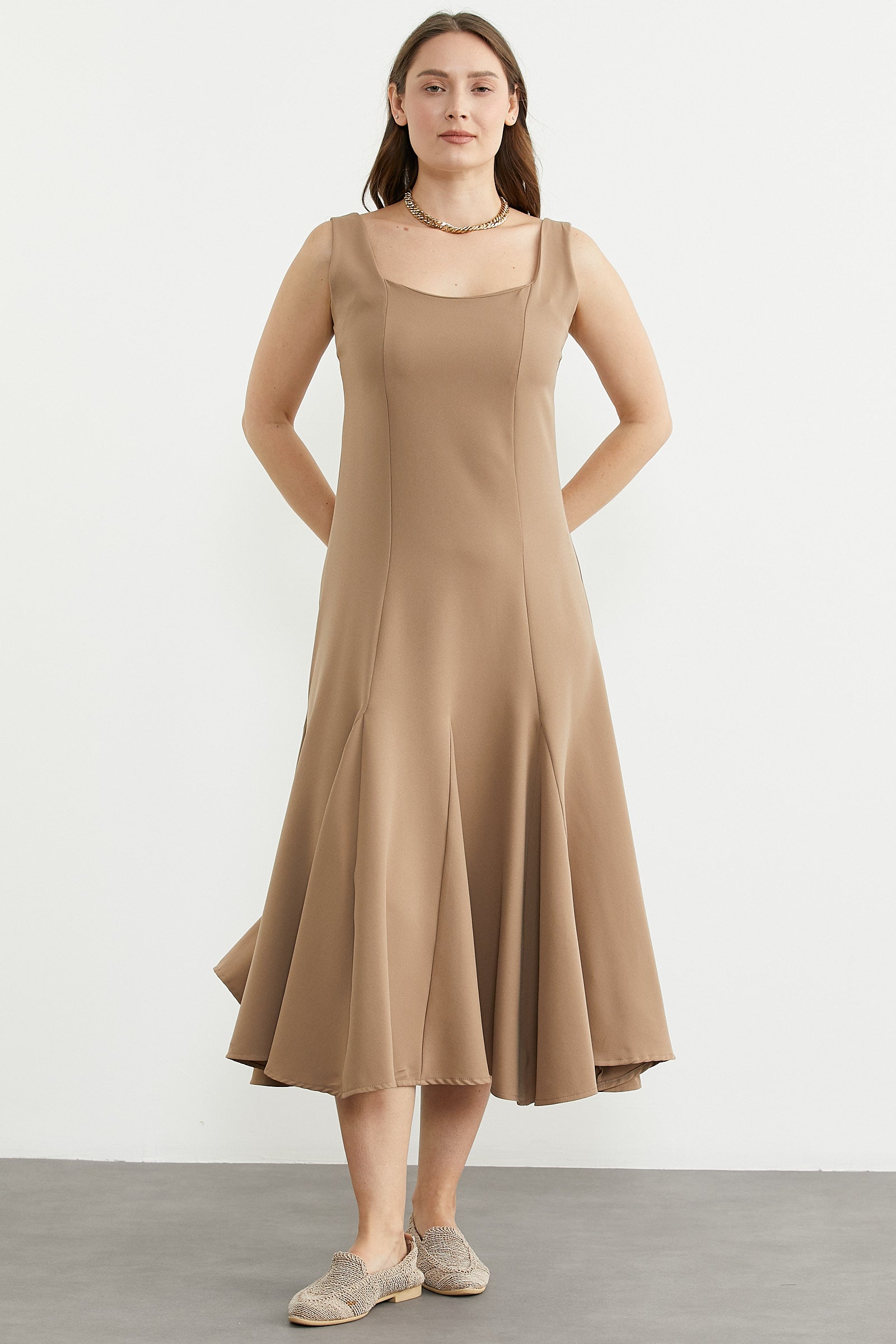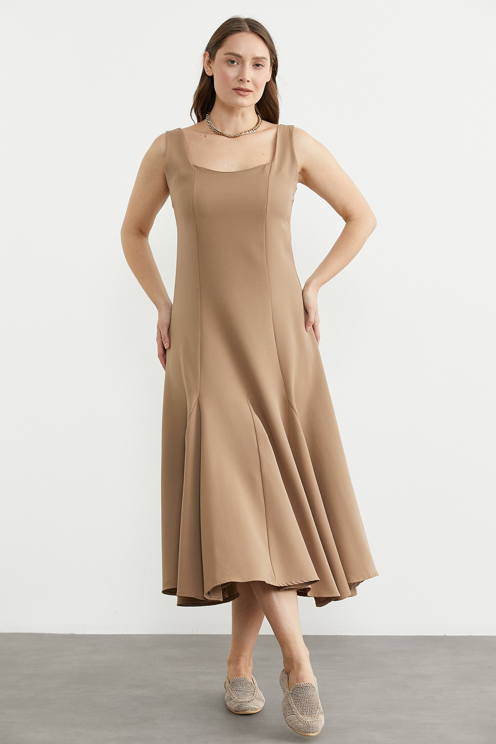 Kalın askılı, etek ucu parçalı midi boy elbise. Rahat kalıp ve çok fonksiyonlu kullanım sağlar.