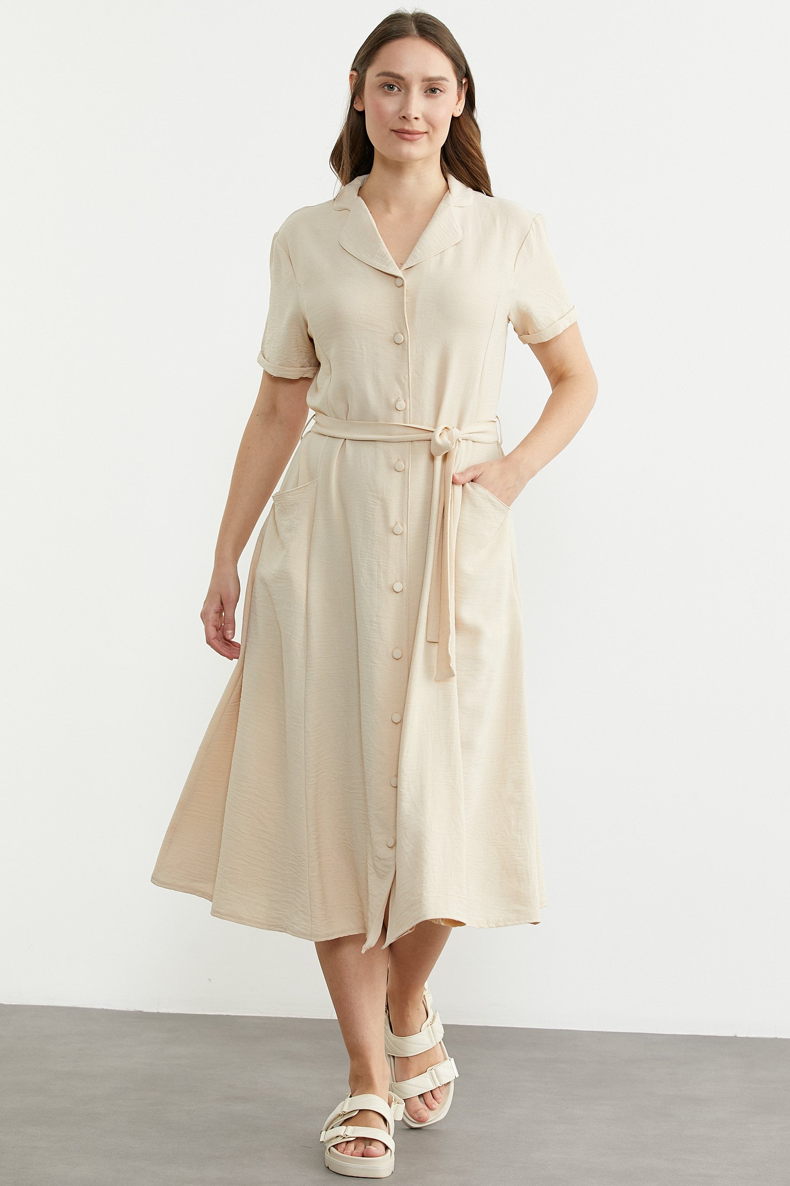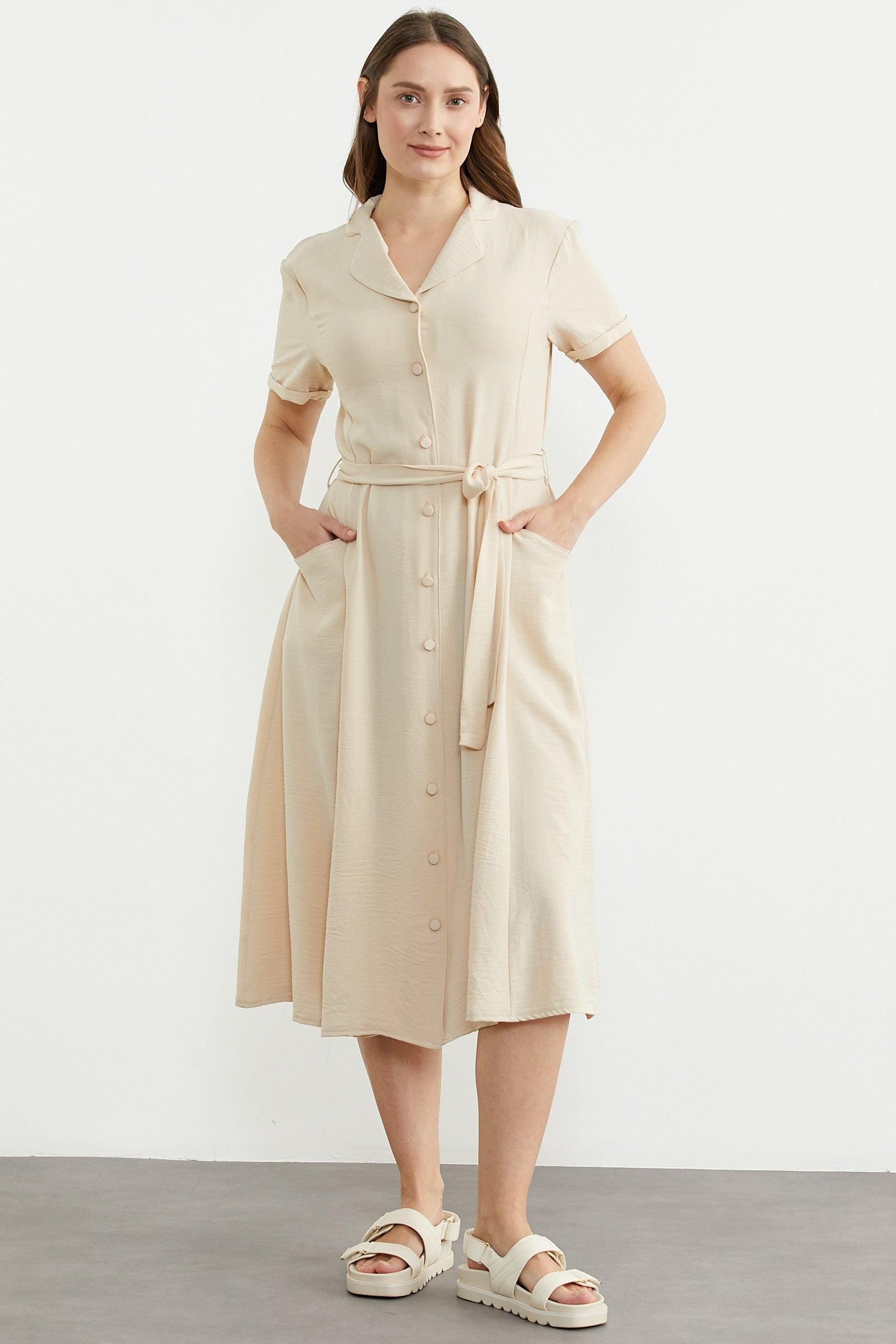 Çıkarılabilir kuşaklı gömlek model elbise midi boydur. Viskoz dokuma kumaştan üretilmiştir. Rahat kalıp, düğme kapamalıdır.