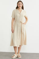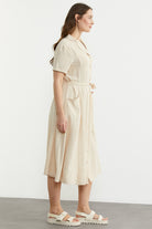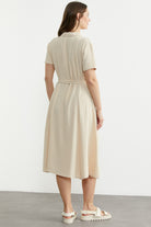 Keten Görünümlü Cepli Gömlek Elbise - Taş