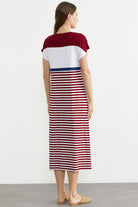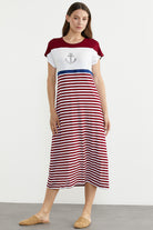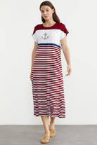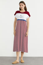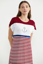 Marine Çizigili Nakışlı Penye Elbise - Bordo