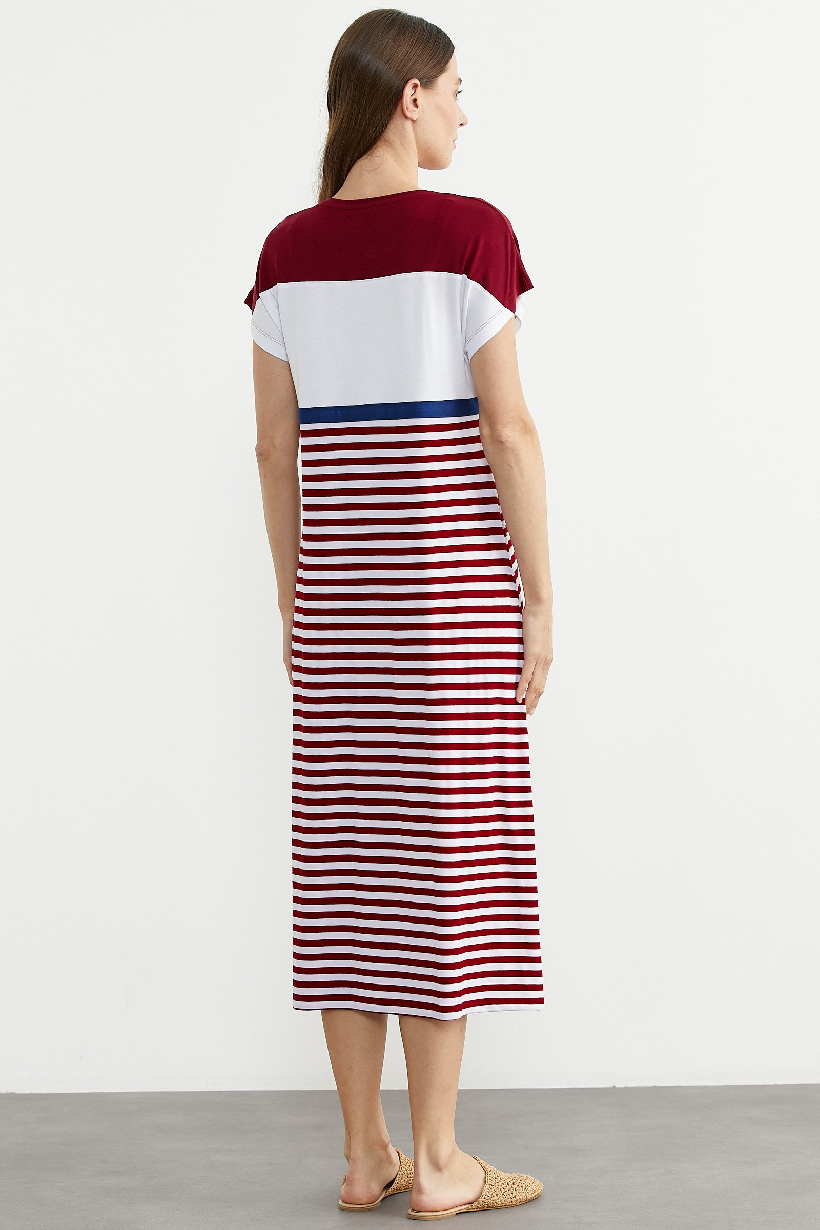 Renk çizgili, çapa nakışlı rahat kesim marine elbise. Düşük kol ve uzun boydur.