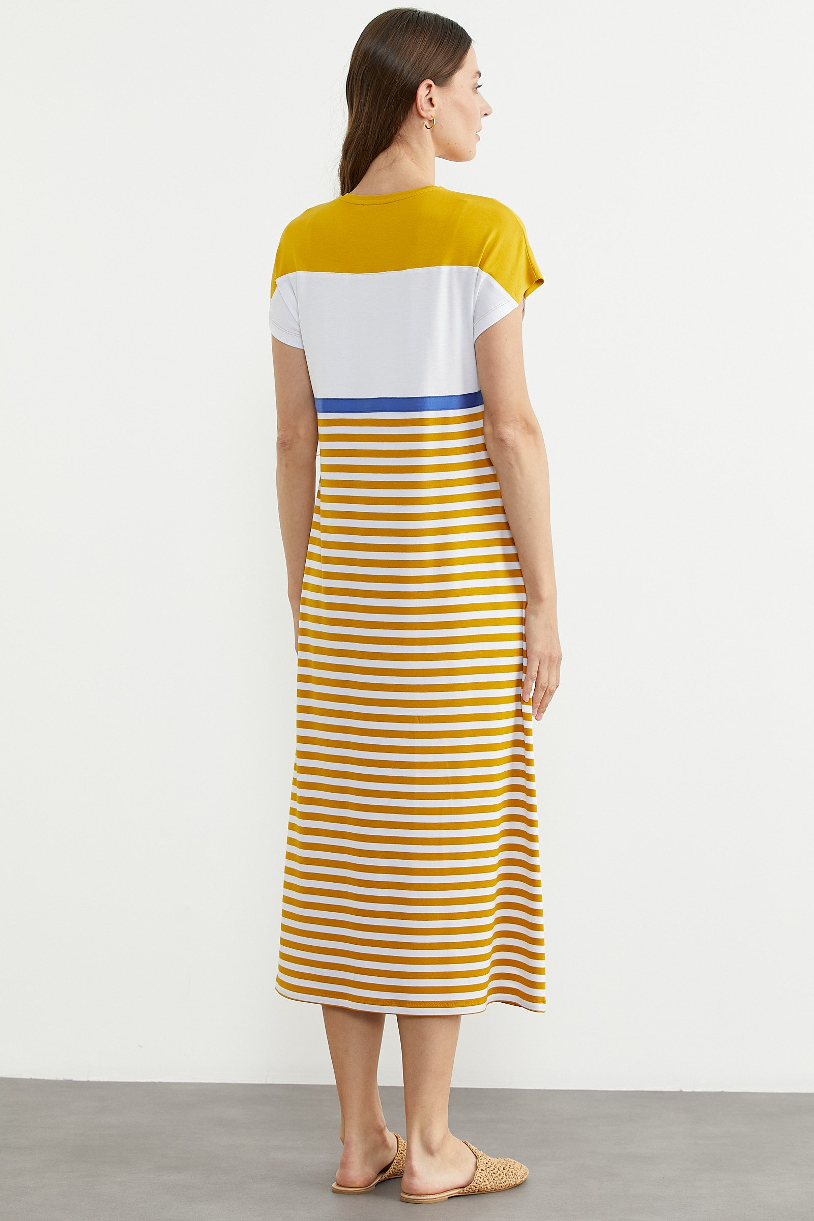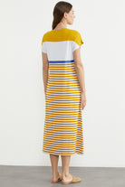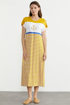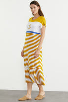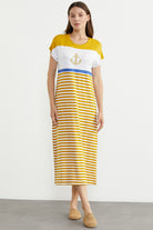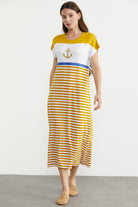 Marine Çizigili Nakışlı Penye Elbise - Hardal