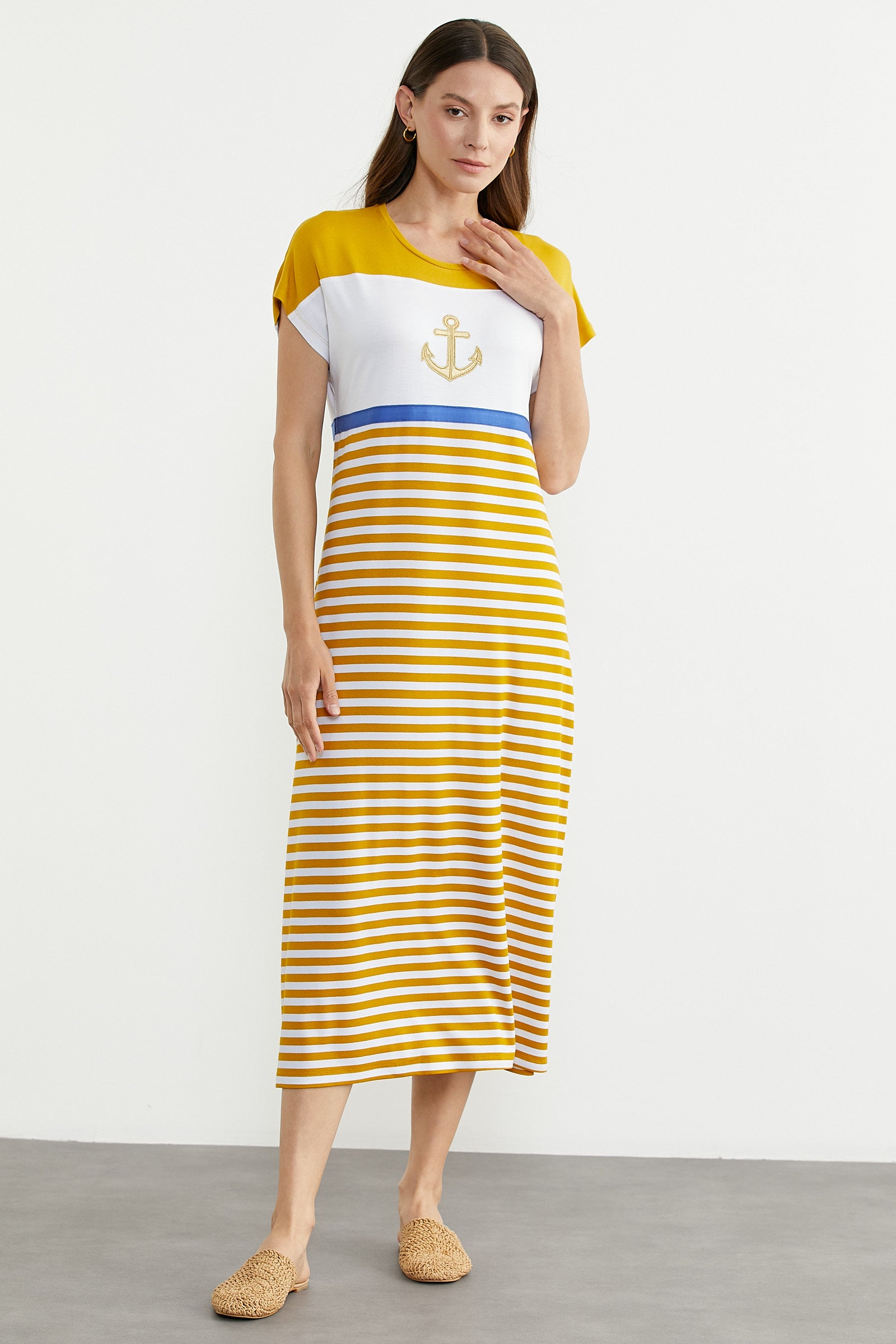 Renk çizgili, çapa nakışlı rahat kesim marine elbise. Düşük kol ve uzun boydur.