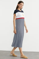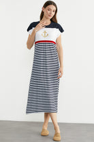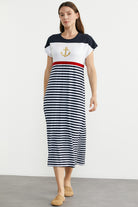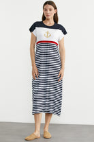 Renk çizgili, çapa nakışlı rahat kesim marine elbise. Düşük kol ve uzun boydur.