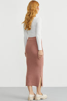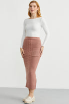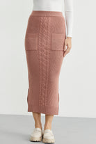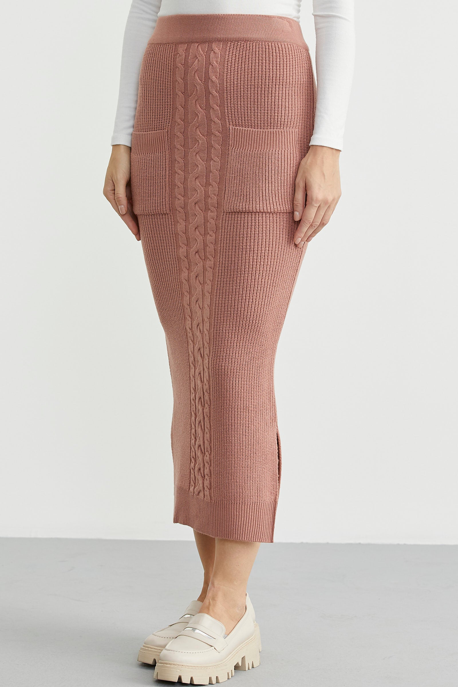 Kalın, beli gizli lastikli, yanı ufak yırtmaçlı triko kalem etek. Desenli ve cep detaylı.