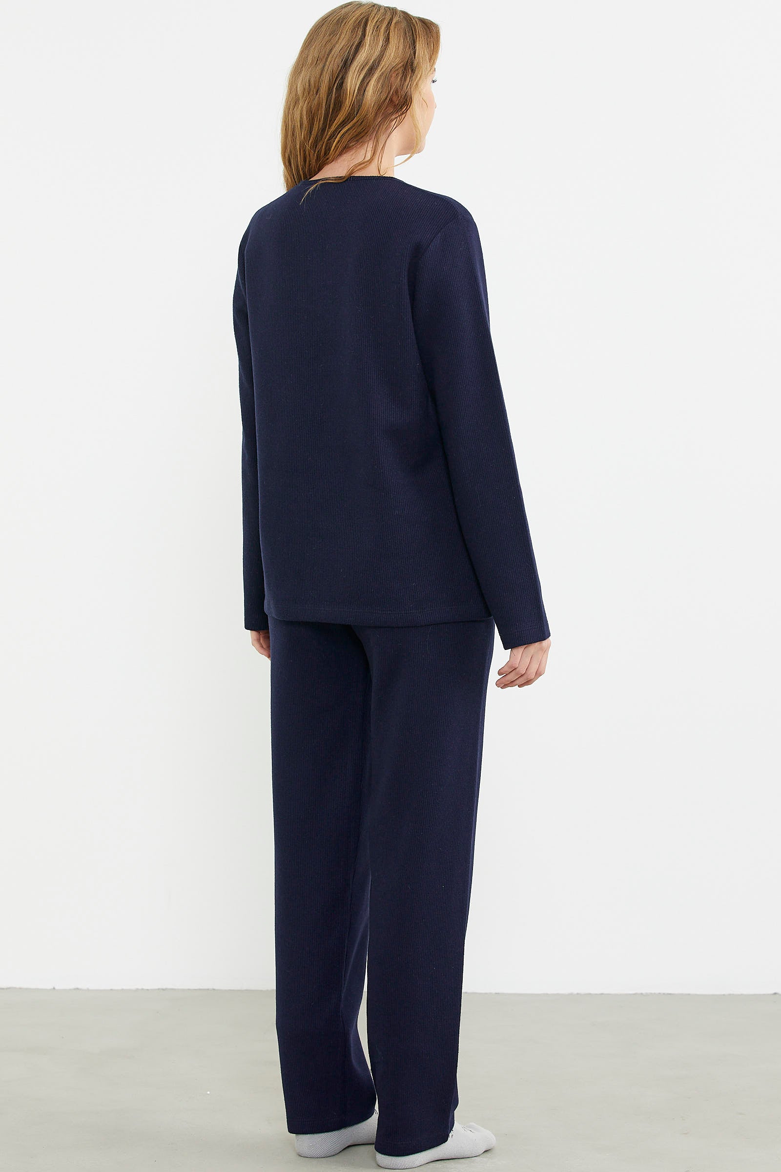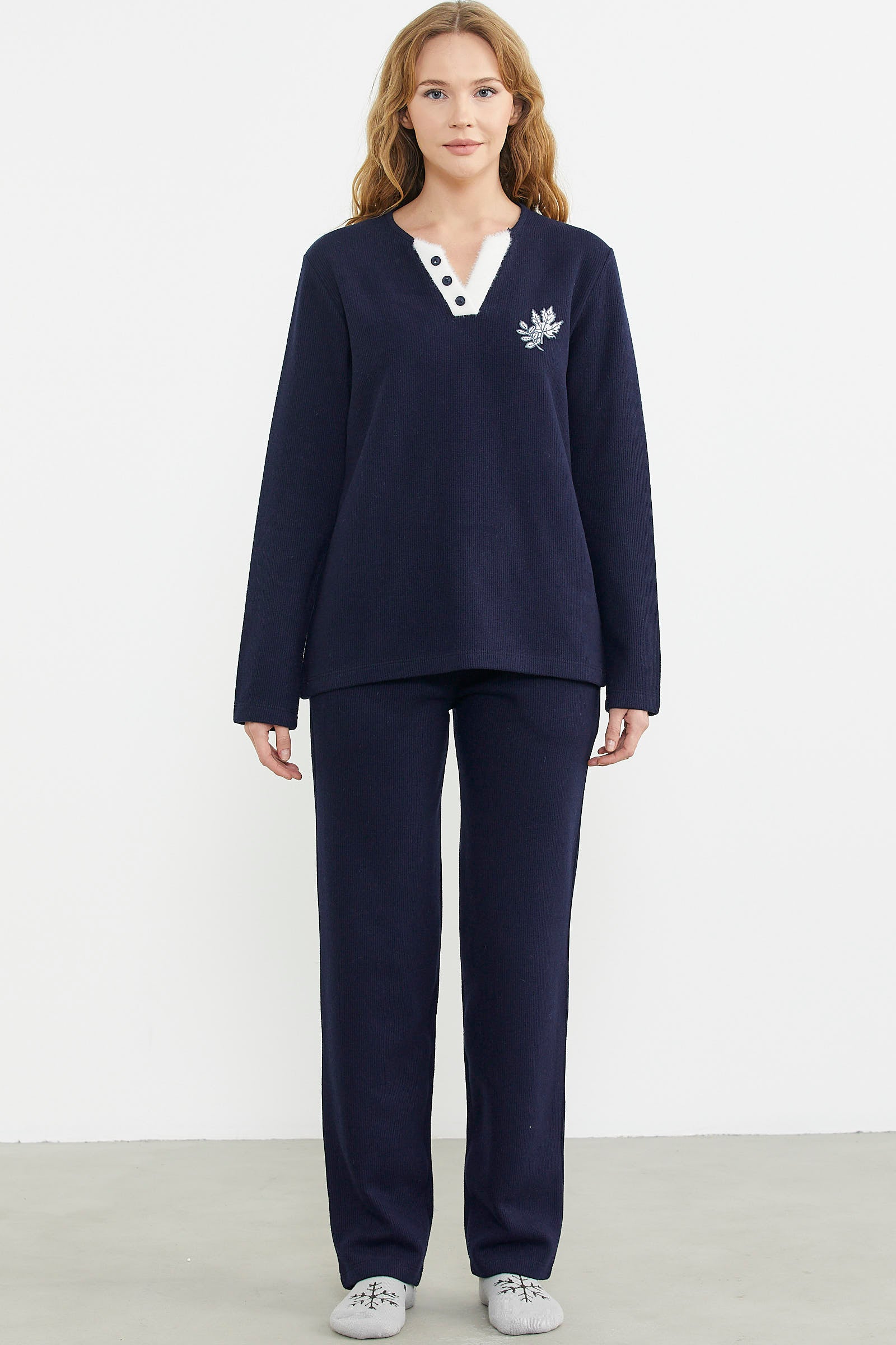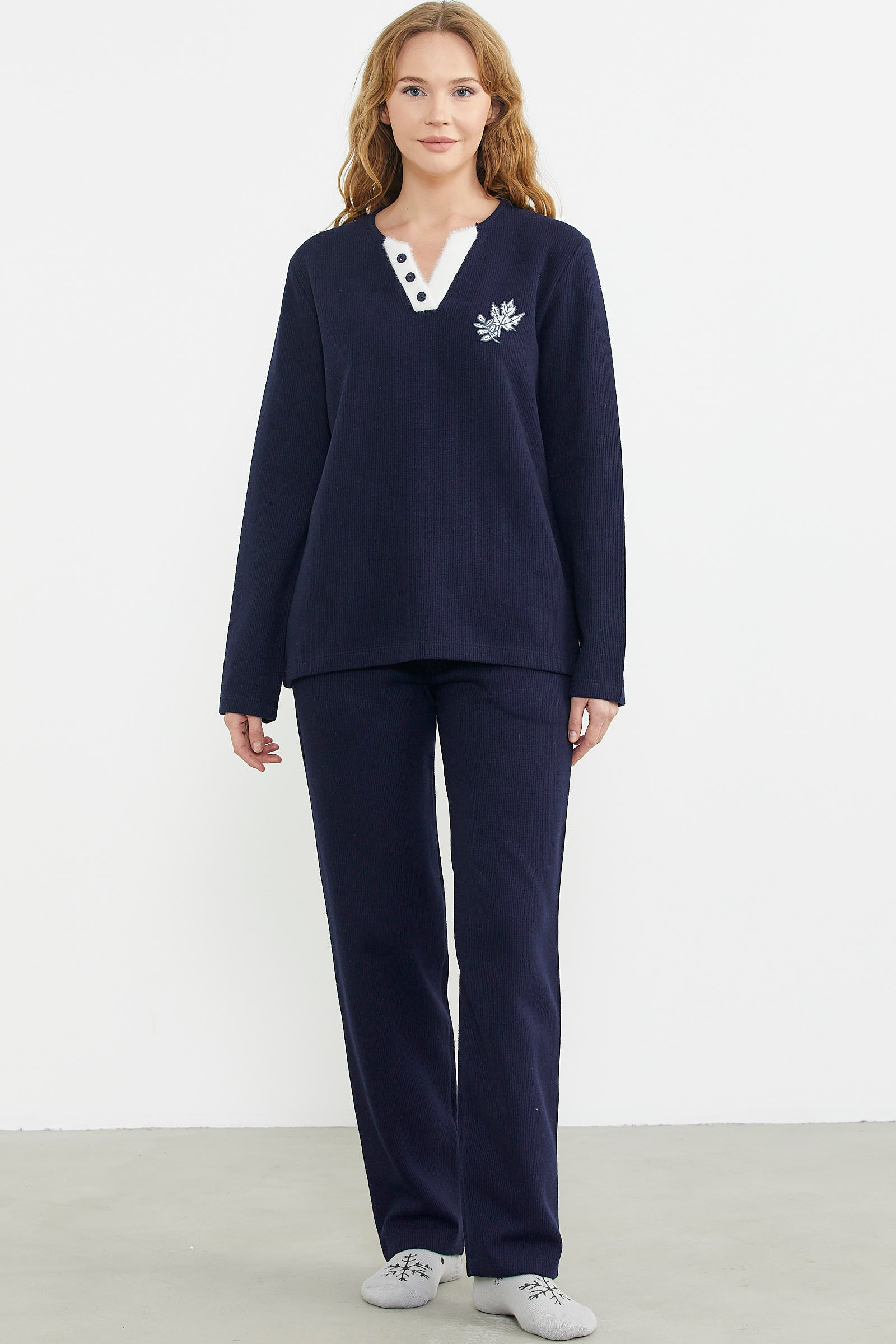 Yaka detaylı pijama takımı kalın ve tok özel kumaştan üretilmiştir.Uyku konforunuzu arttıracak pijama takımı rahat kalıptır.
