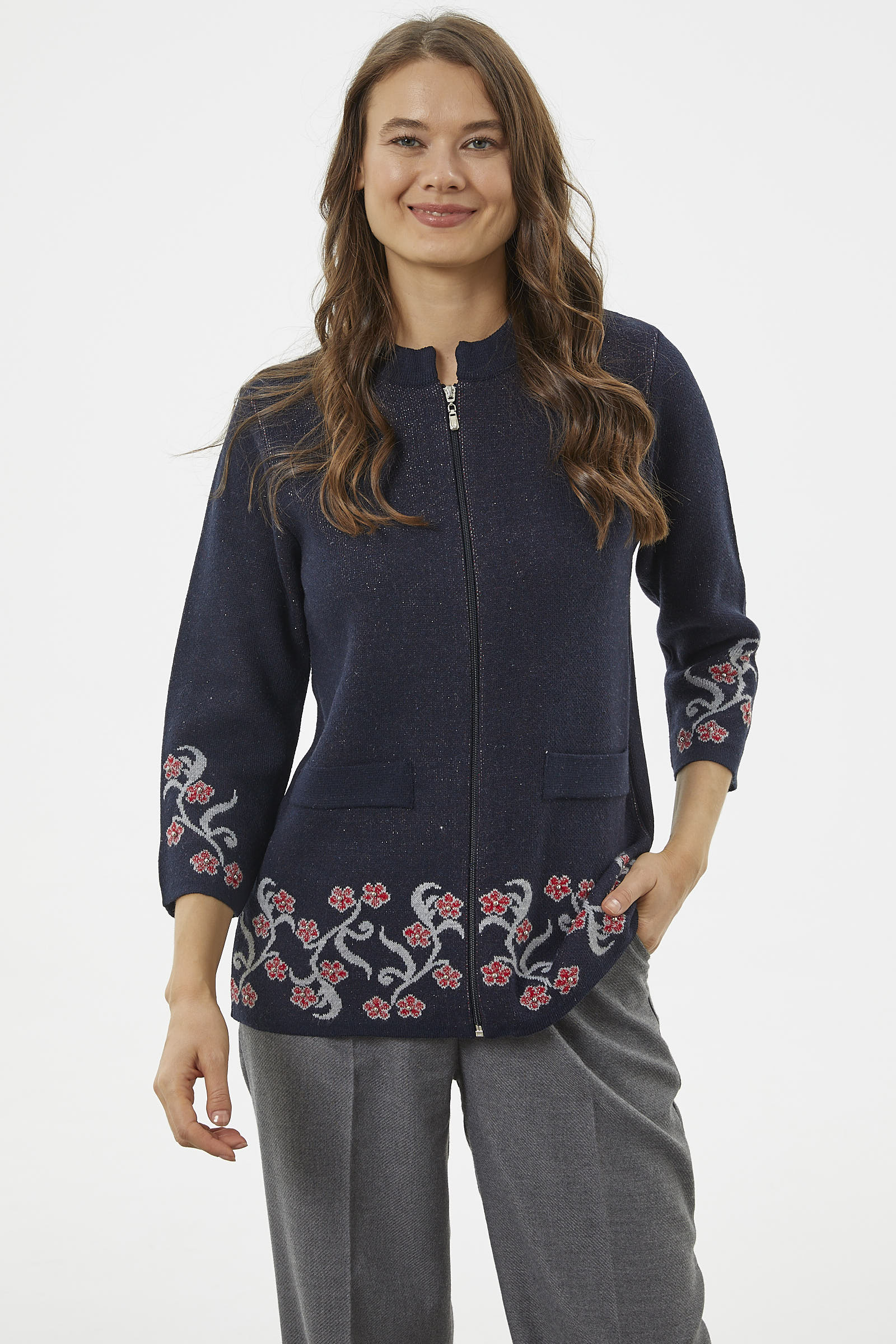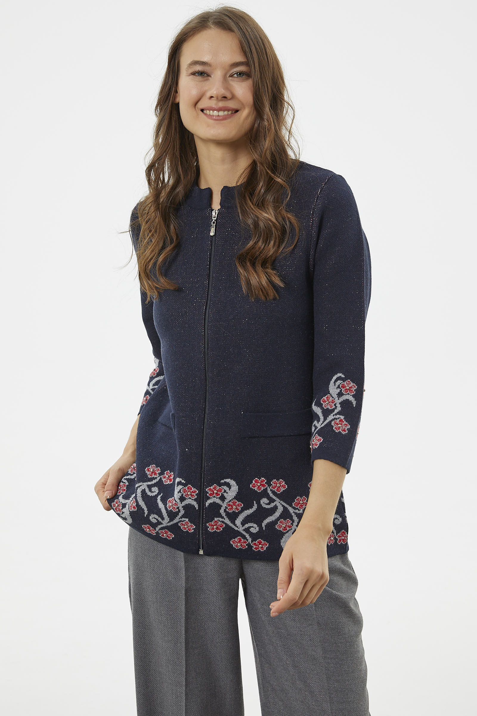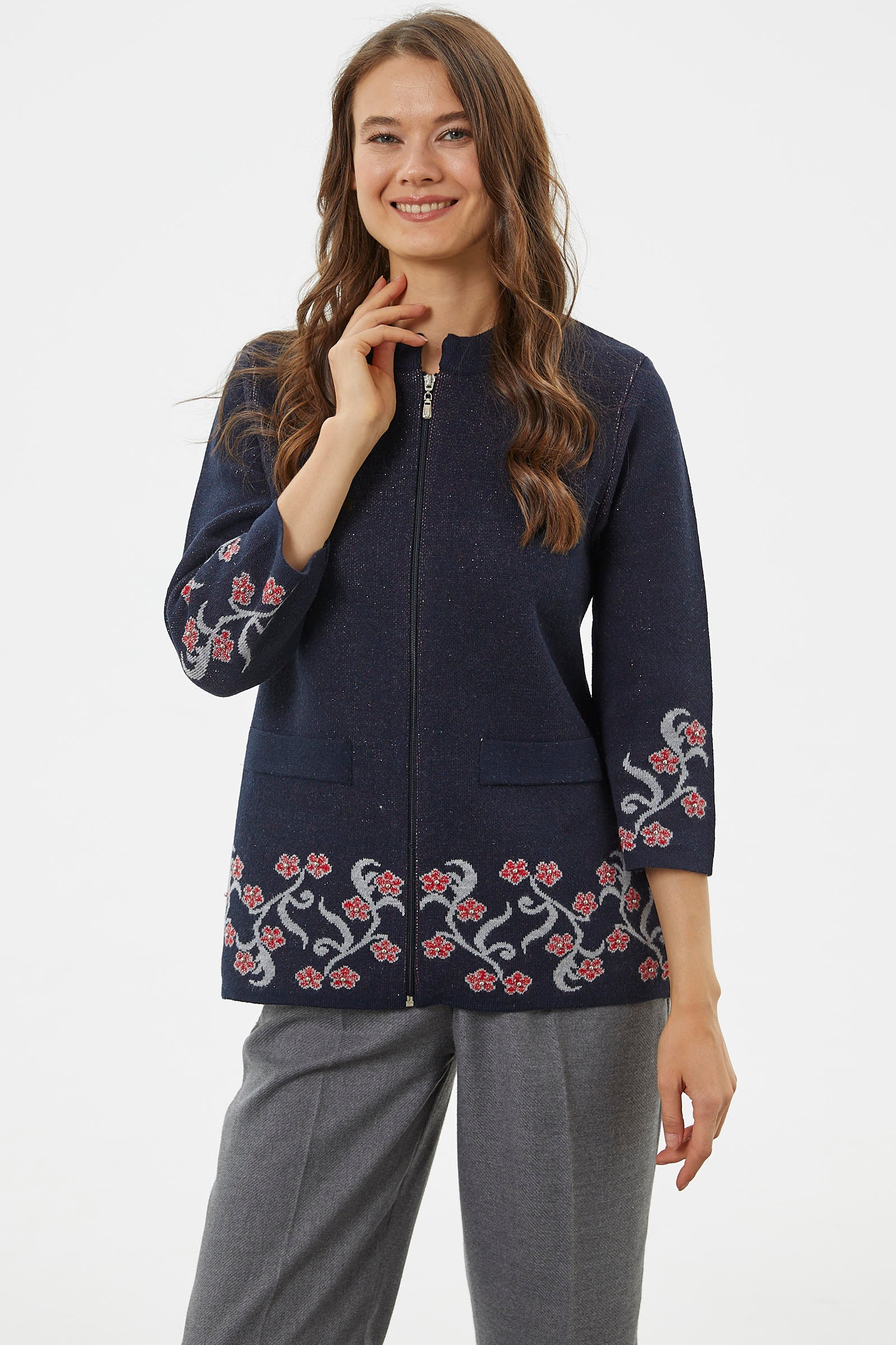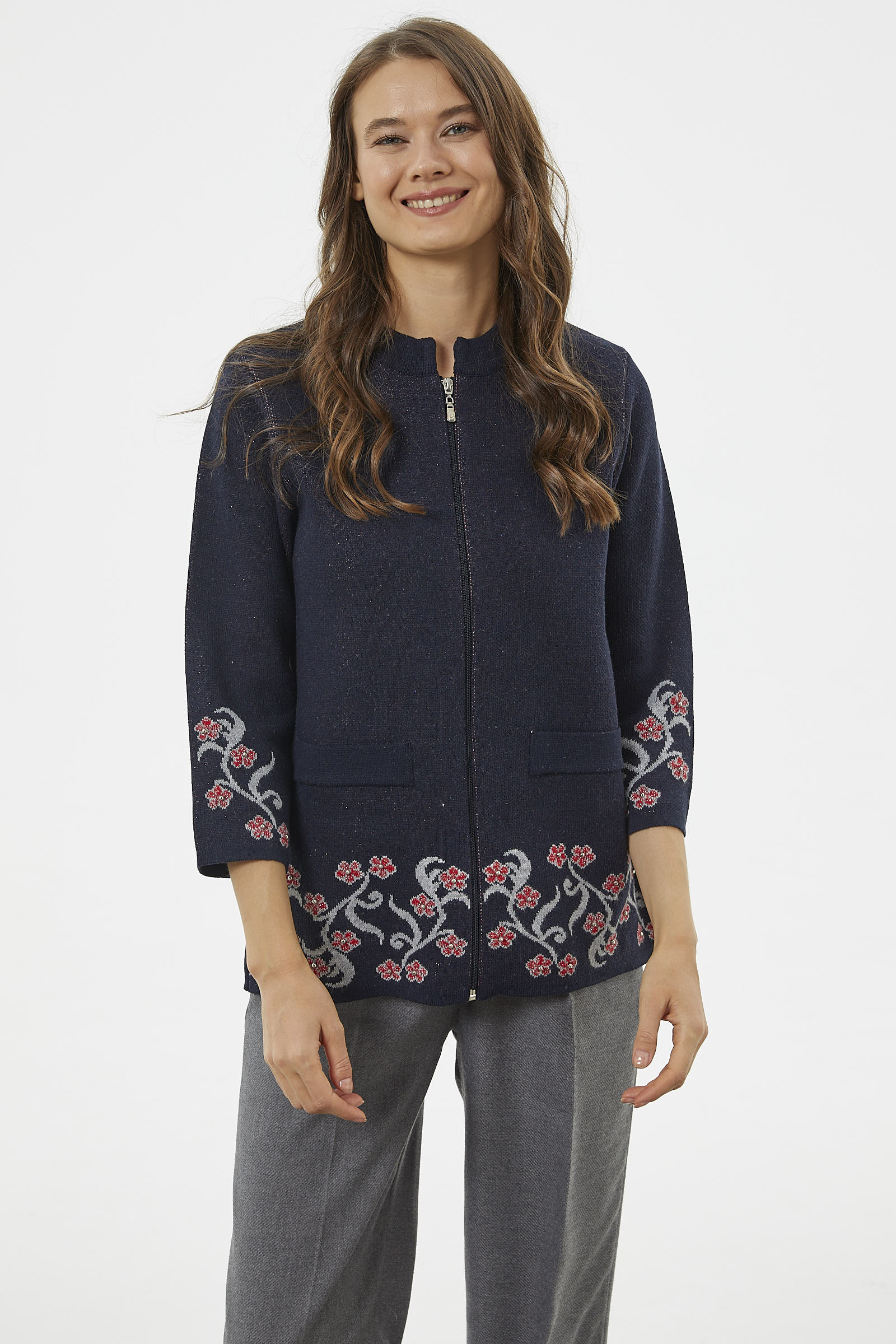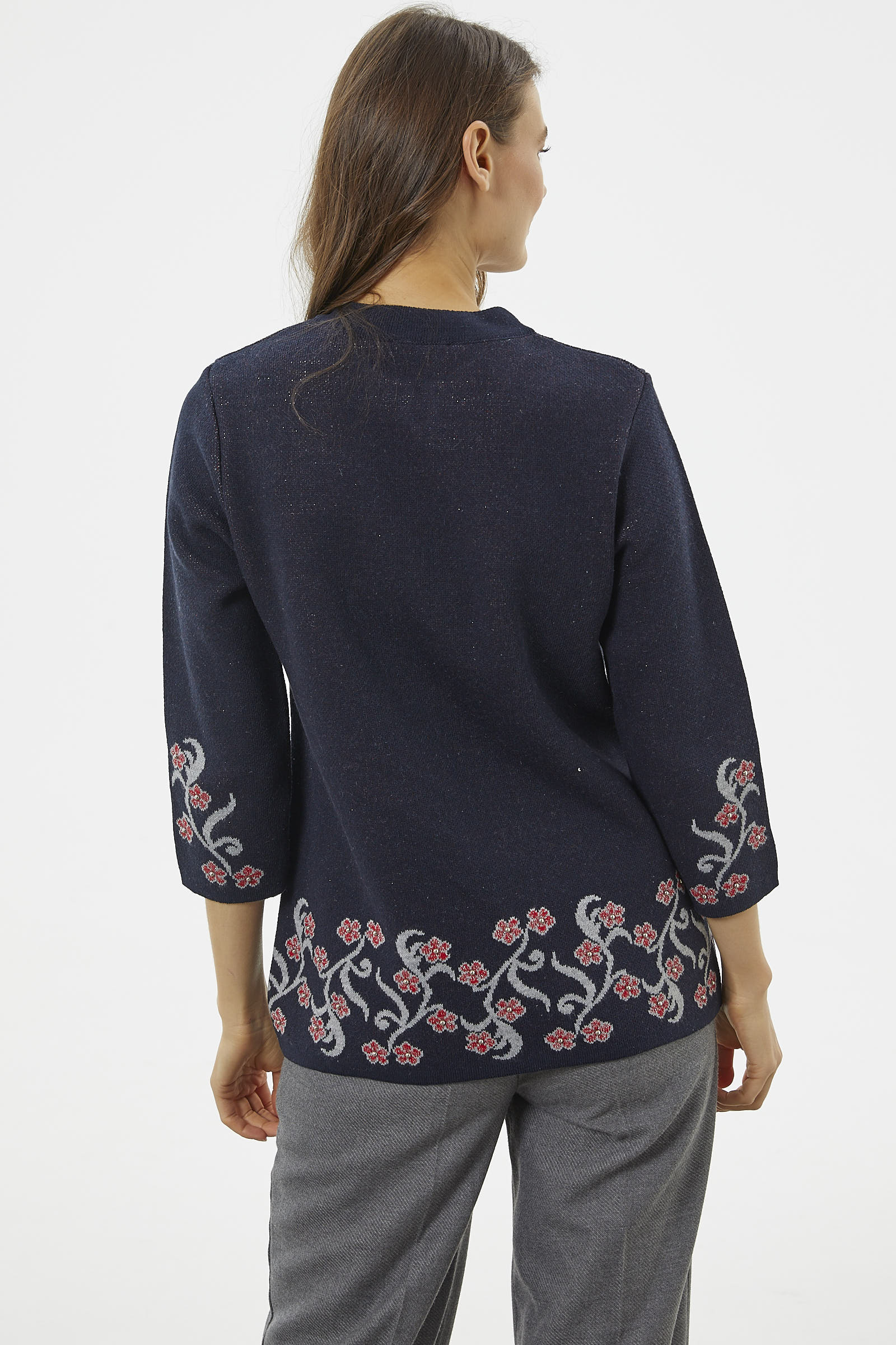 Çiçek Desen Detaylı Yünlü Triko Hırka - Lacivert