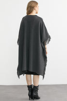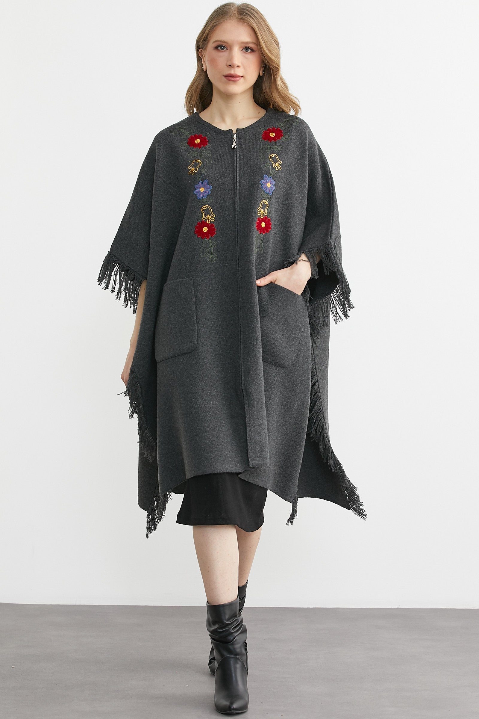Çiçek Nakışlı Yünlü Triko Panço - Koyu Gri