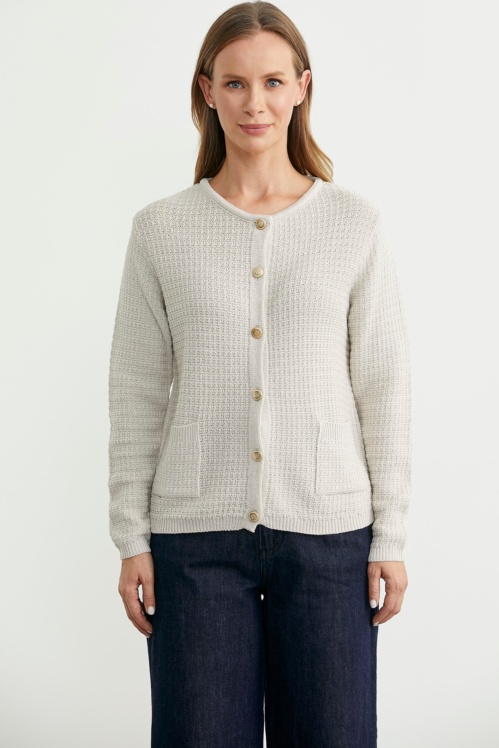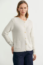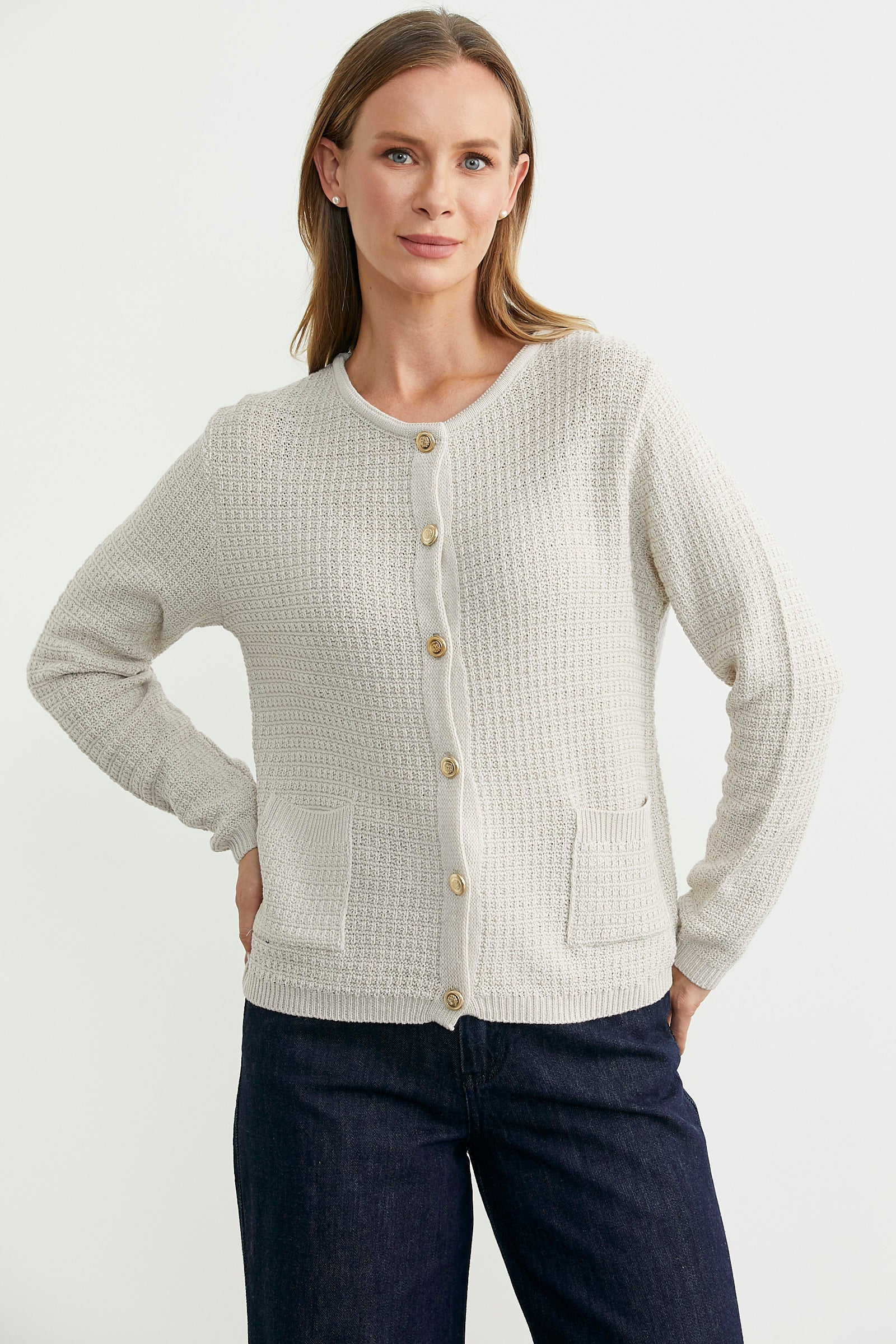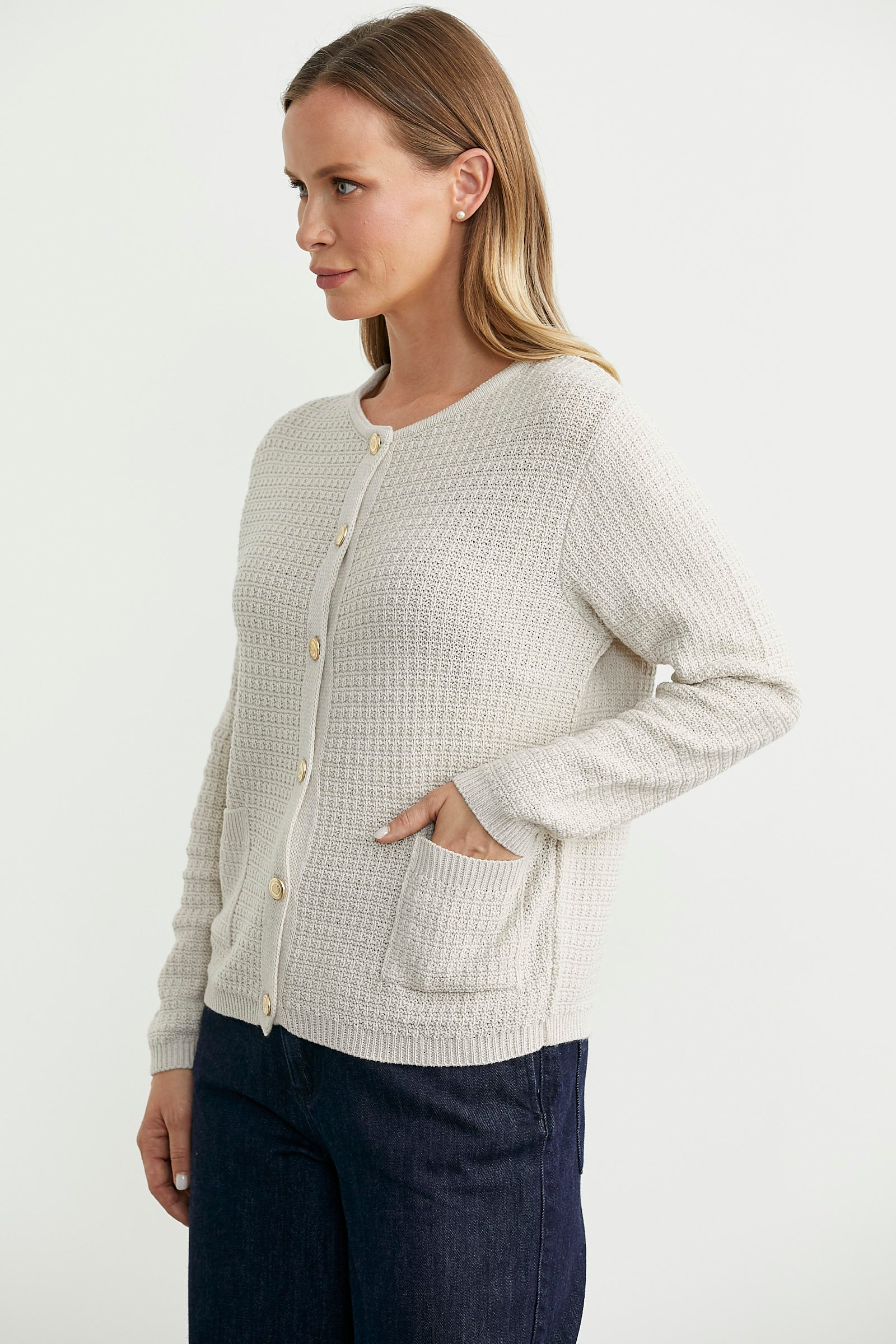 Yumuşak dokulu, yuvarlak yakalı, önü düğmeli kısa triko hırka. Yama cepli, düşük omuzlu, uzun kollu.