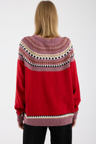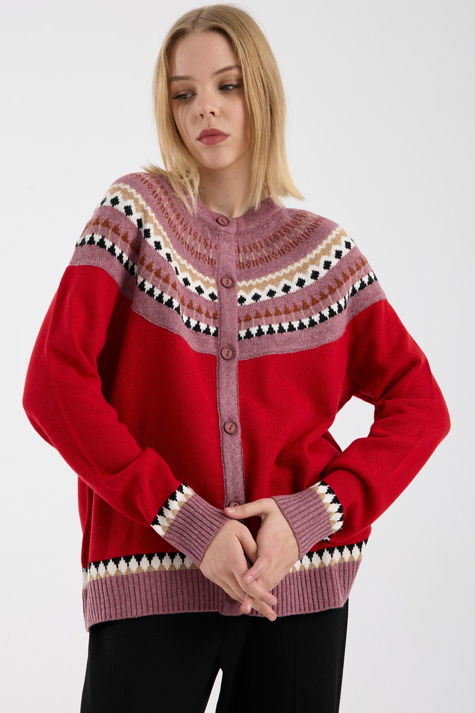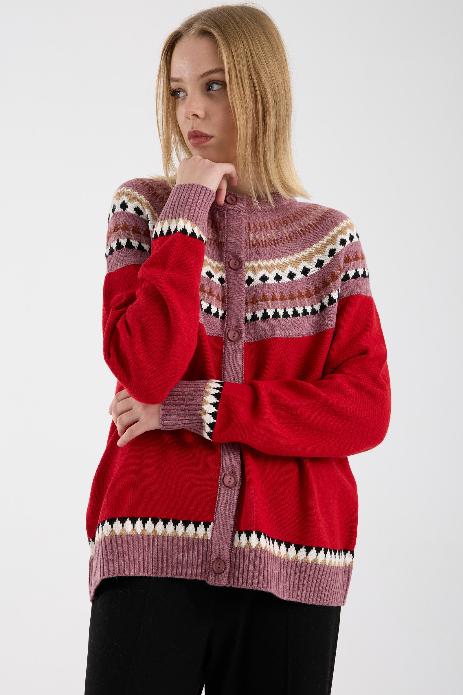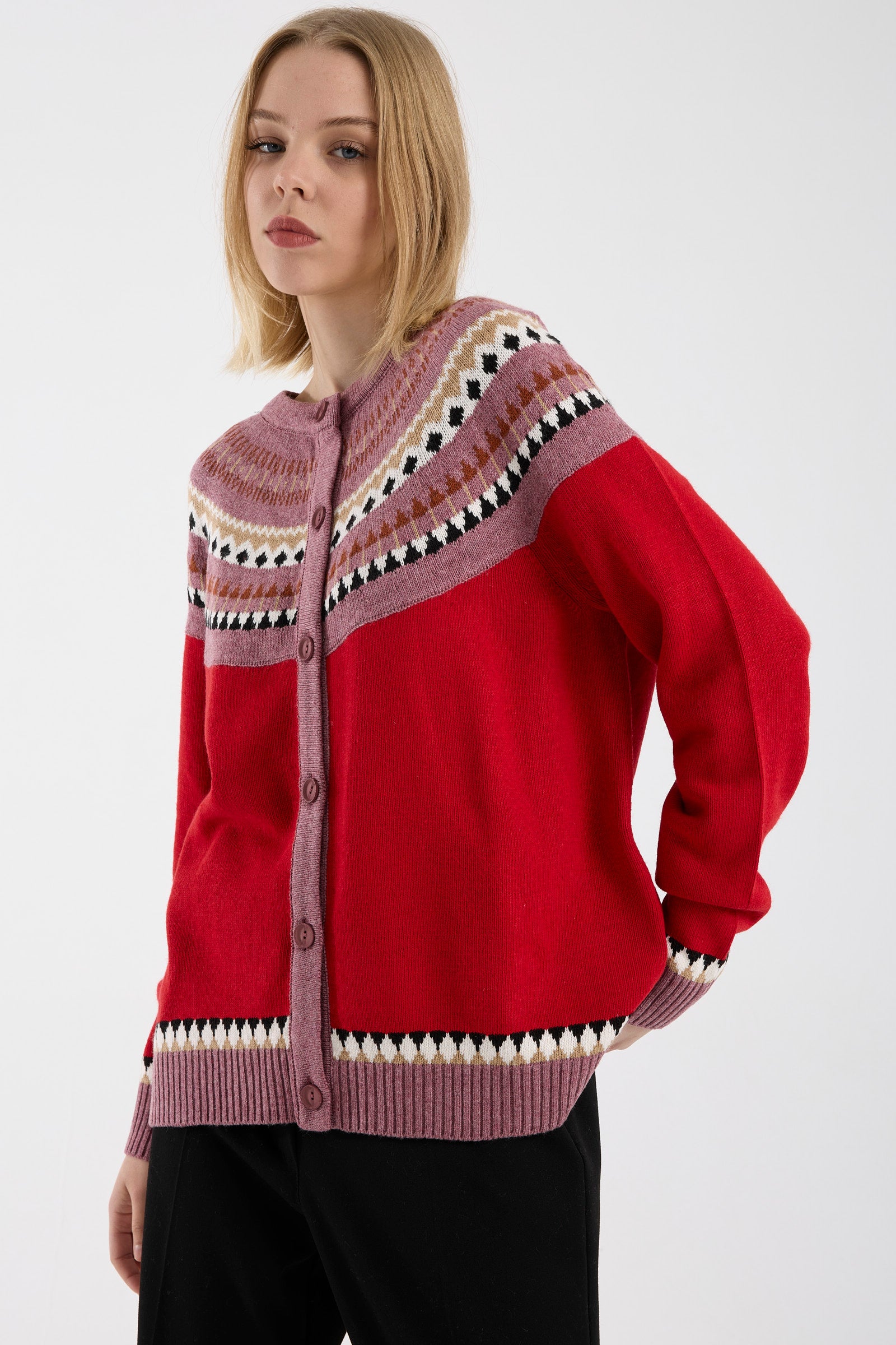 Etnik Motifli Yünlü Triko Hırka - Kırmızı