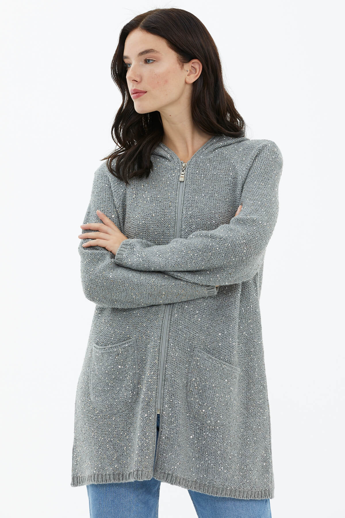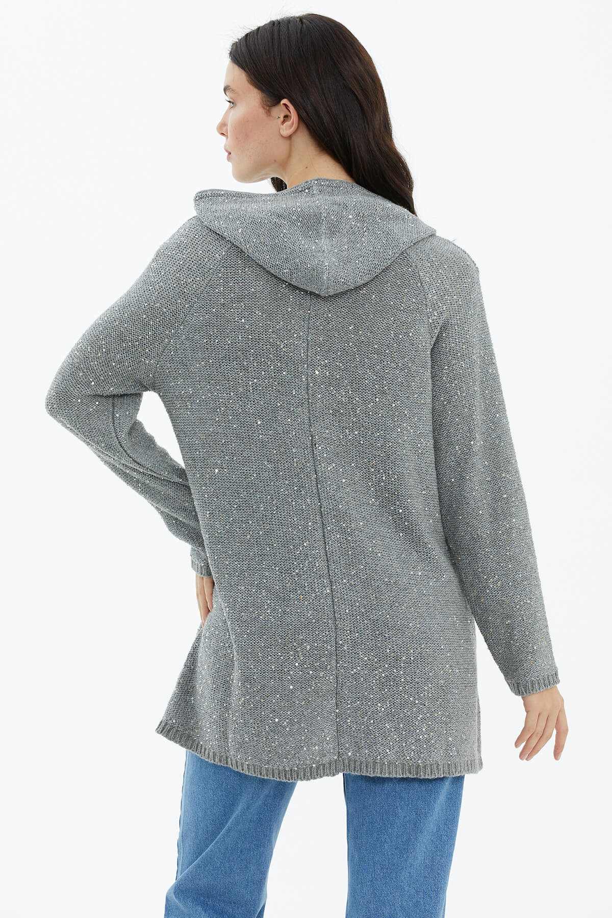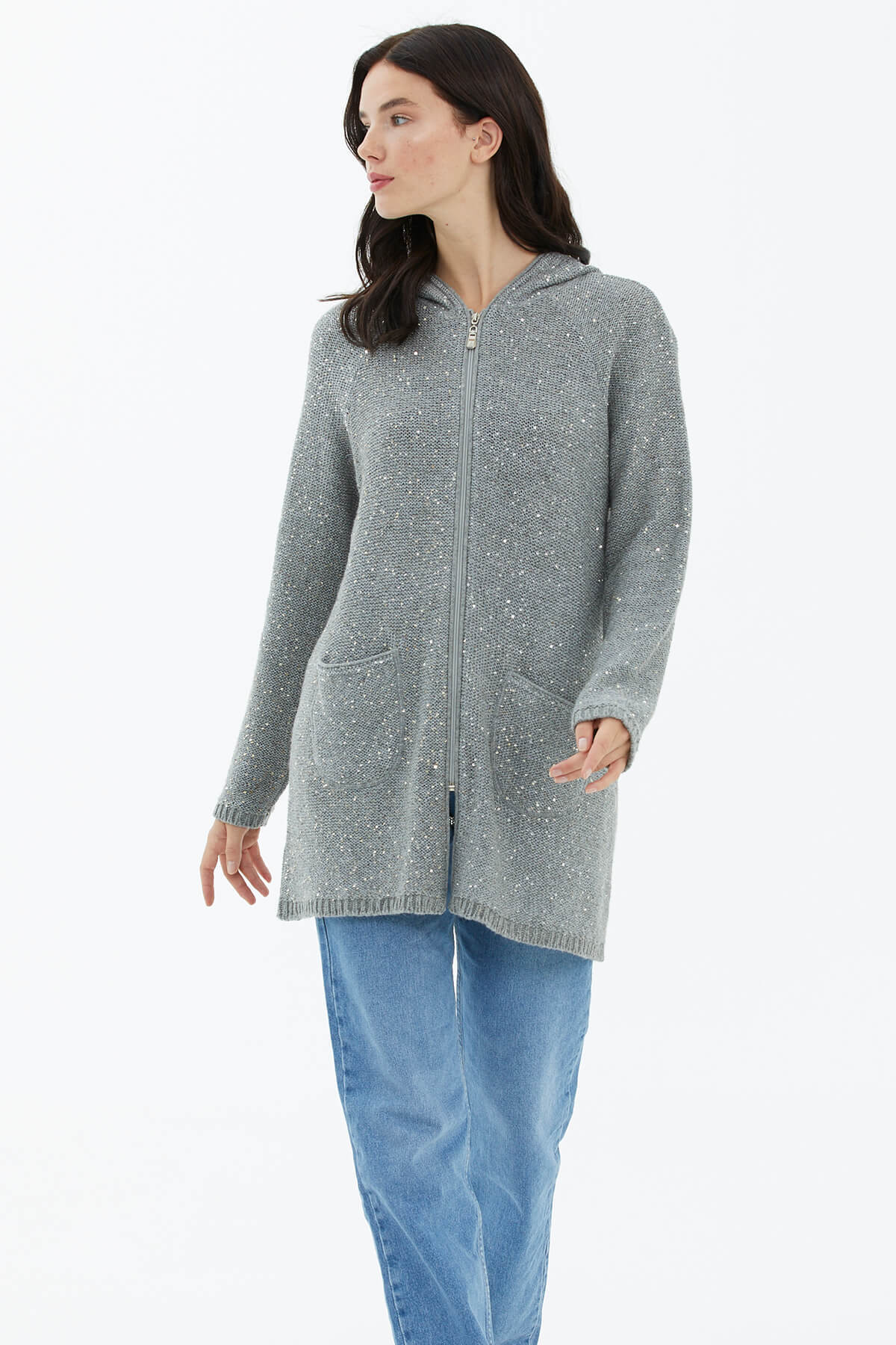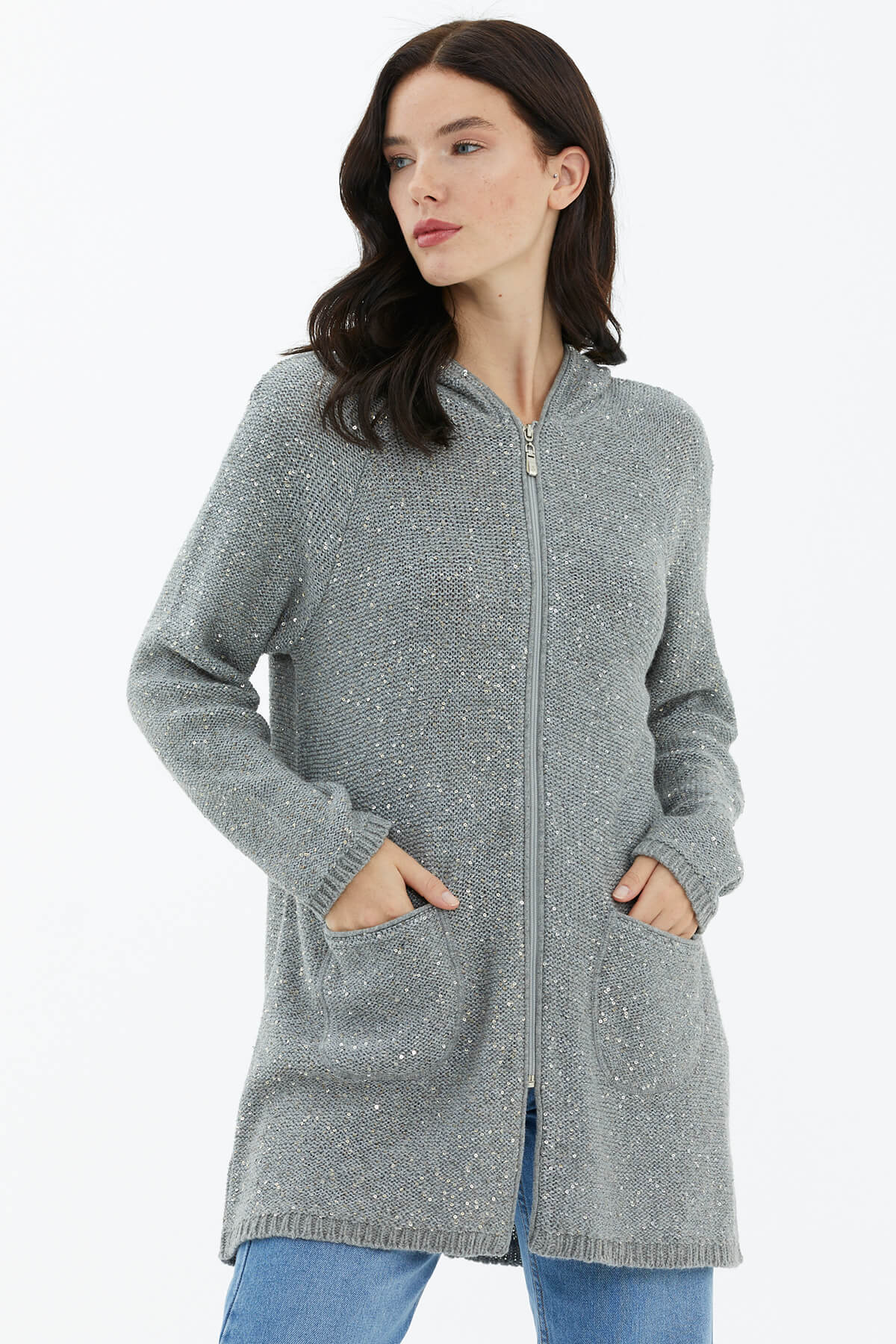 Kapüşonlu Fermuarlı Pullu Triko Hırka - Gri