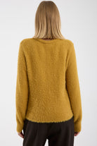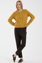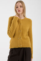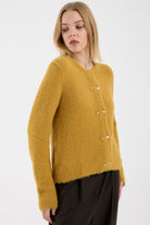 Metal Düğme Detaylı Sakallı Triko Hırka - Hardal