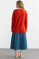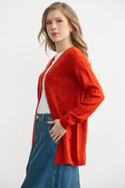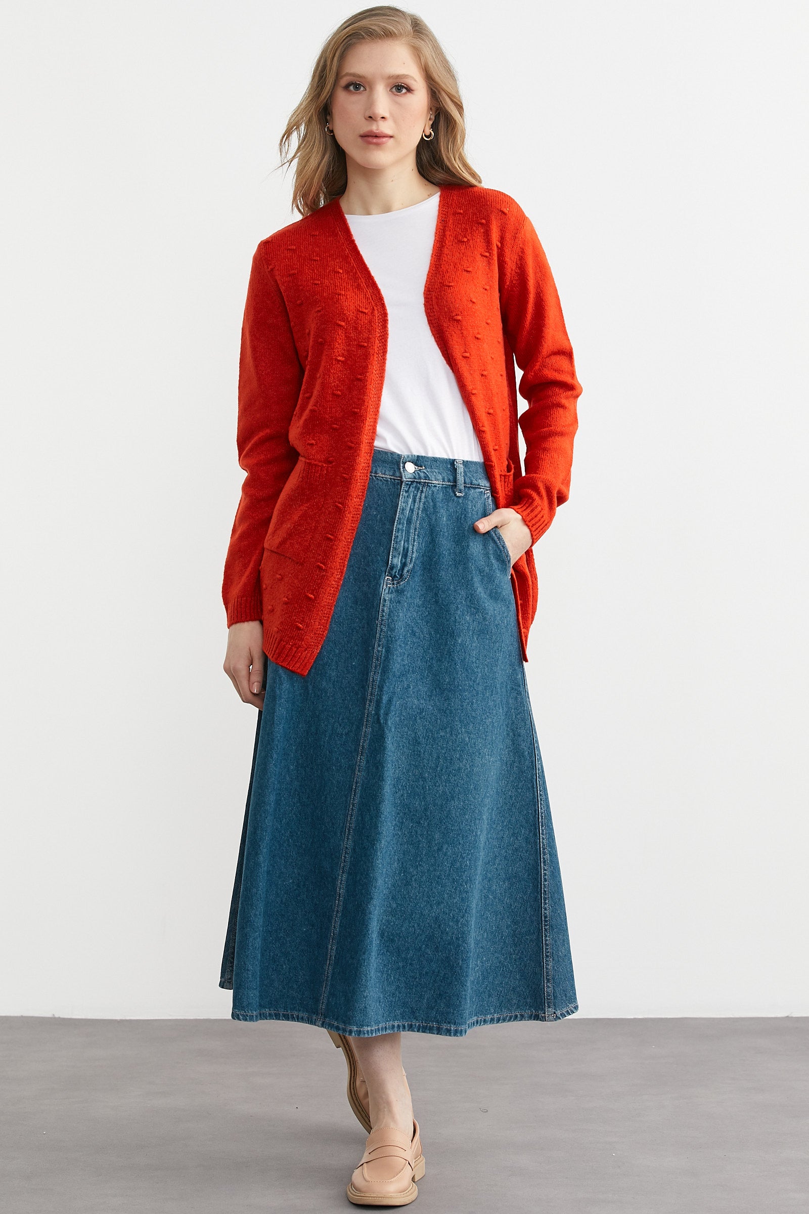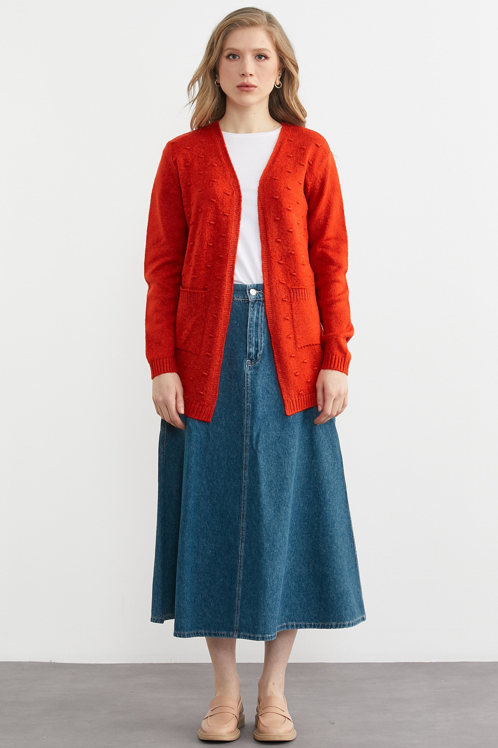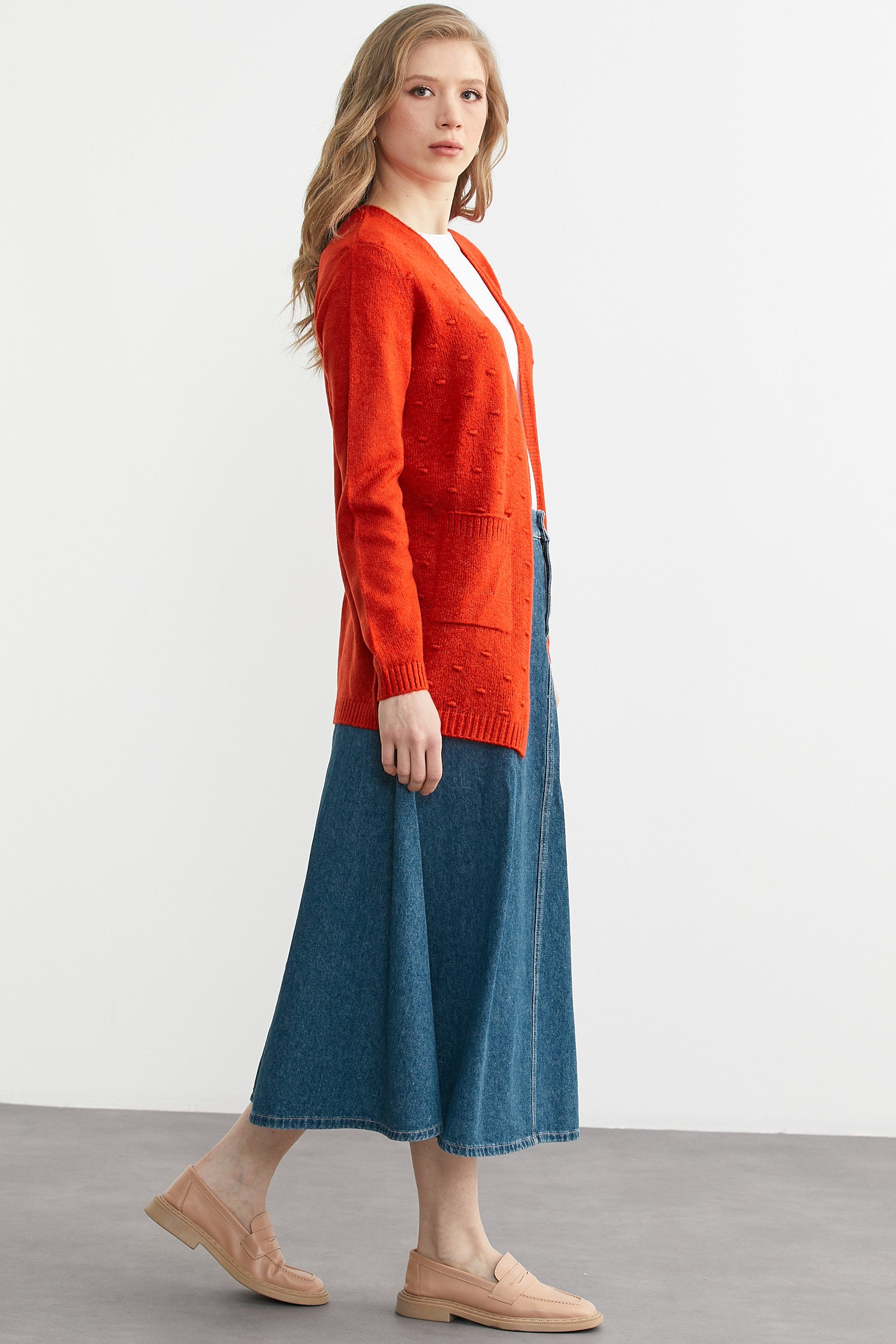 Örgü Detaylı Cepli Uzun Triko Hırka - Koyu Oranj