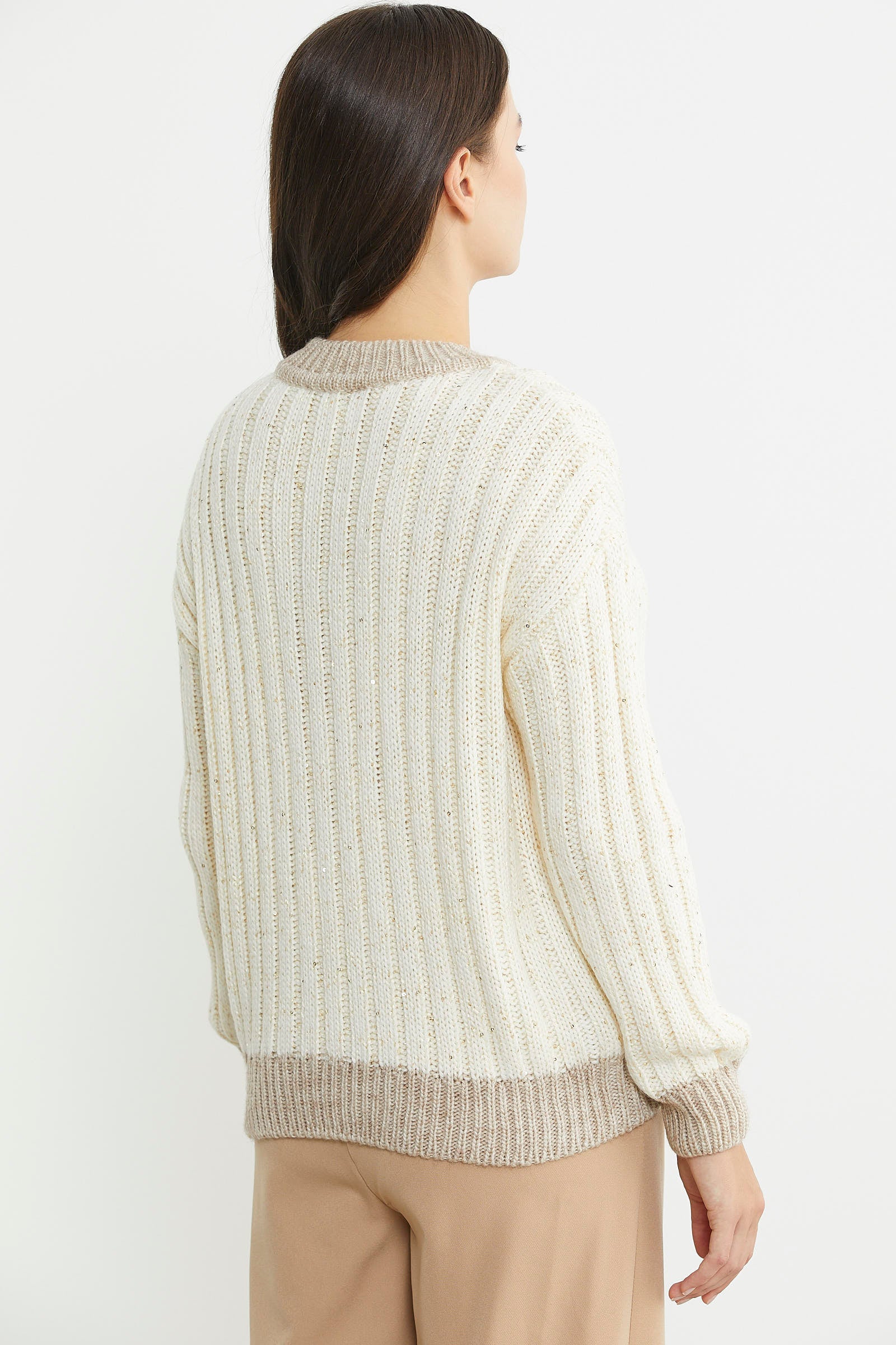 Parlak payetlerin öne çıktığı triko hırka, kontrast renklerle birleşmiştir. Düğme kapamalıdır.