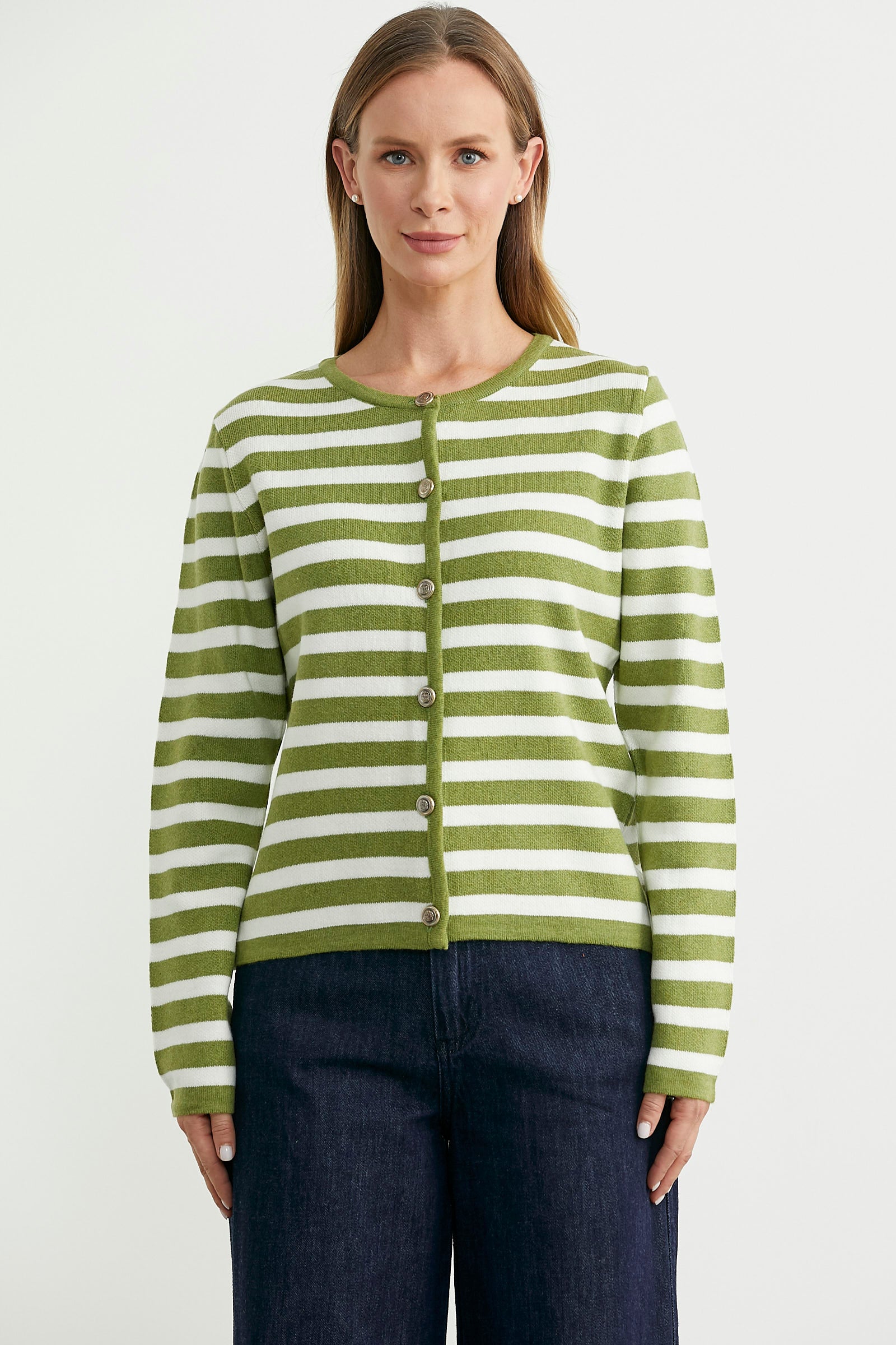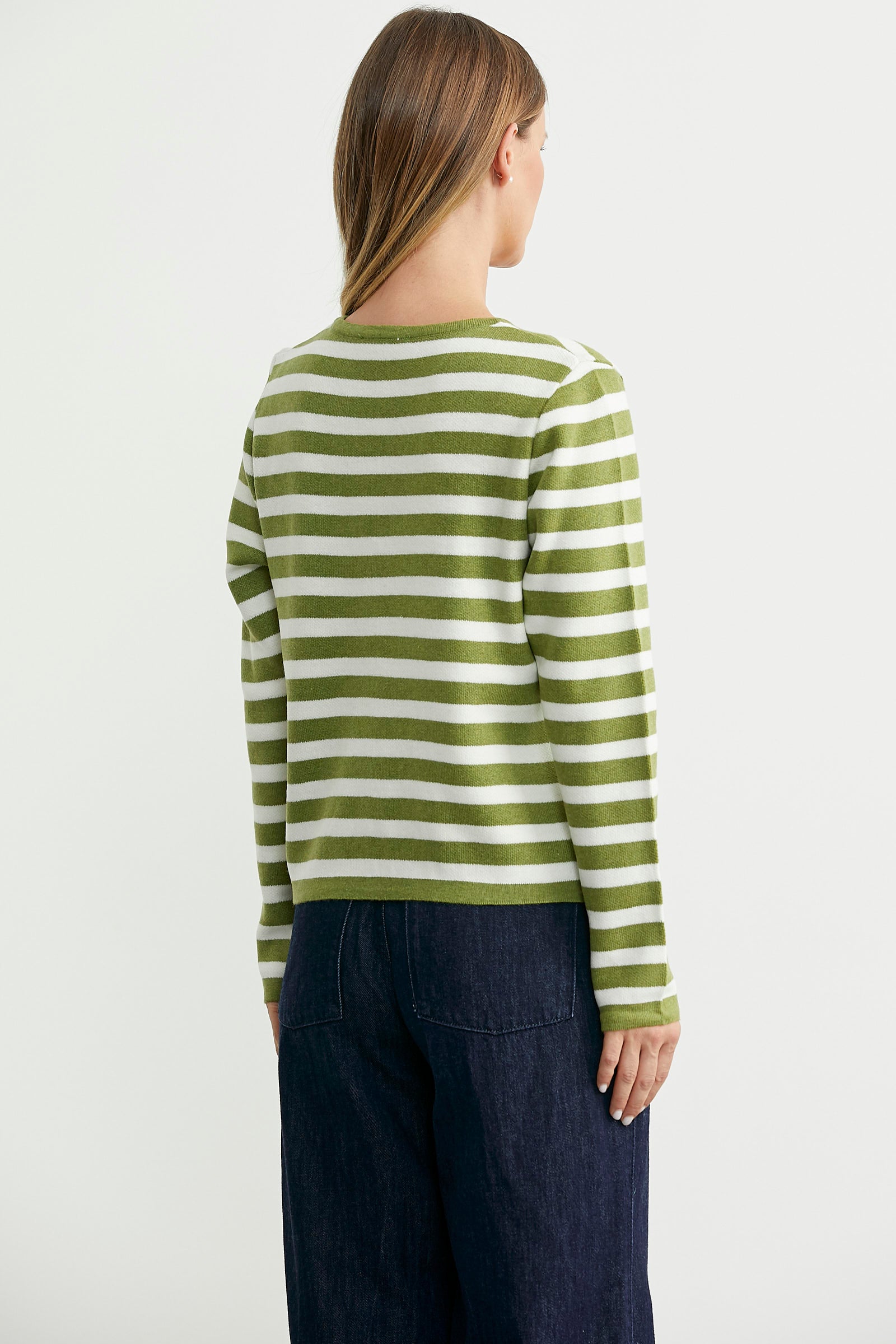 Her kombininize uyum sağlayacak bir parçaya ne dersiniz? Önden düğmeli, iki renkli, çizgili triko hırka sizi yumuşacık dokusu ile rahat hissettirirken stilinize şıklık katacaktır. İster pantolonlarınızla isterseniz de eteklerinizle kombinleyebileceğiniz tamamlayıcı bir parça olacaktır.
