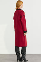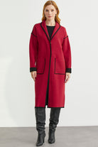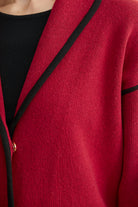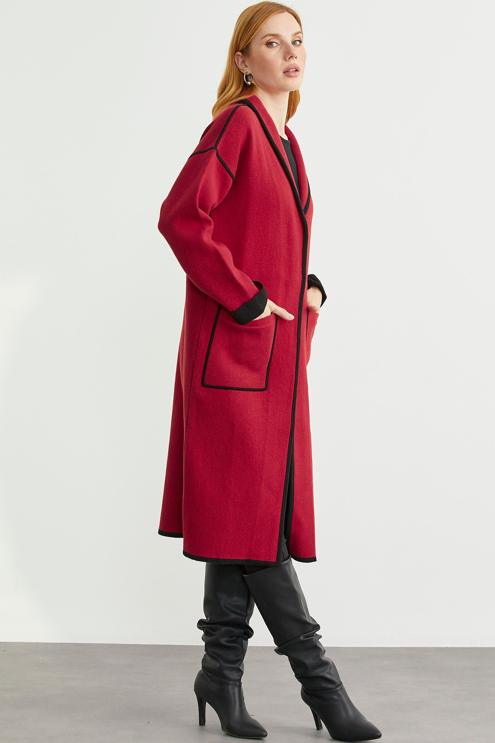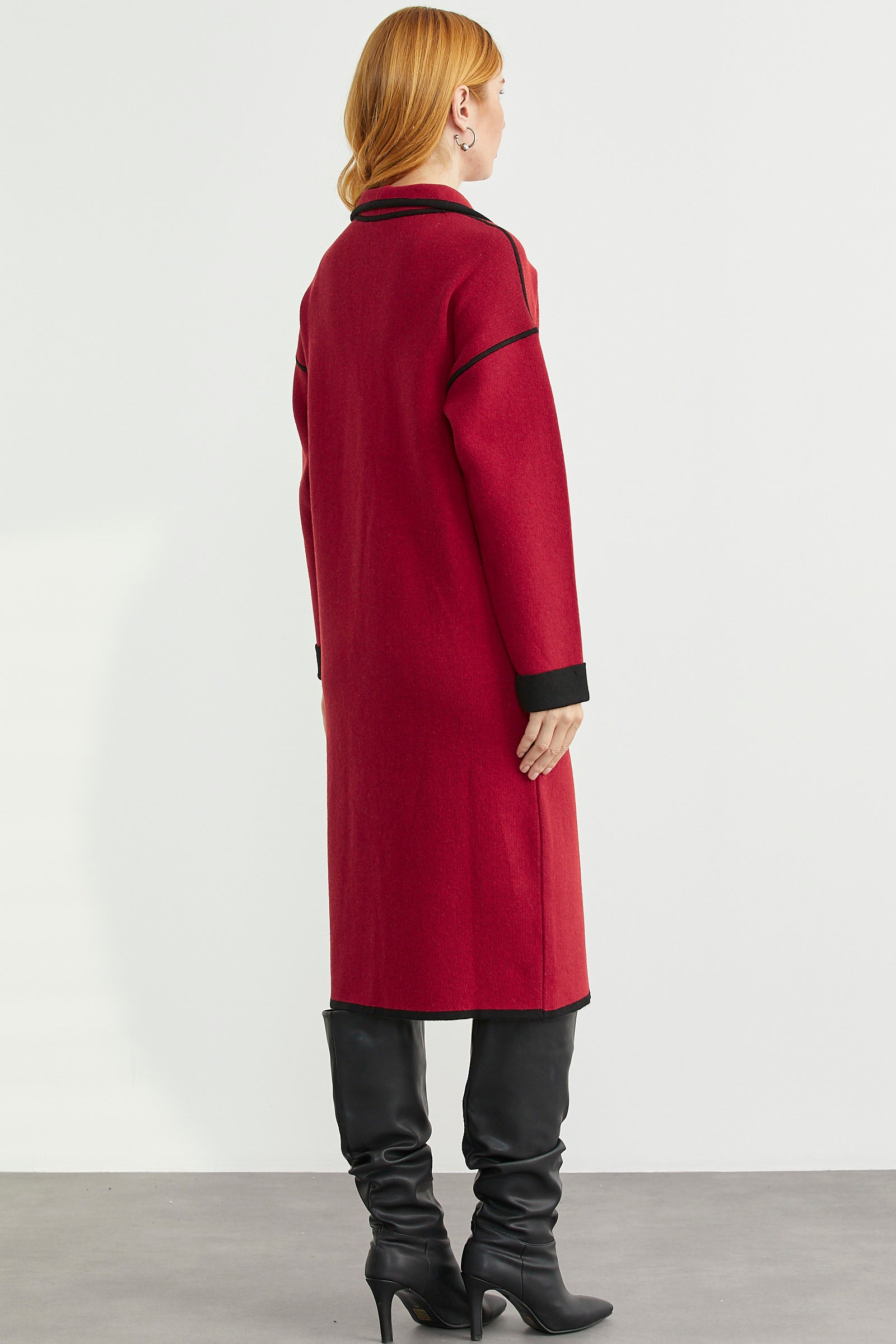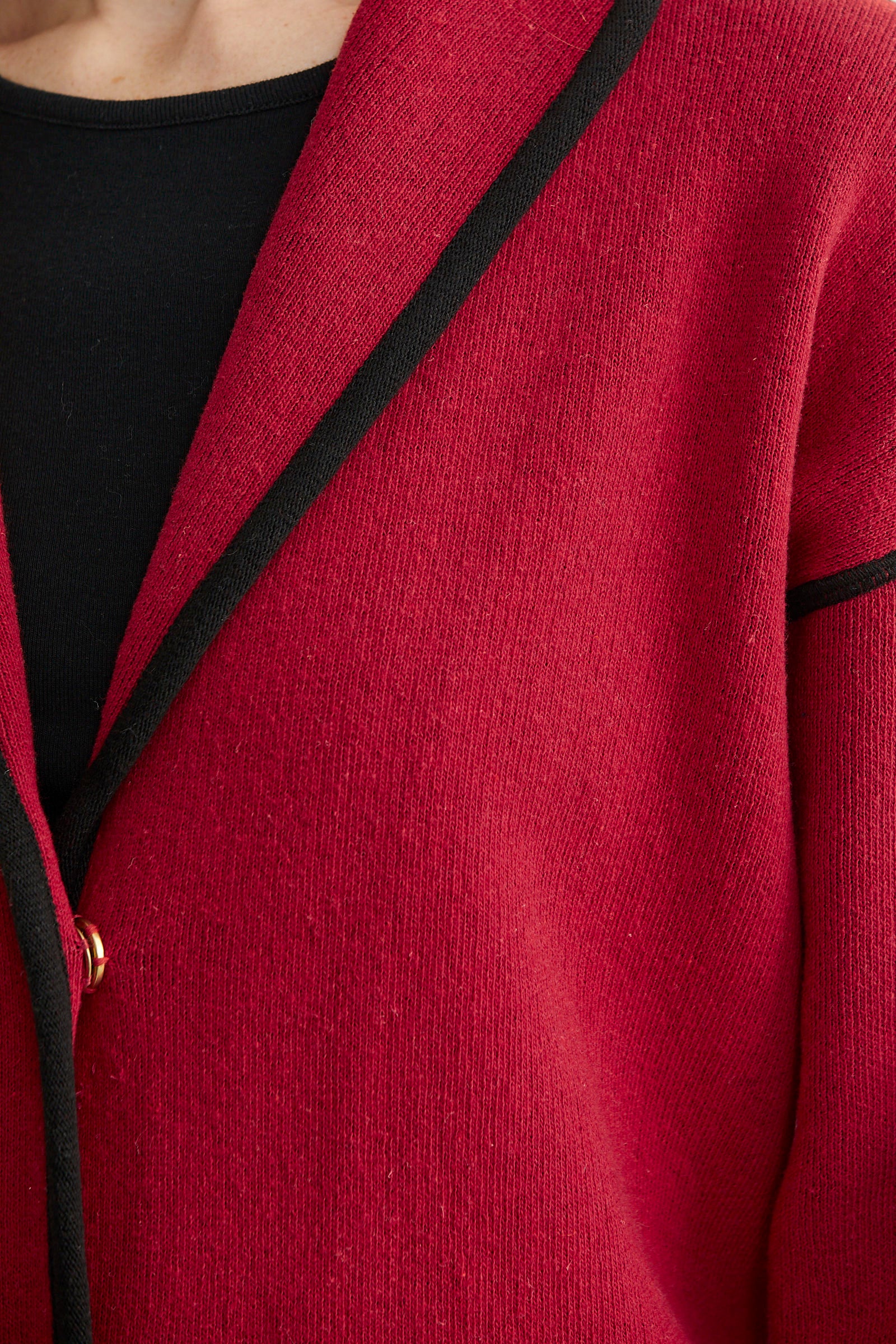 Şal Yaka Çıtçıtlı Uzun Triko Hırka - Kırmızı - Siyah