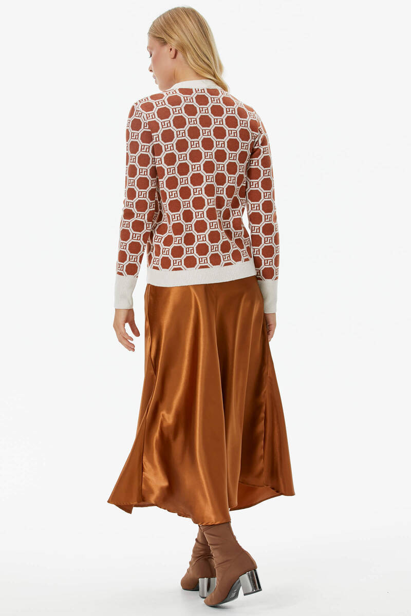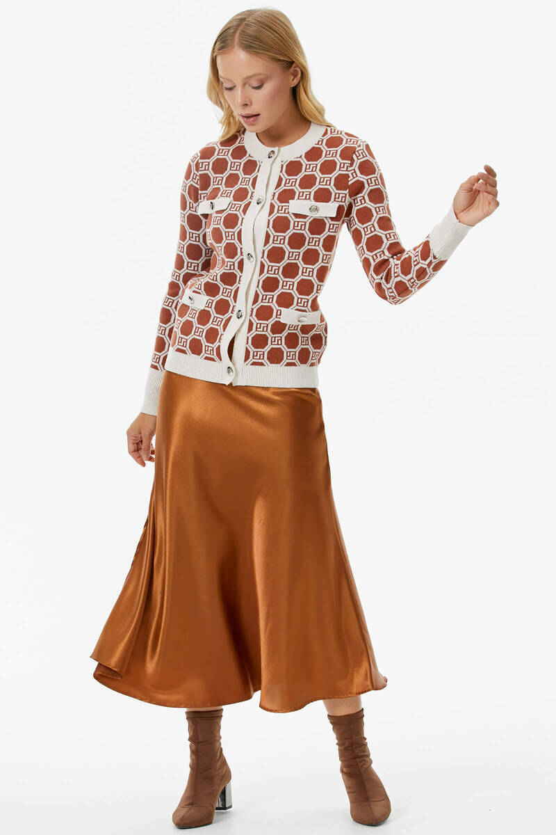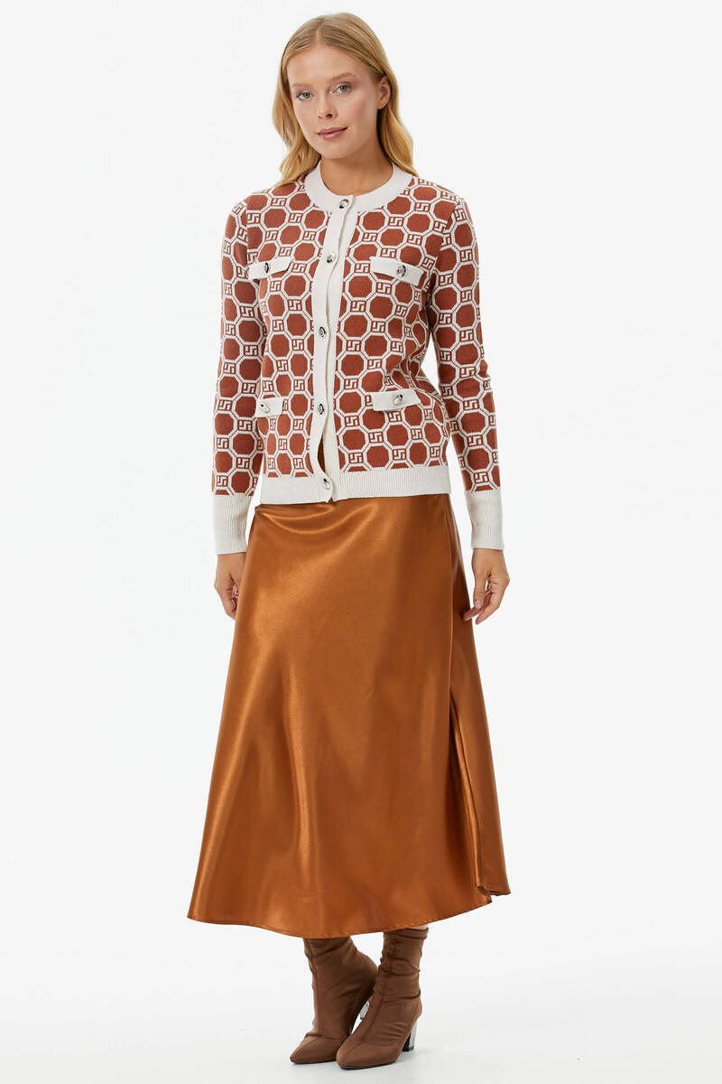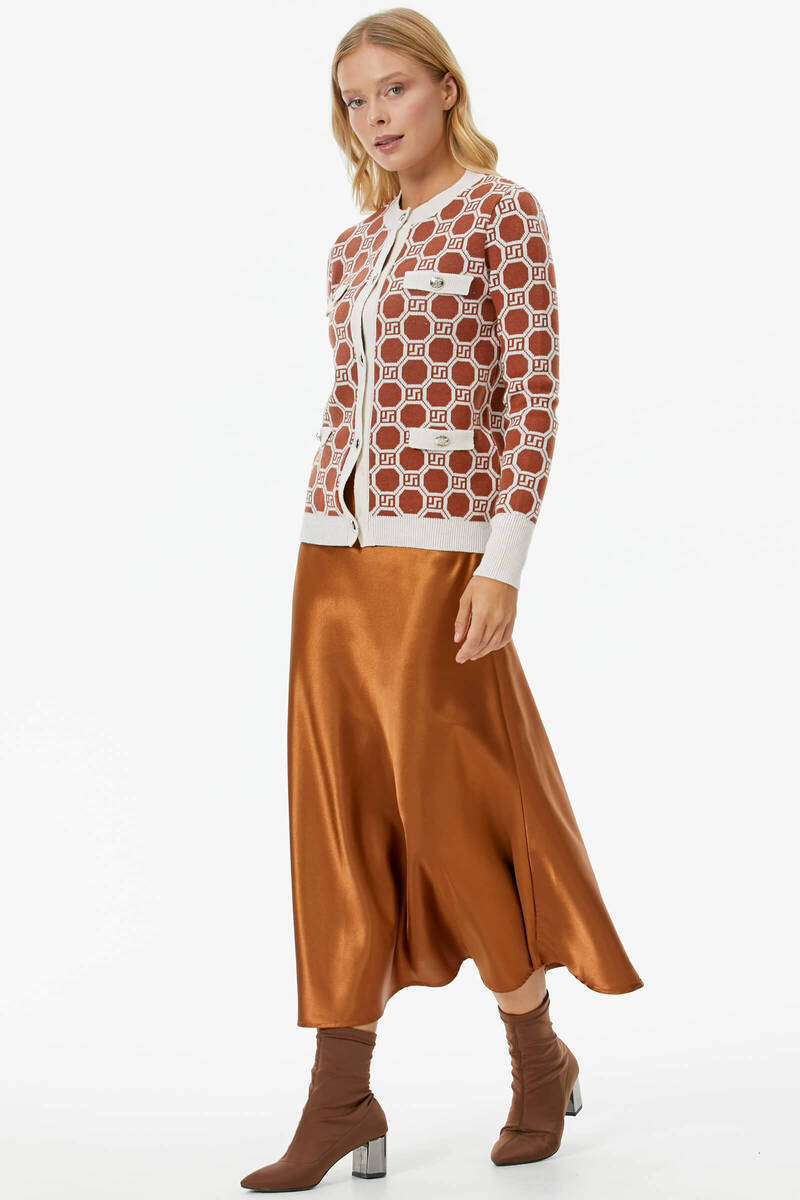 Sıfır Yaka Düğmeli Cep Detaylı Triko Hırka - Kemik - Taba