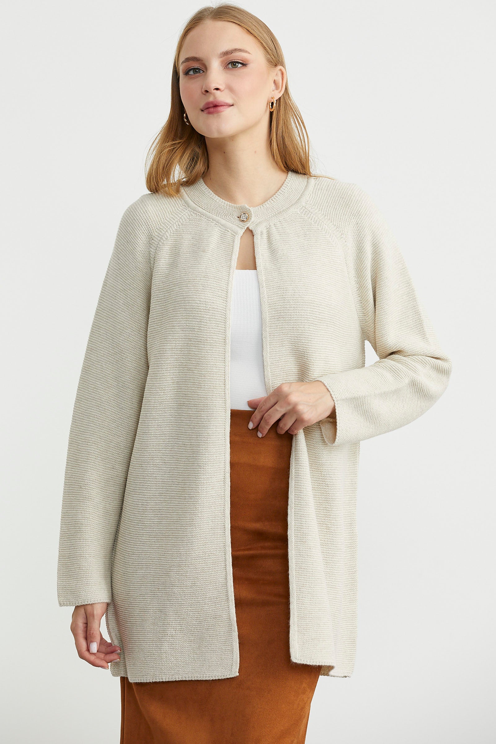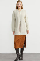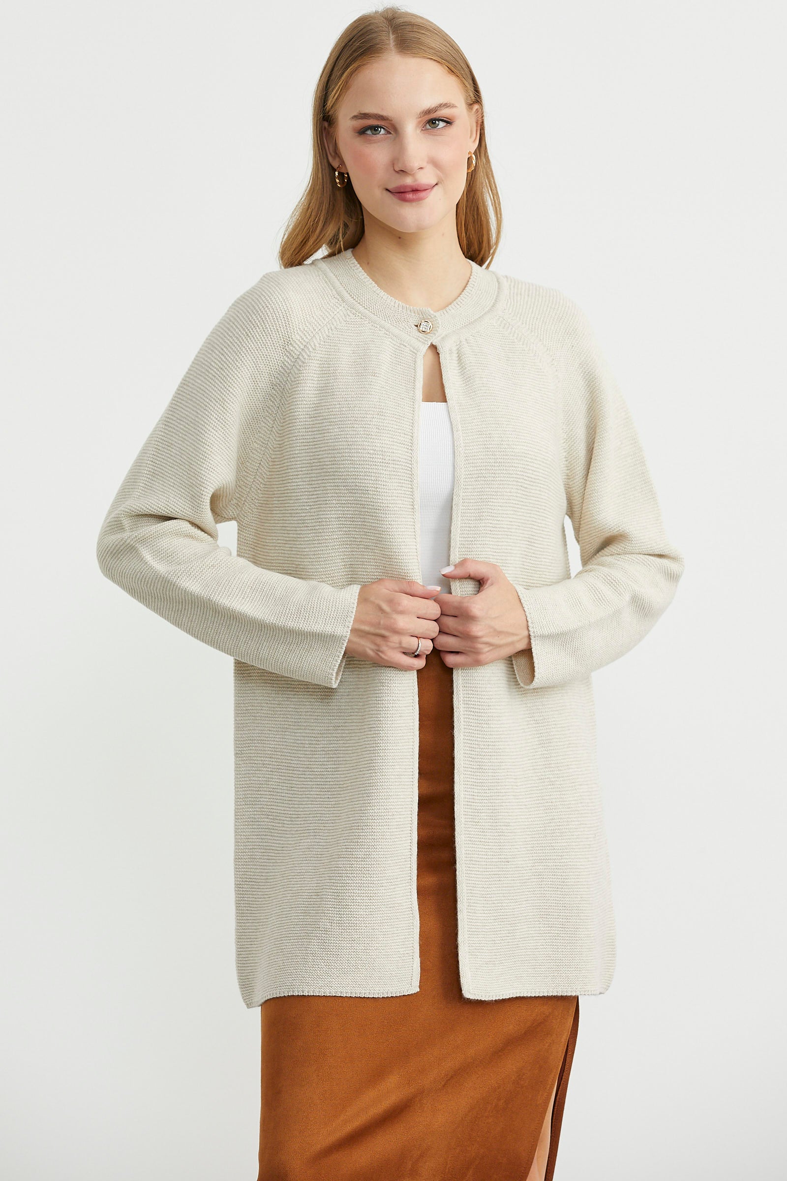 Sıfır yaka, tunik boy triko hırka, metal ve taş detaylı düğme ile hareketlendirilmiştir.Uzun kol, rahat kalıptır.