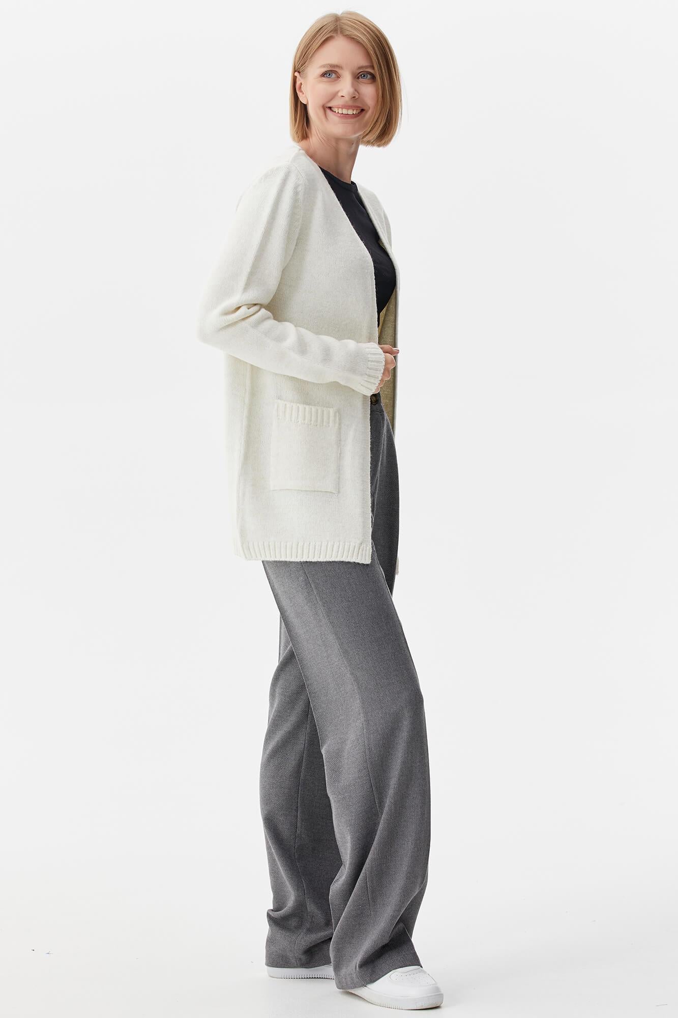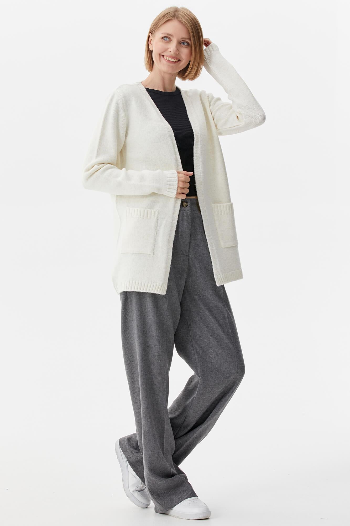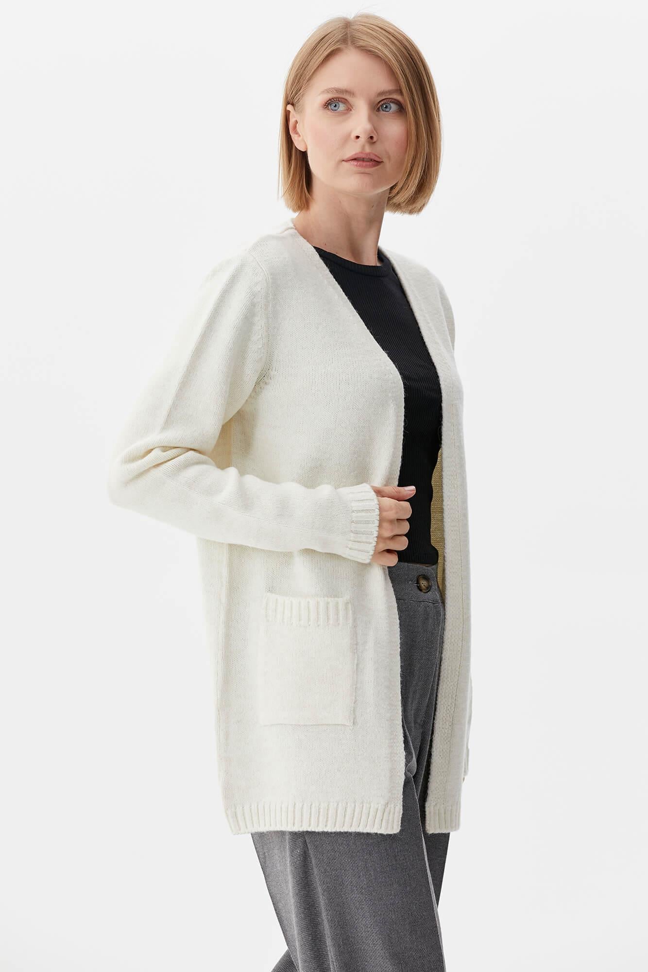 Yumuşak dokusu ile konfor sunan, v yakalı, uzun kollu, ön yüzeyde bulunan cep detayı ile sade formuna hareket katan triko ceket ile zarif görünümler yaratın.