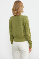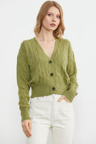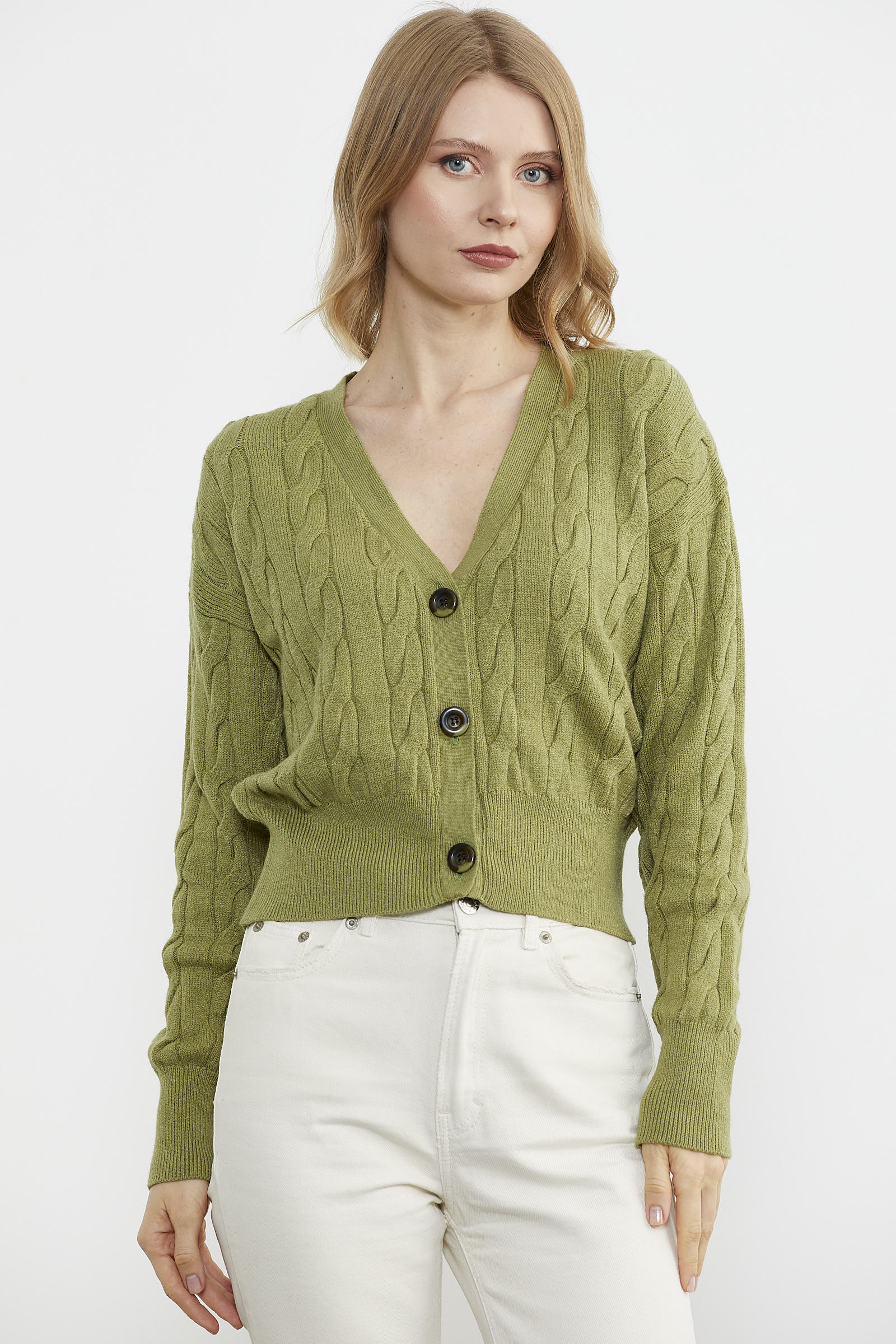V Yaka Düğmeli Saç Örgülü Triko Hırka - Fıstık Yeşili