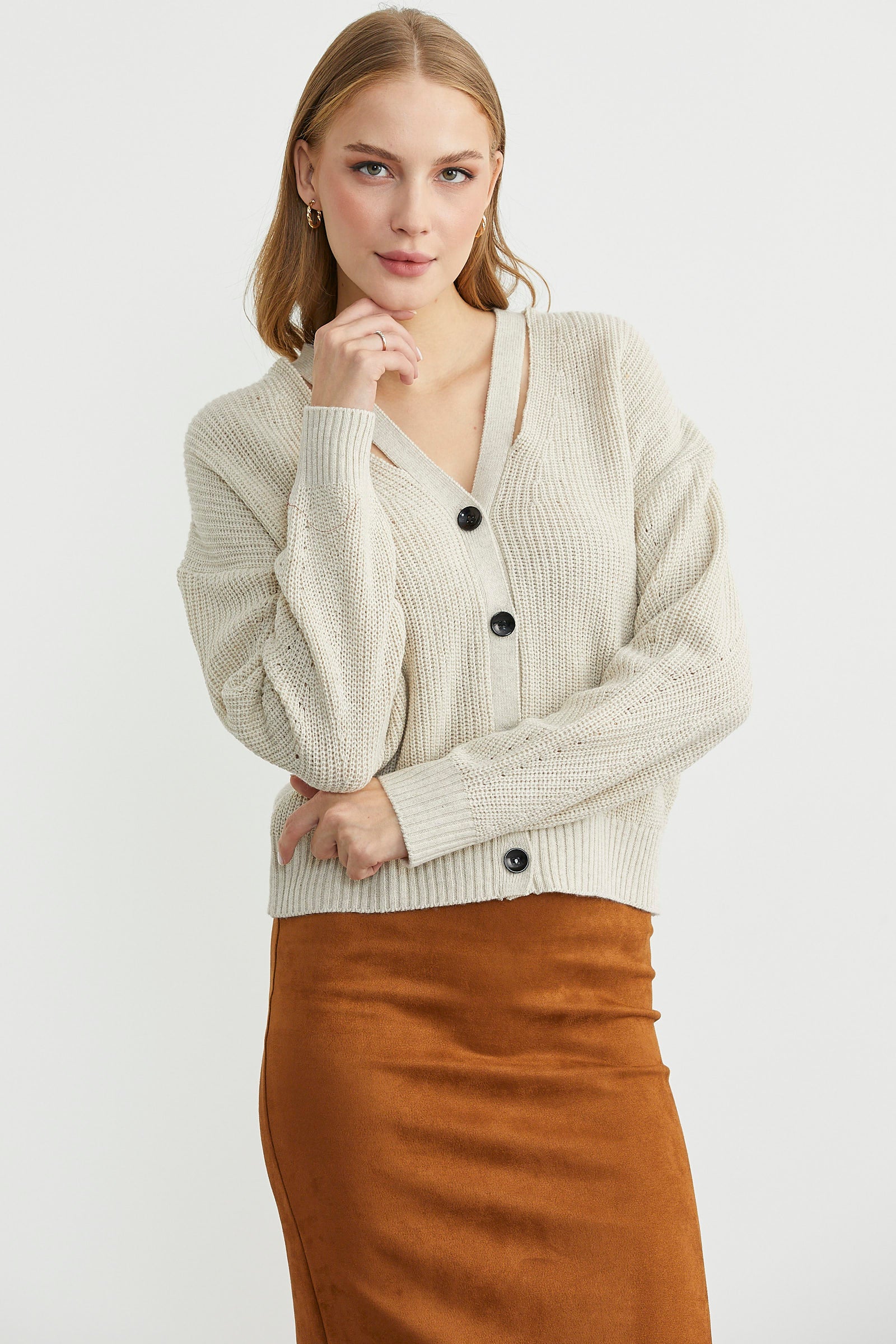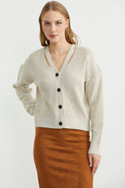 Yaka Detaylı Düğmeli Triko Hırka - Taş