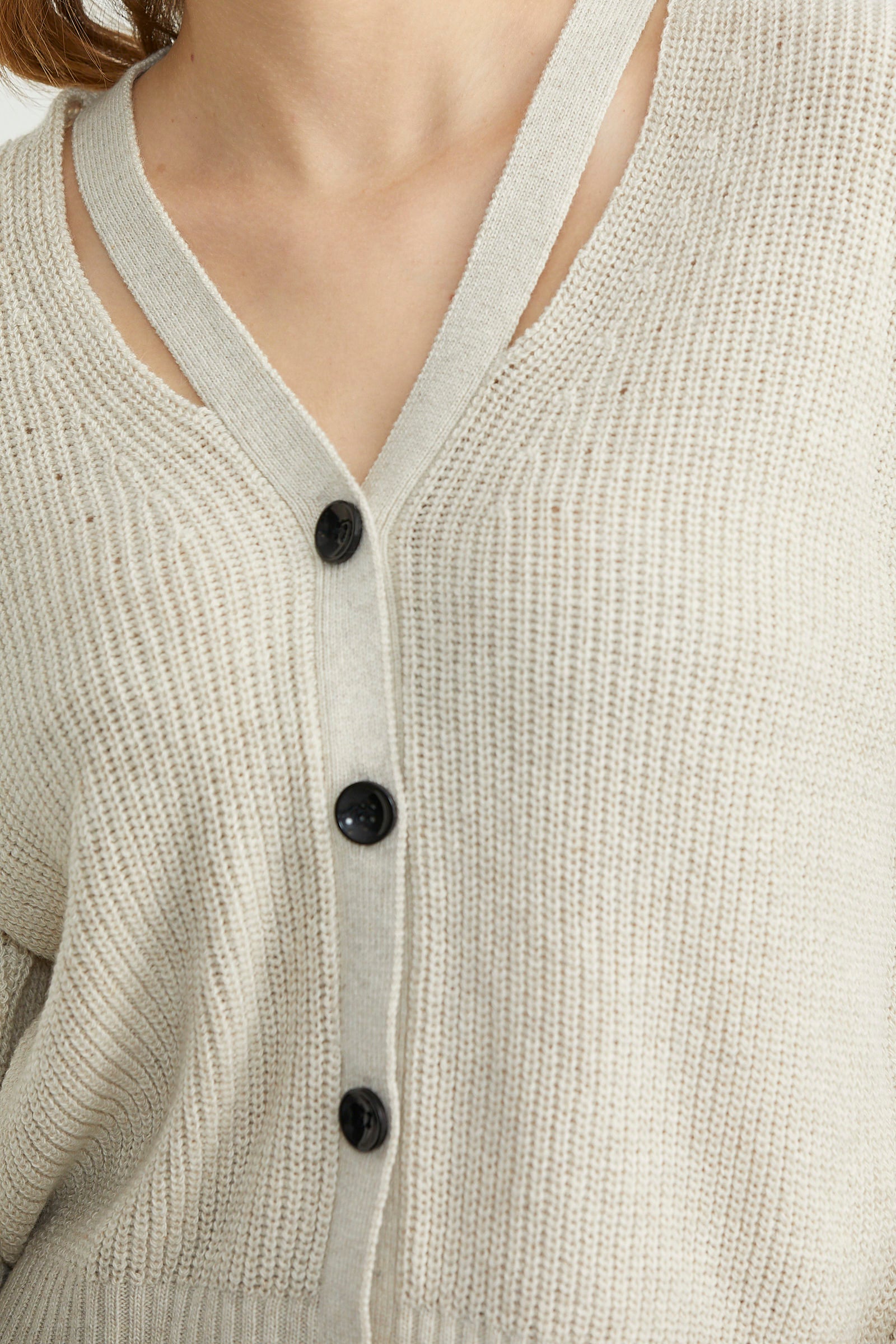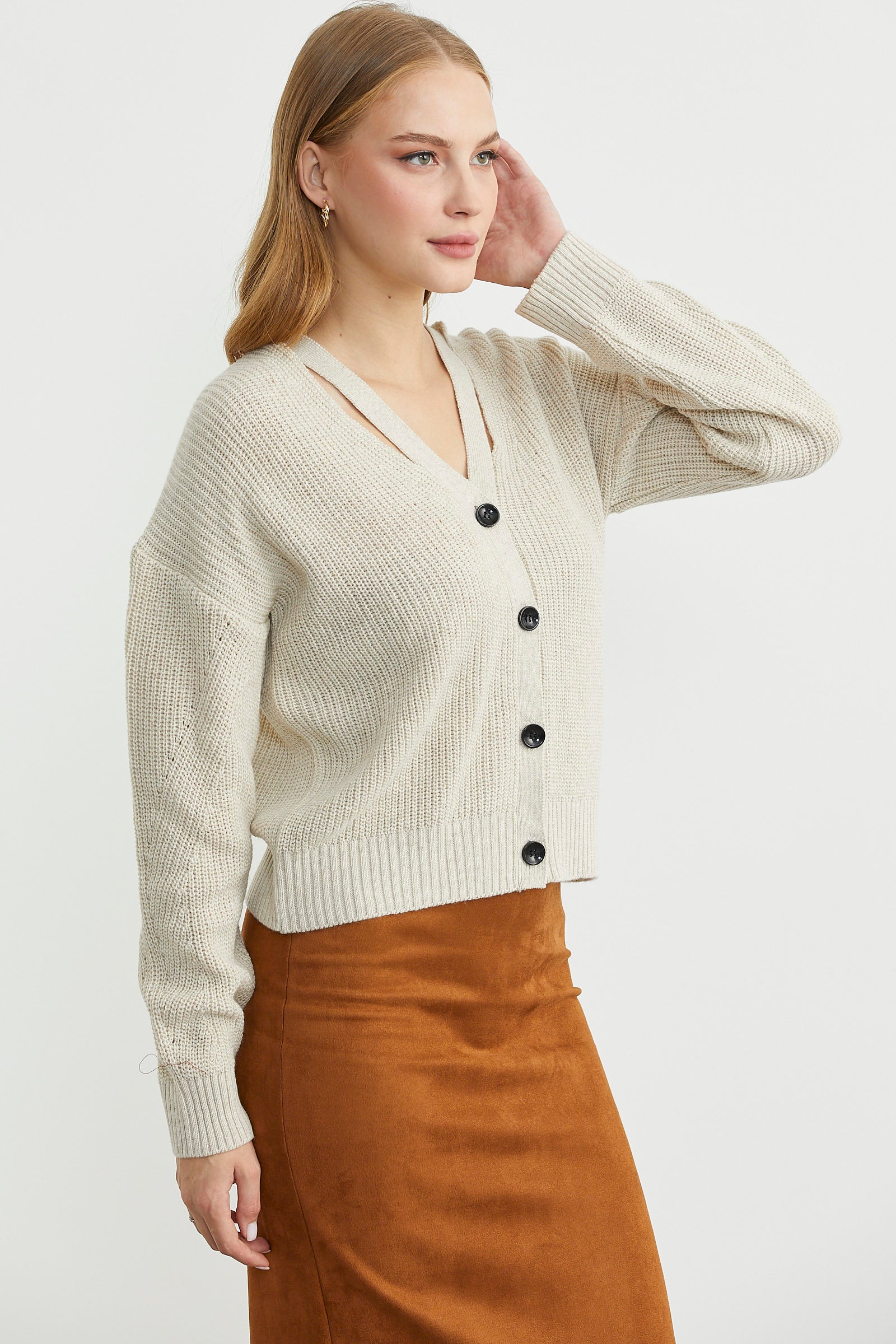 Yumuşak dokulu, düşük kol, düğme kapamalı triko hırka. V yakayla birleşen biye detayı, modele hareket katmaktadır.