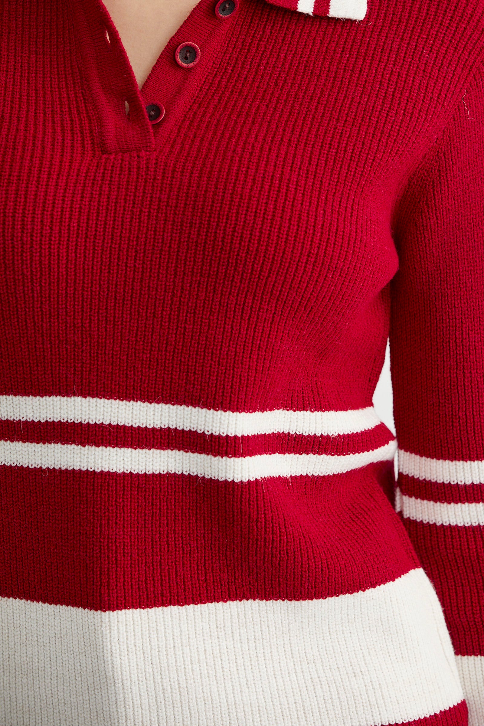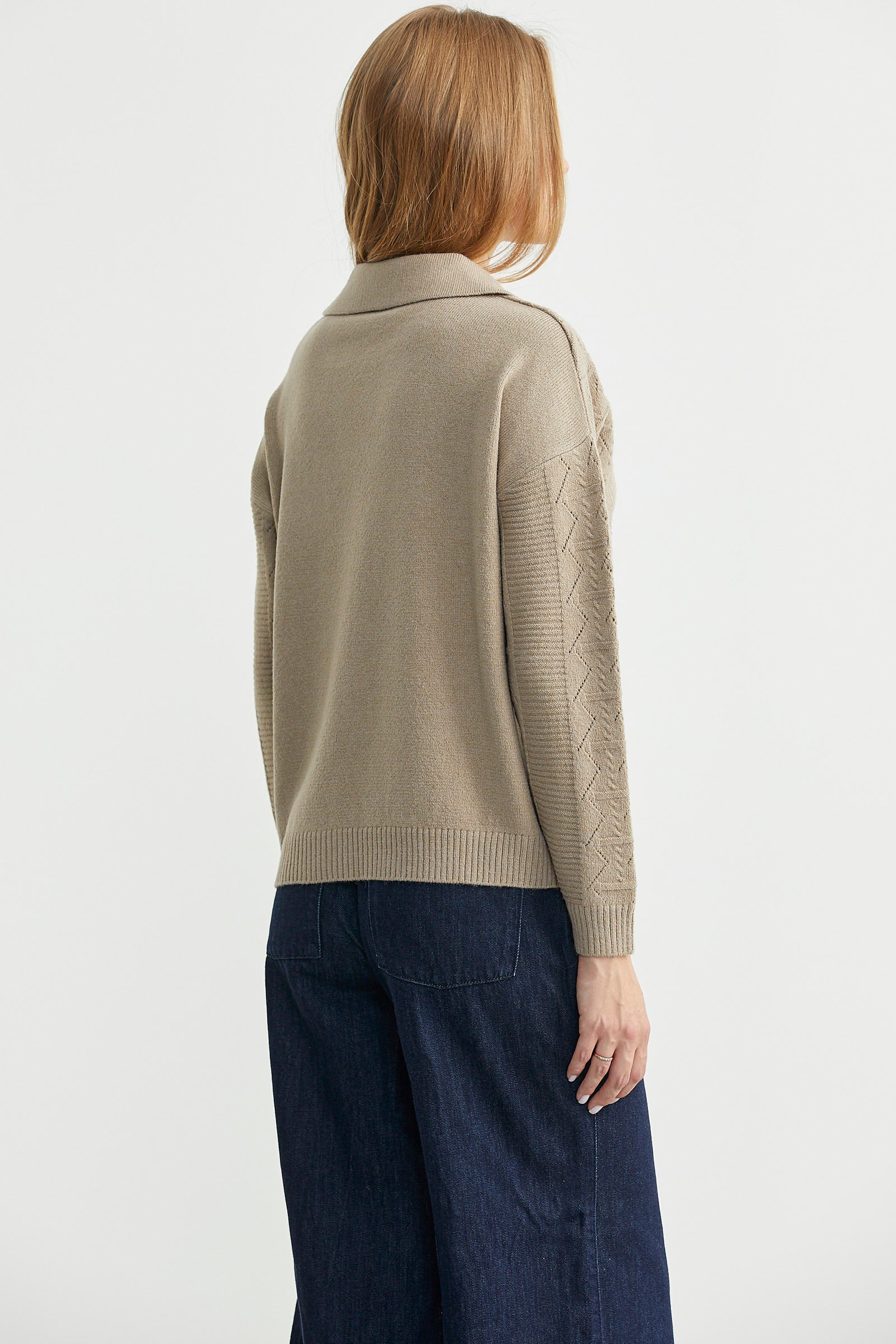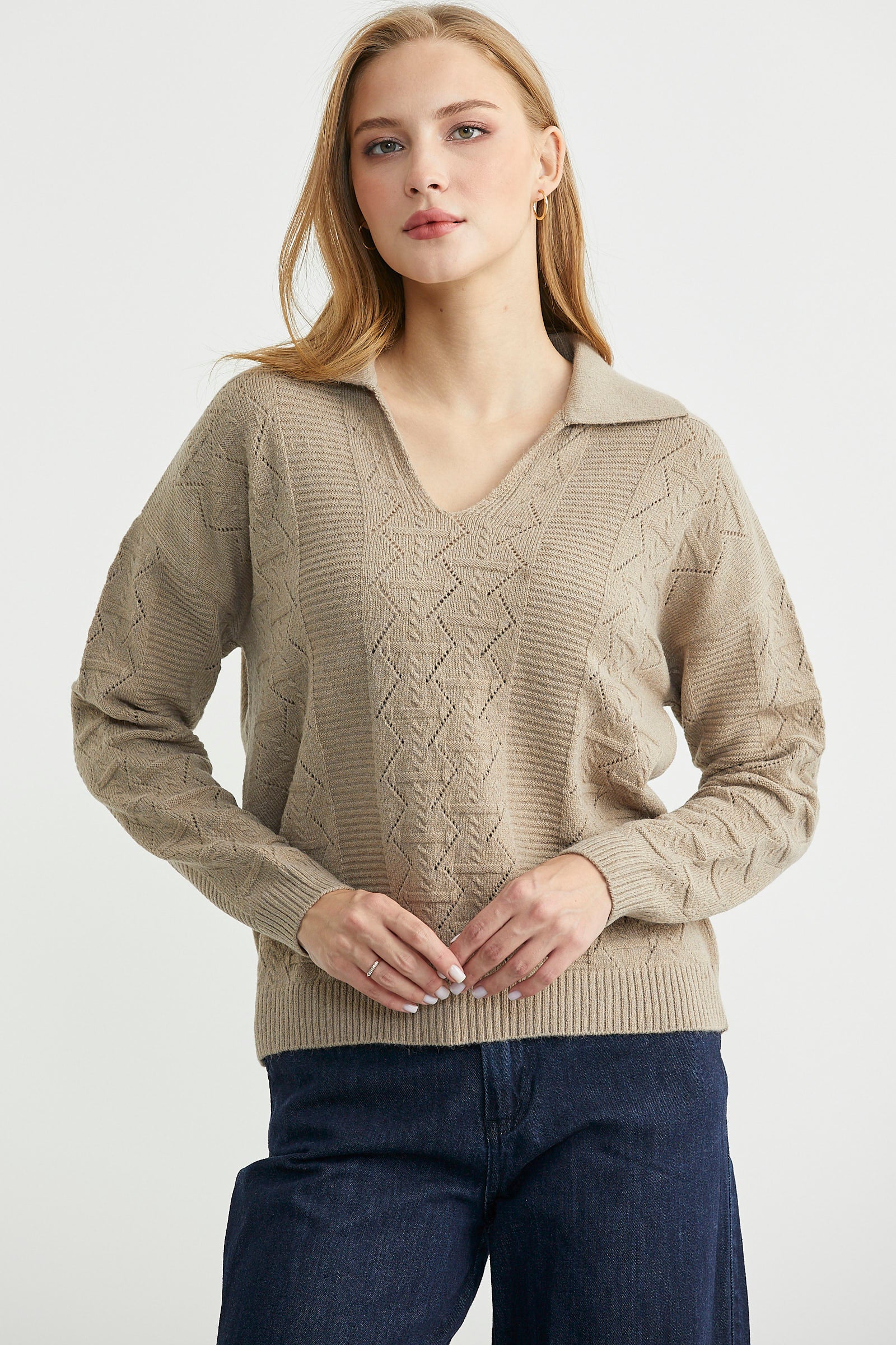 Bej rengi kuzu desenli polo yaka kazak da, kadın triko kazak ürünleri arasında adeta bir inci gibi parlıyor. Özellikle kış aylarında hayvan desenli kazakların sık tercih edildiği biliniyor. Bu desenler, sıcak, samimi ve sevimli bir hava oluşturduklarından çok beğeniliyor.
