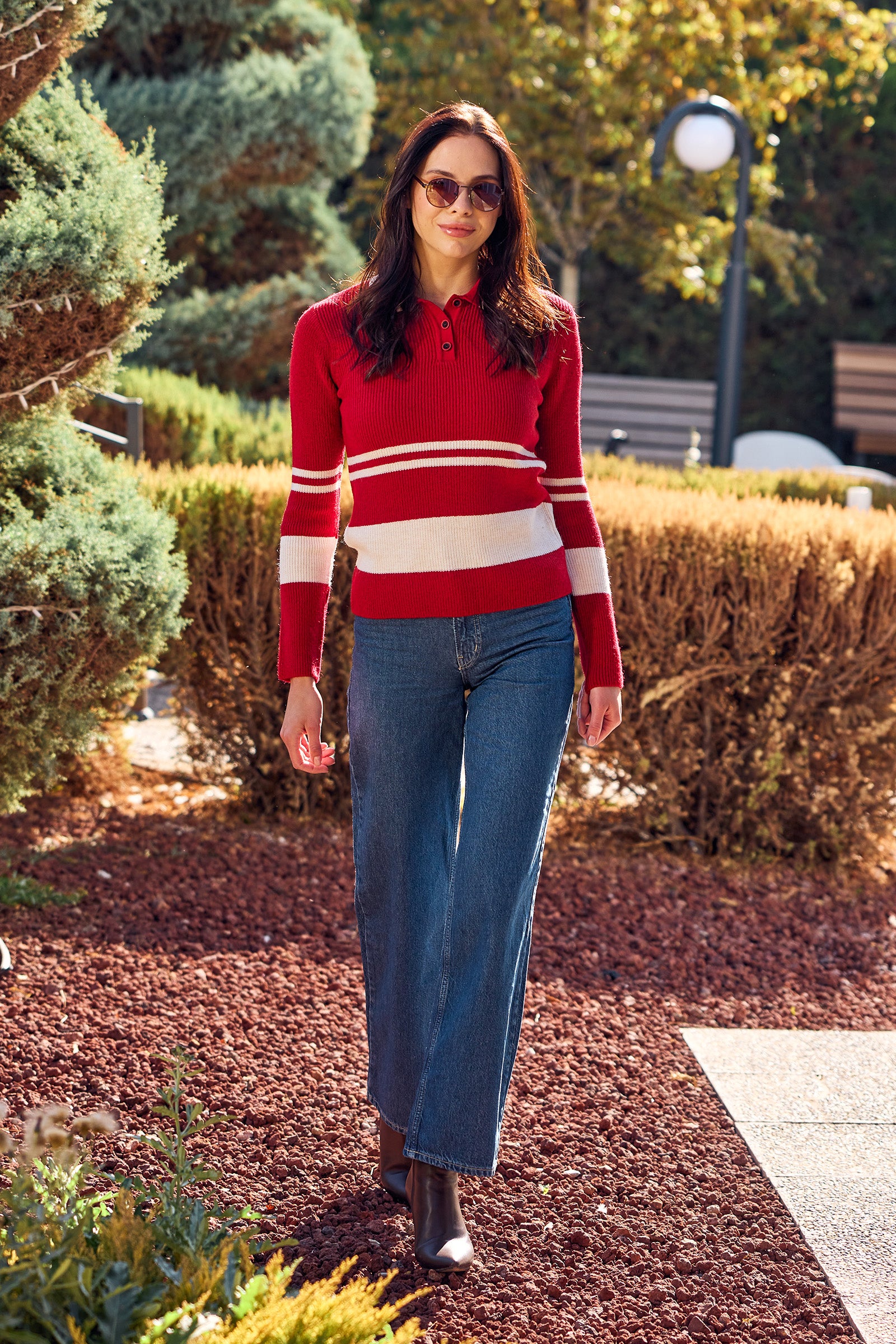 Dikdörtgen vücut şekline sahipseniz, yani vücudunuzun belirgin hatları yoksa kazak seçiminizi buna uygun olarak yapmalısınız. Bu durumda, hatlarınızı öne çıkartacak biçimde, olgun ya da genç kadın kazak modelleri arasından dar bir tasarımı seçmelisiniz. İnce hatlarınızı belirginleştirecek kadın triko kazak modelleri içinden dar ve yatay desenleri olan çizgili kadın kazak tasarımlarına da yönelebilirsiniz. Renk tercihinizi ise yine hatlarınızı ortaya çıkarmak üzere beyaz kadın kazak seçeneklerinden yana kullanabilirsiniz. Bunların yanı sıra kalın kadın kazak seçimleriniz ile gösterişli bir görünüm elde edebilirsiniz. Kazağın üzerinde, fırfır, büzgü, püskül gibi hareketlendirici detayların olması da bu noktada size avantaj sağlar.