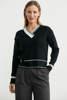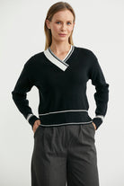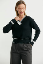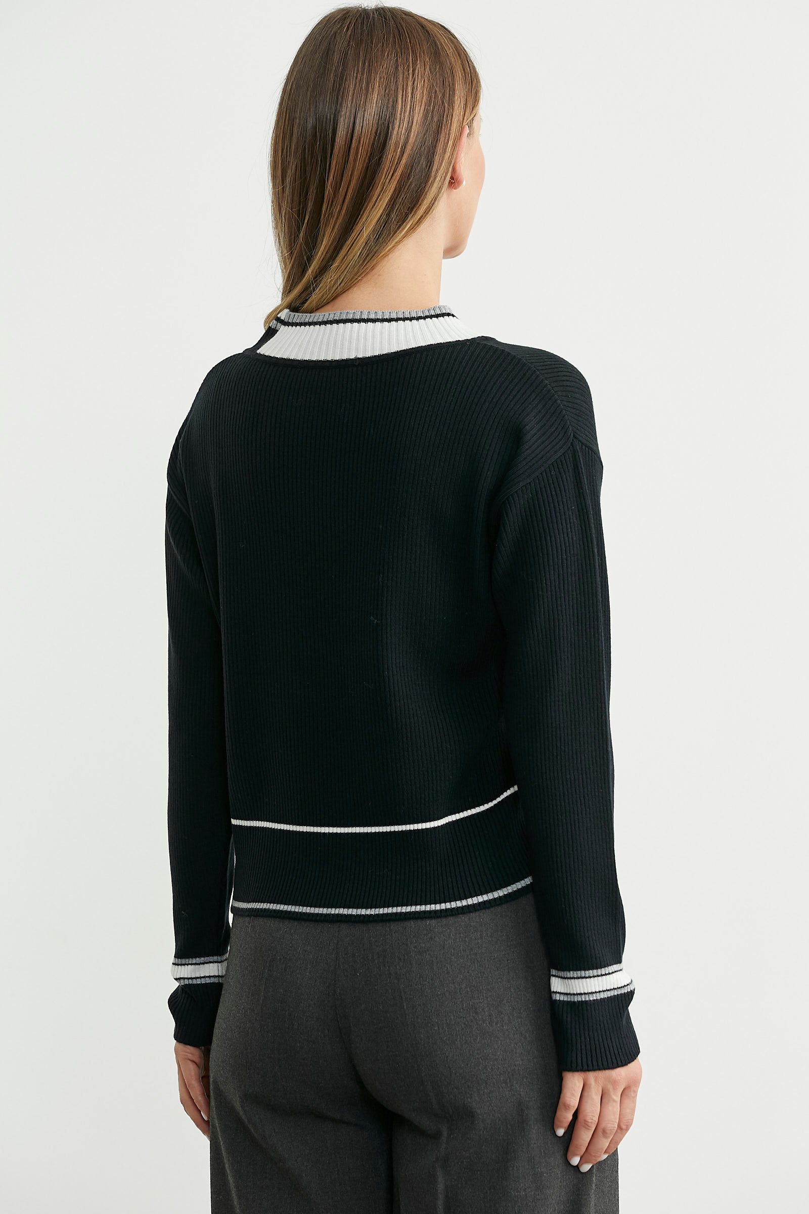 Blok geçişli, fitilli vücudu saran triko kazak. Lastik örgülü, etek ucu düz.
