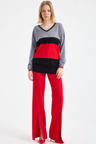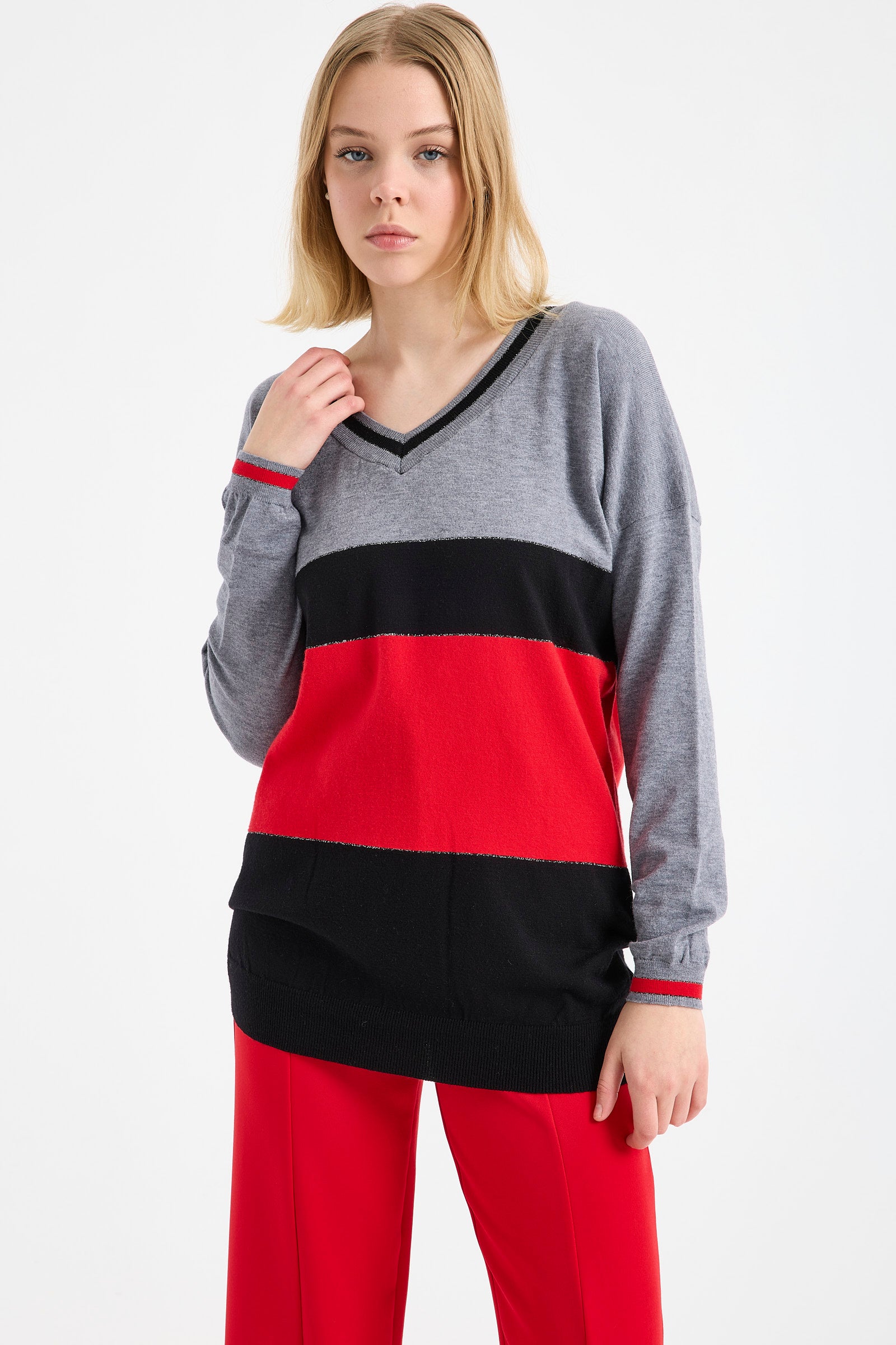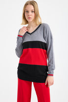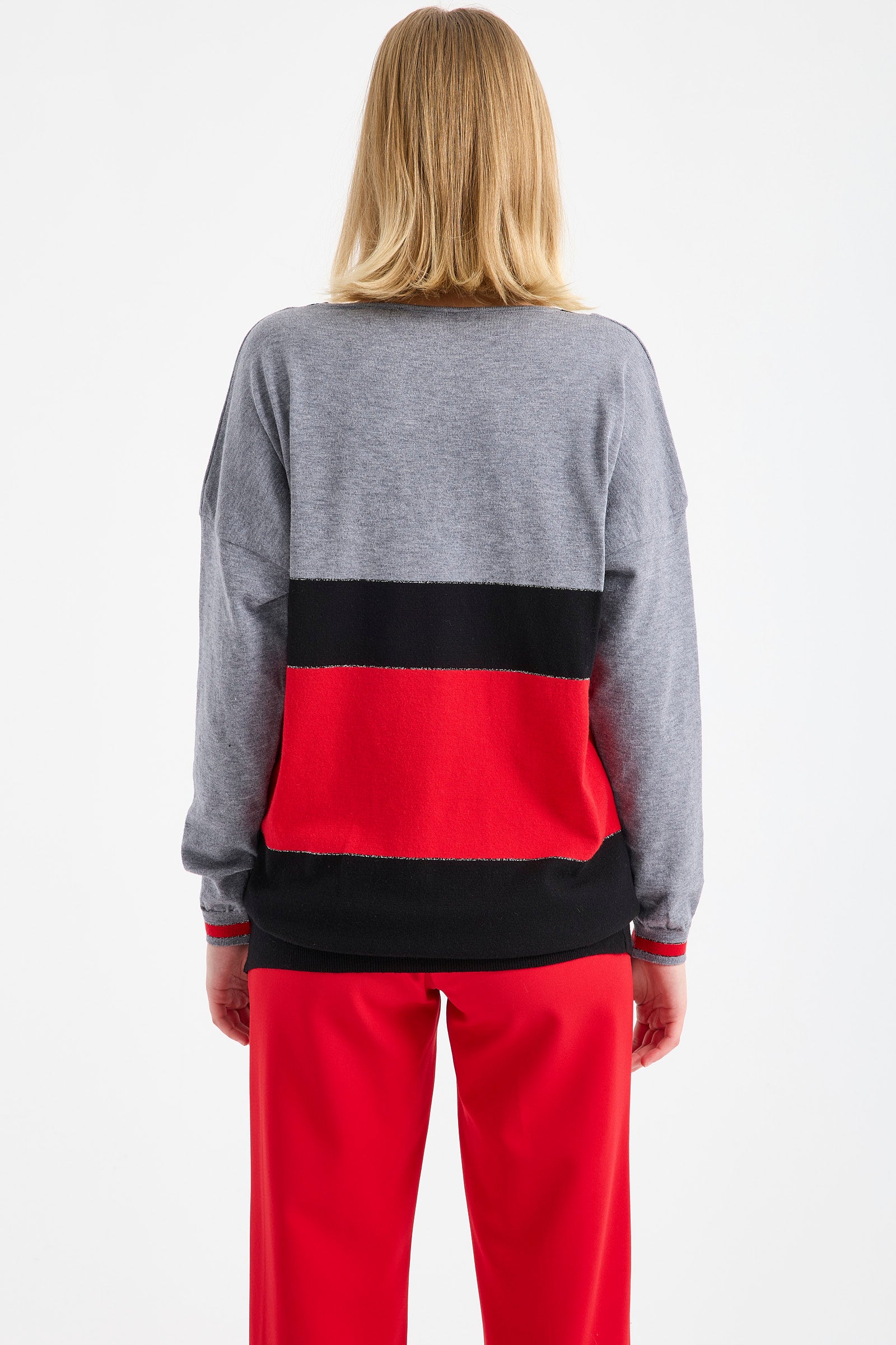 Blok Renkli Sim Detaylı Triko Kazak - Gri