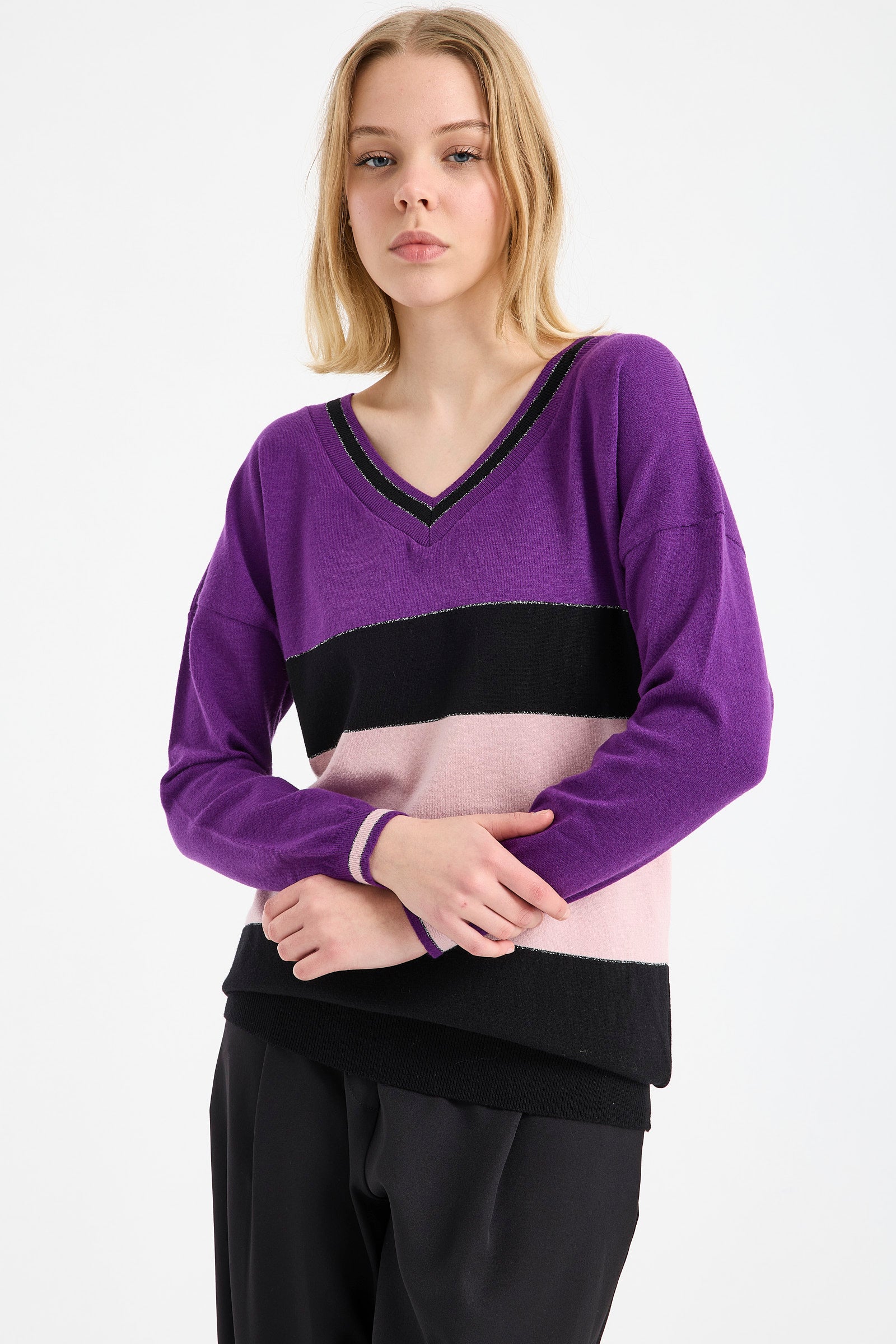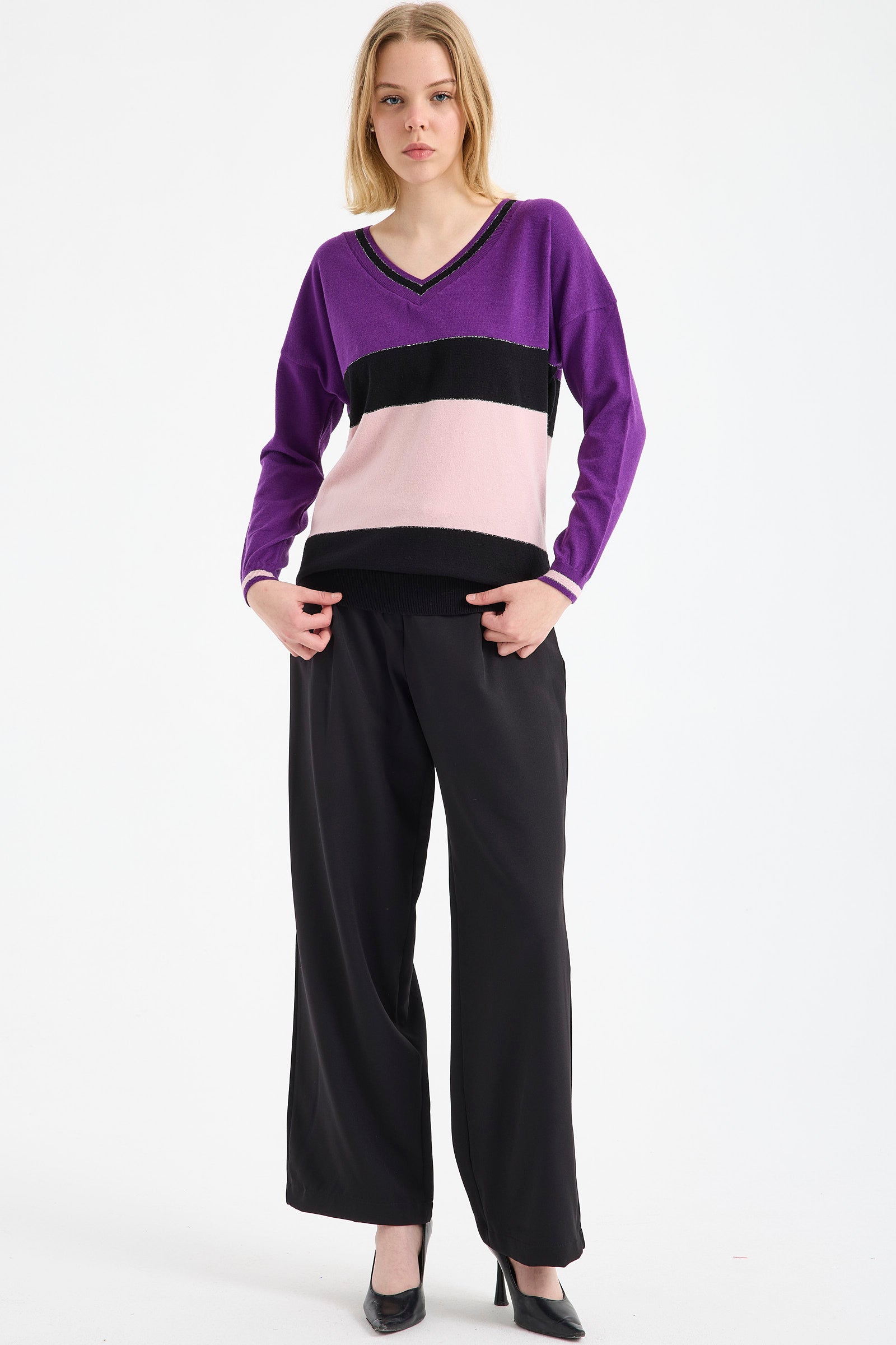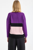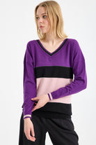 Blok Renkli Sim Detaylı Triko Kazak - Mor