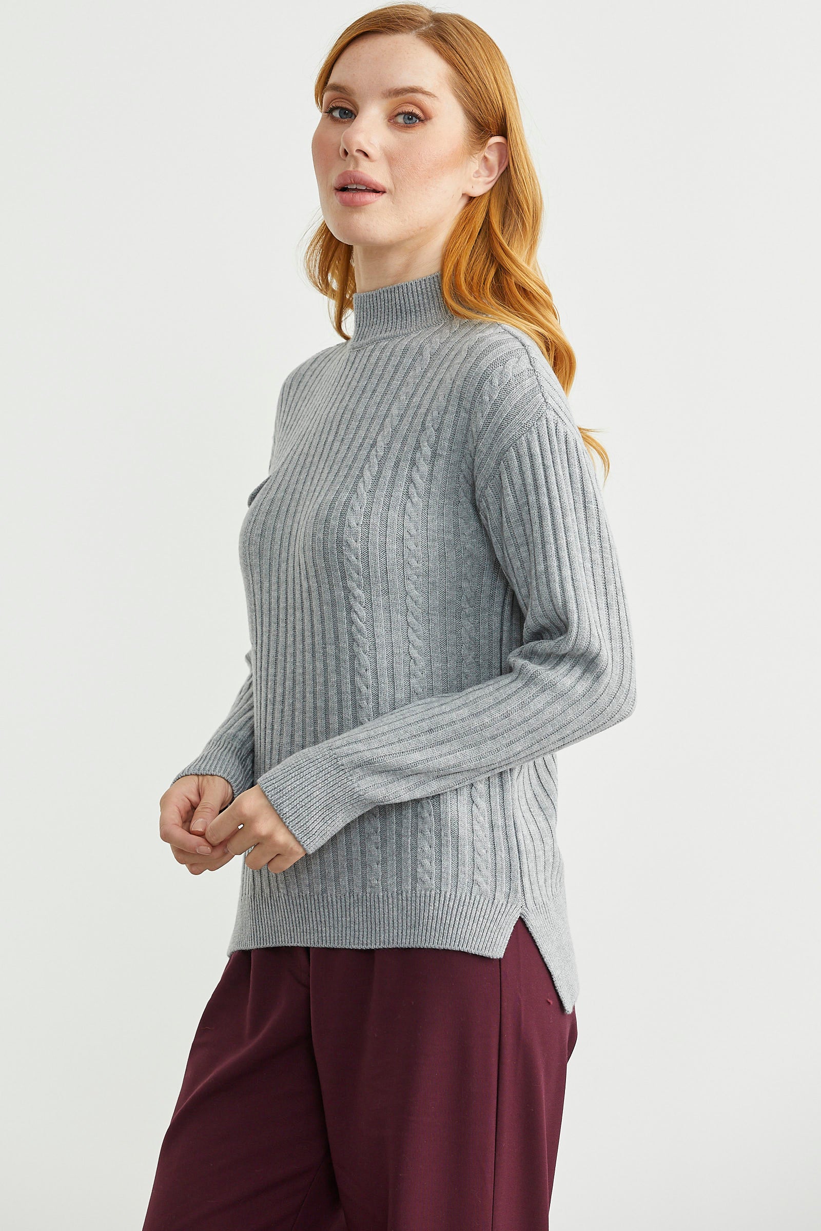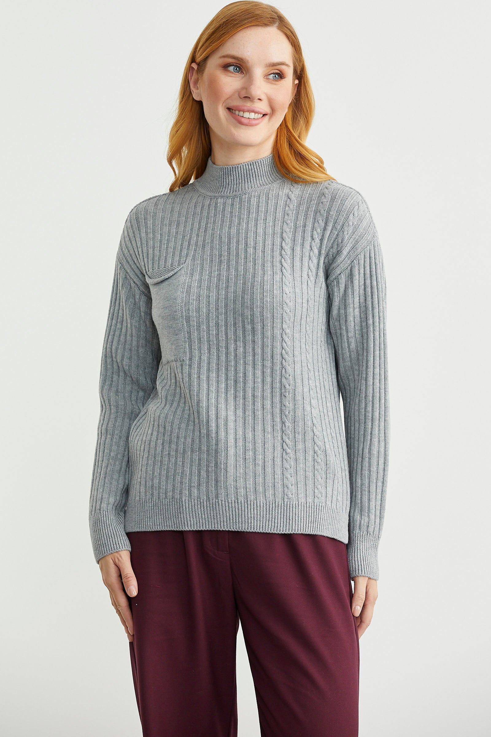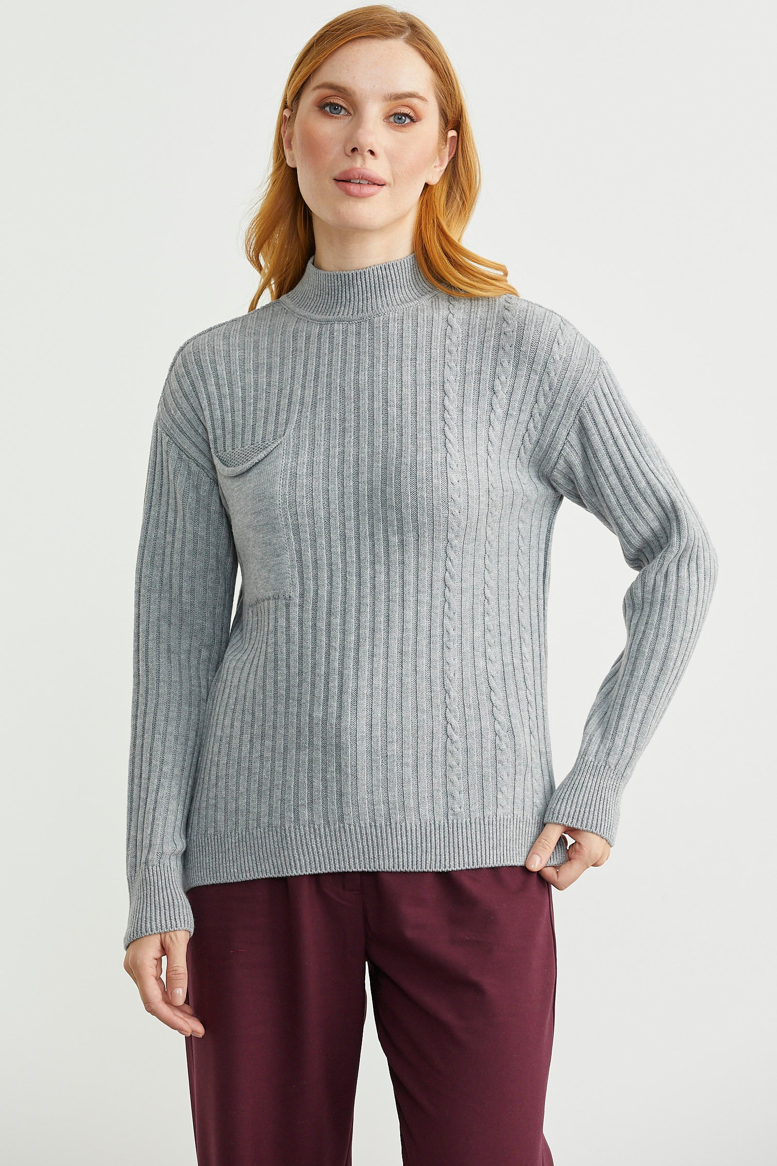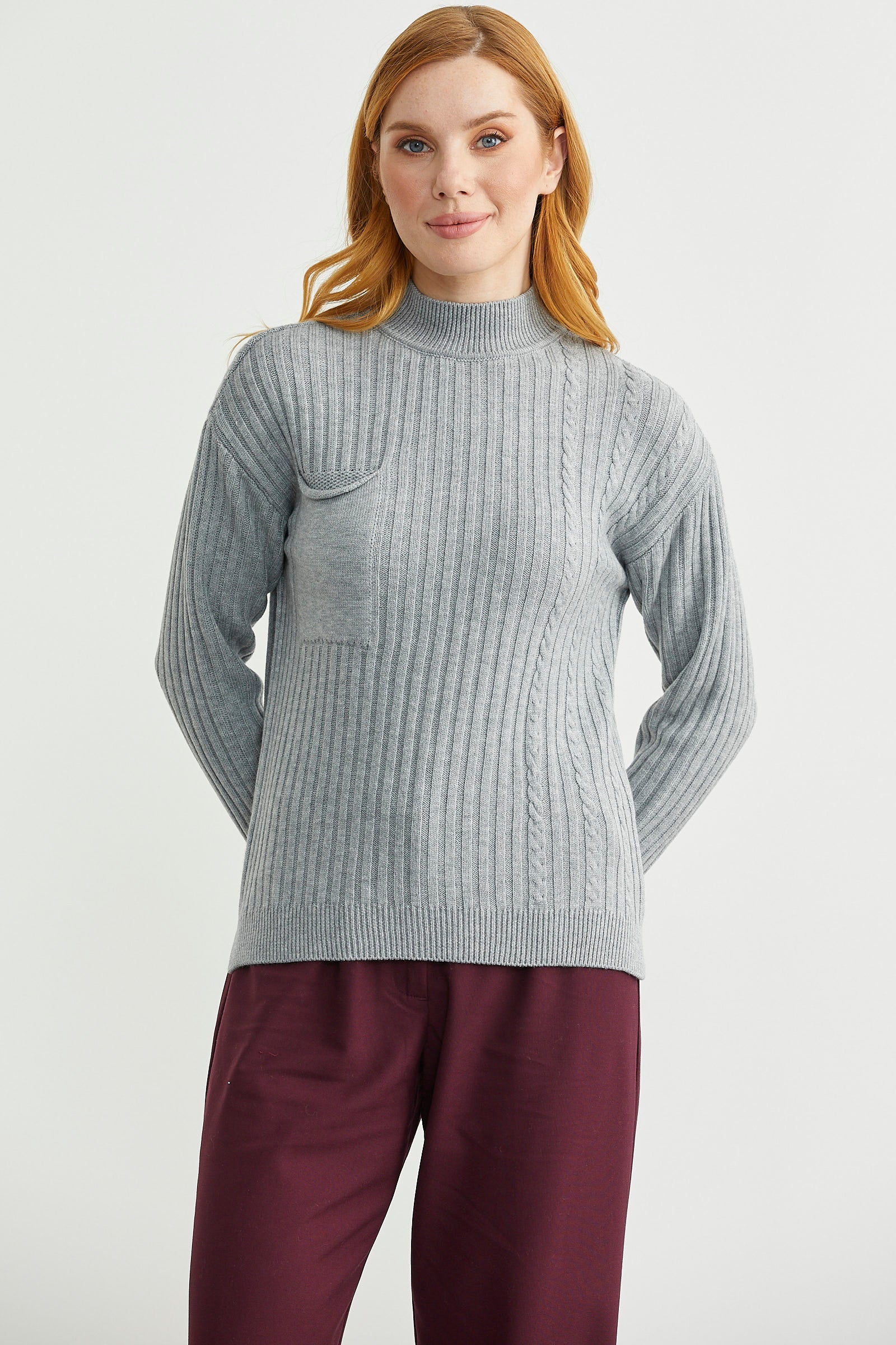Dik Yaka Cep Detaylı Triko Kazak - Gri