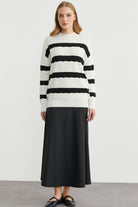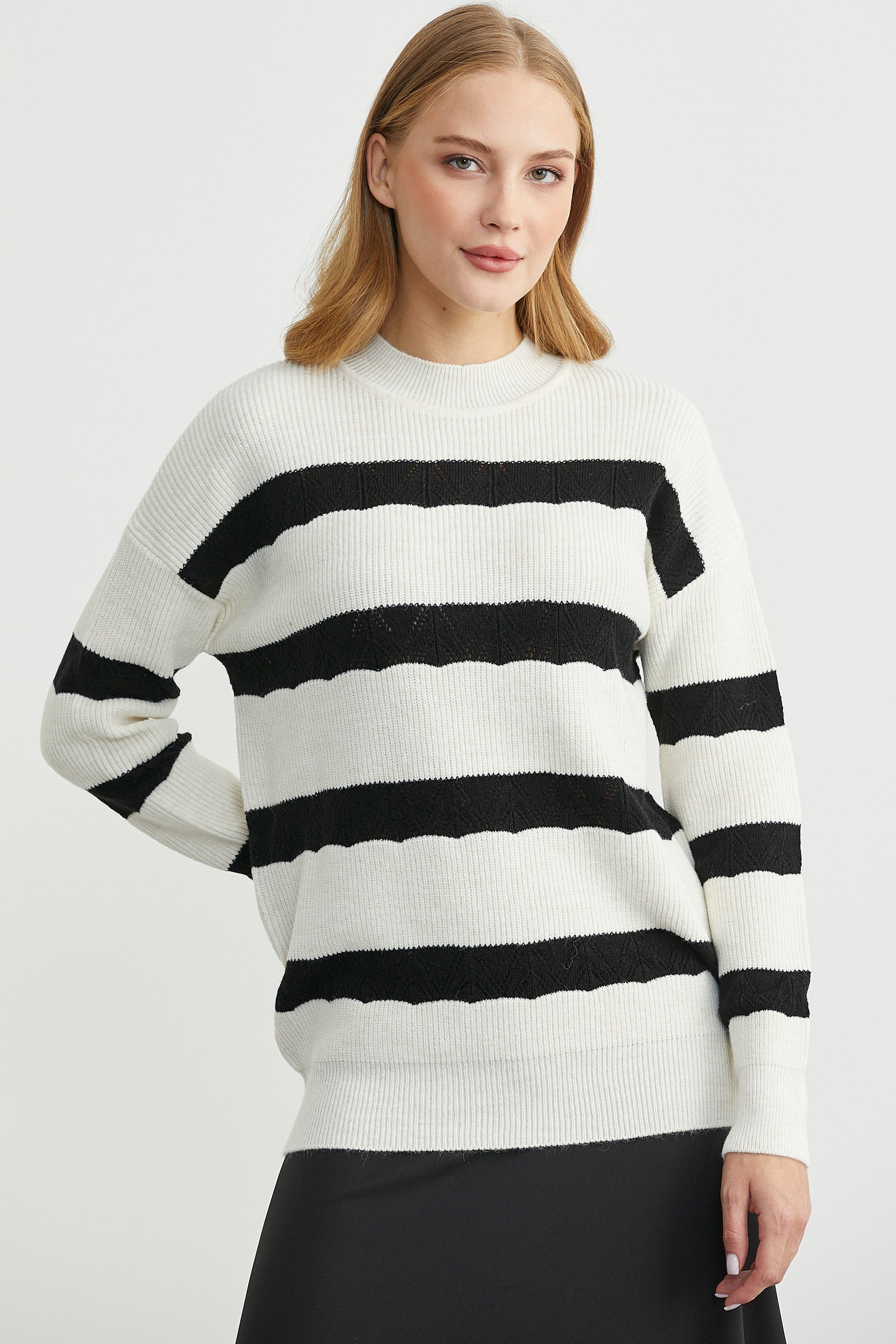Yüksek yuvarlak yaka triko kazak, kontrast çizgili ve delik desenlidir.