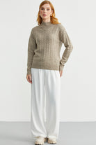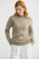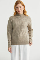 Dik Yaka Motifli Yünlü Triko Kazak - Bej
