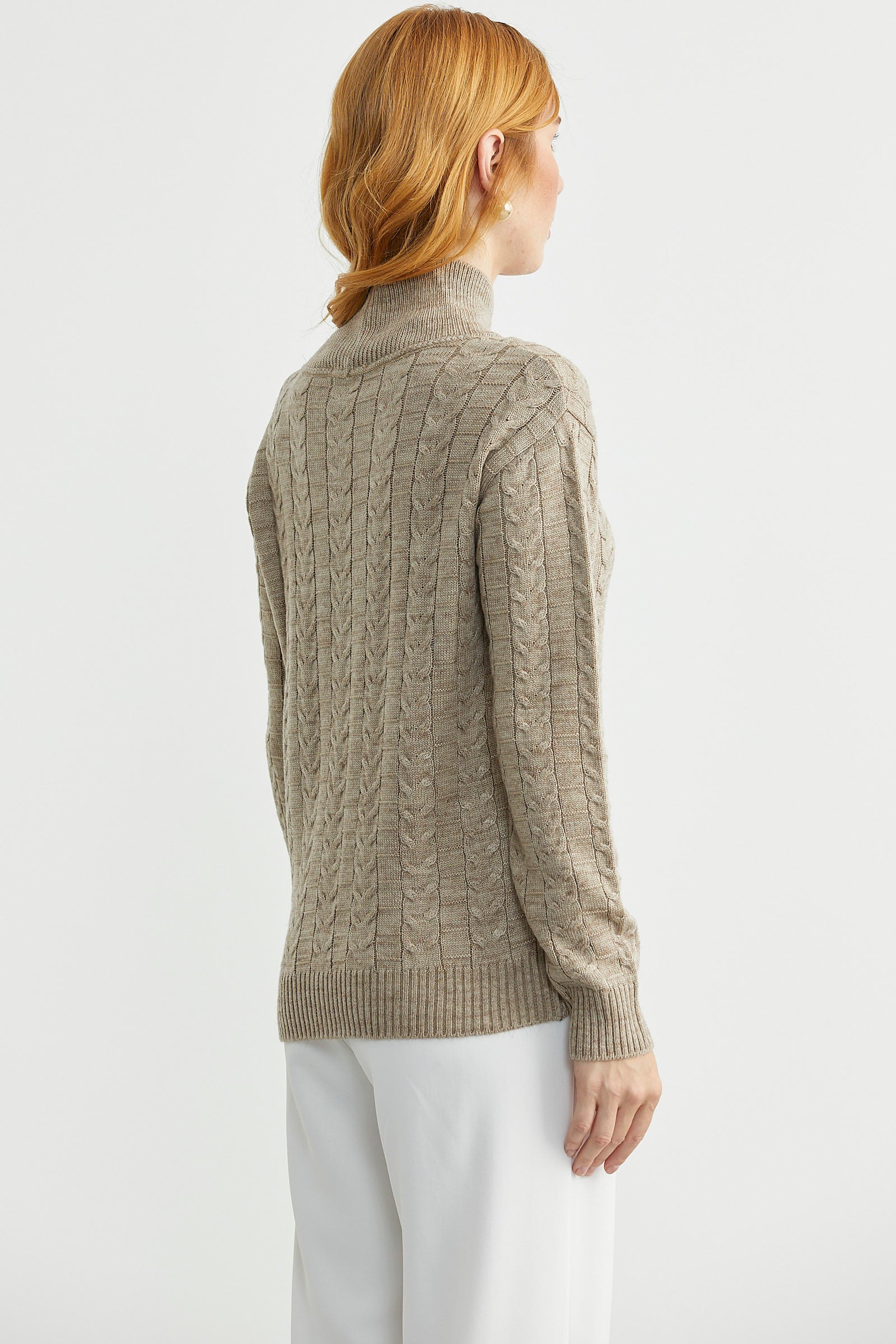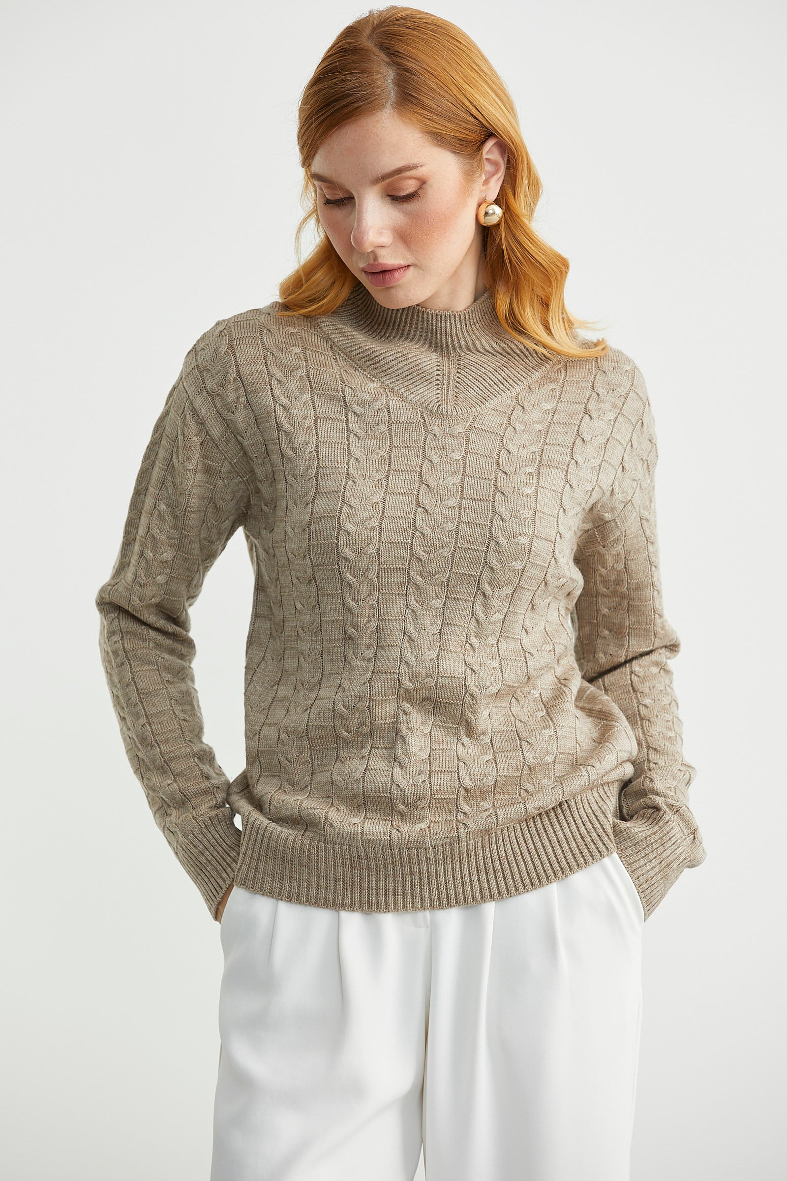 Verev dik yakalı, saç örgü desenli triko kazak. Etek ucu ve kol manşetleri düz bitişlidir.