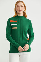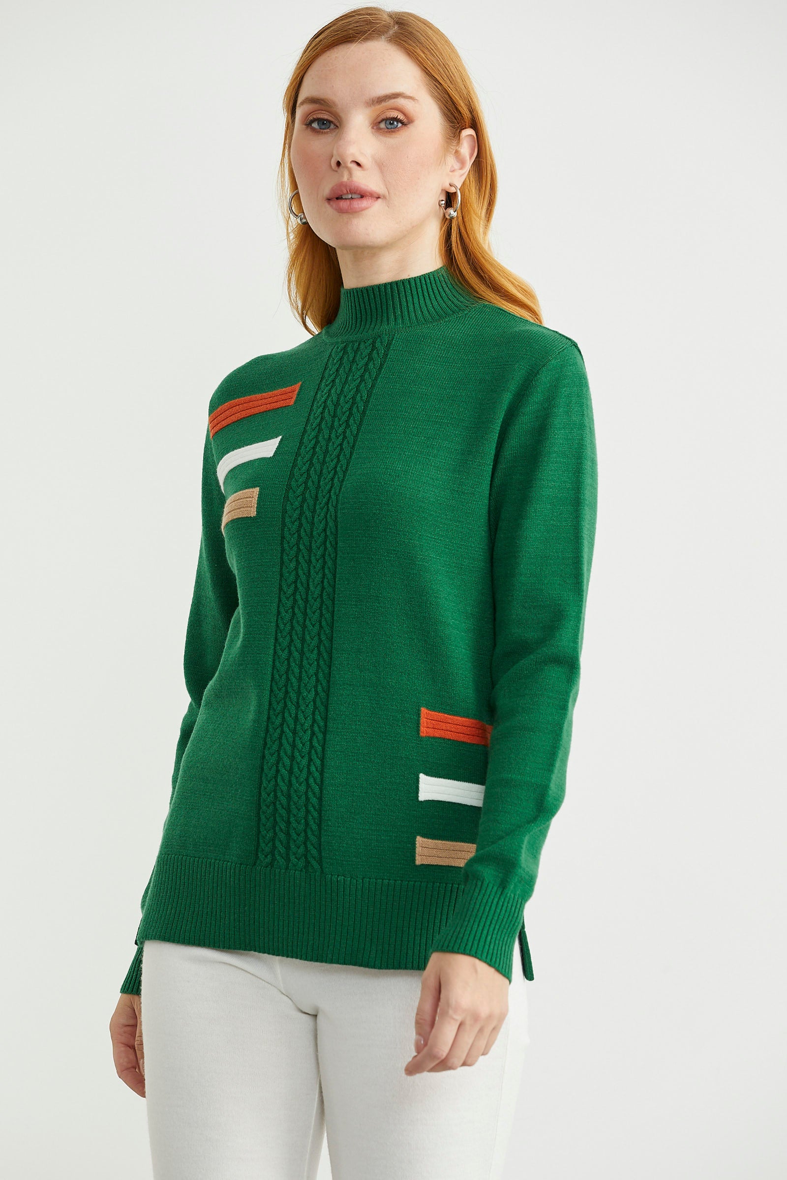 Dik Yaka Renk Detaylı Triko Kazak - Açık Yeşil