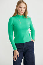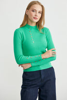 Dik yaka, ekstra rahatlık için esnek, bedene oturan triko kazak. Düğme detaylarıyla hareketlendirilmiş.