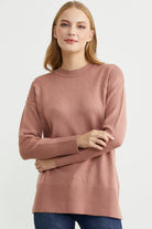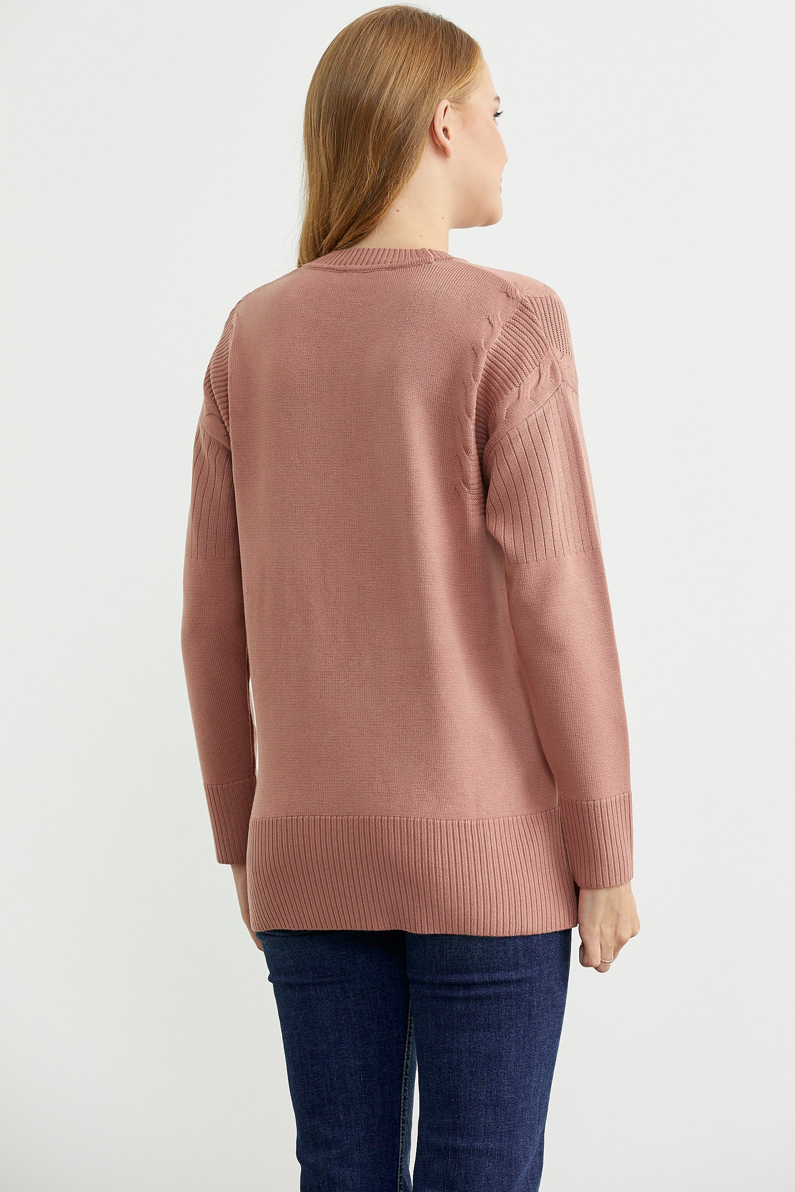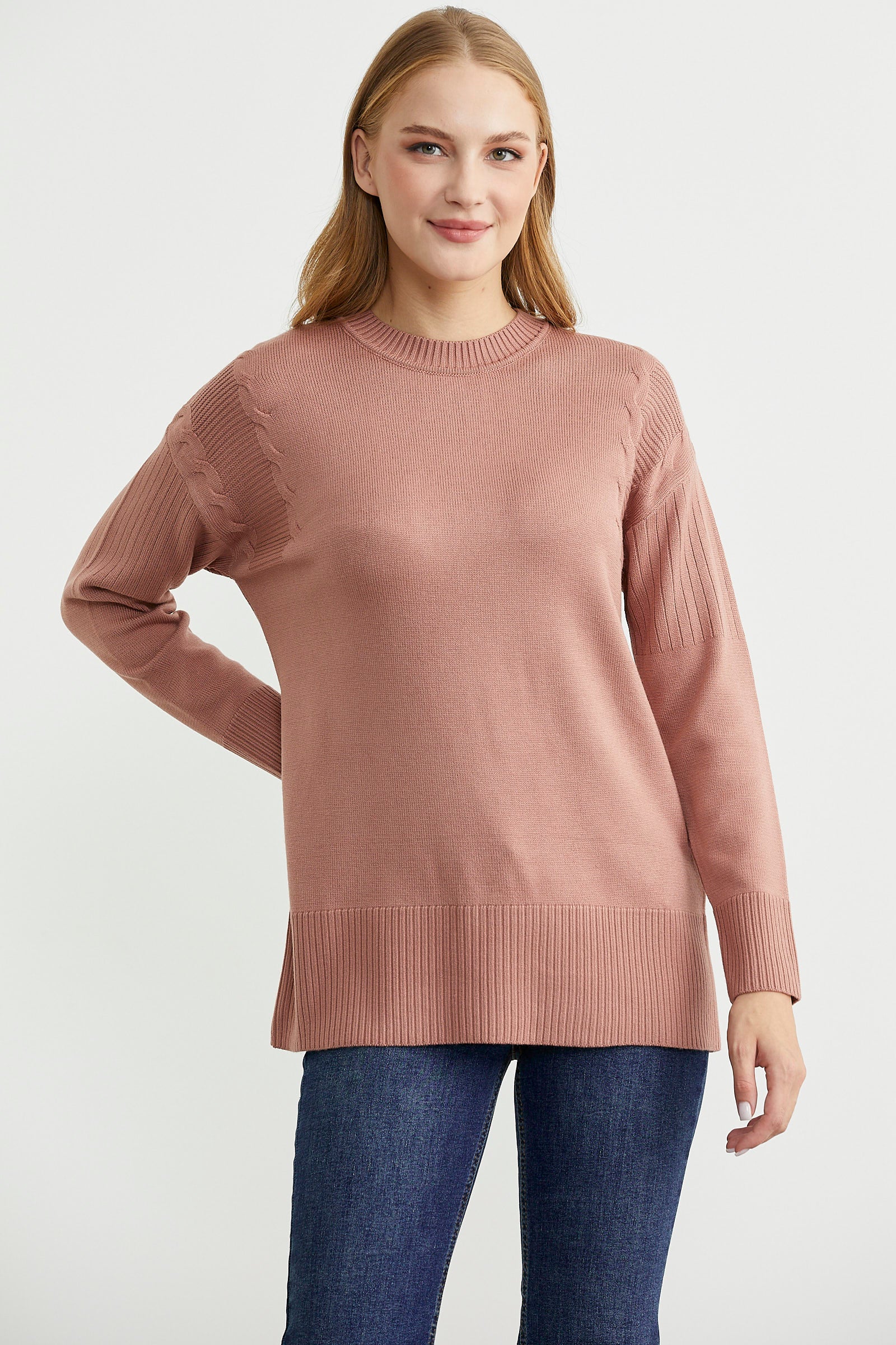 Kol Detaylı Sıfır Yaka Tunik Triko Kazak - Gül