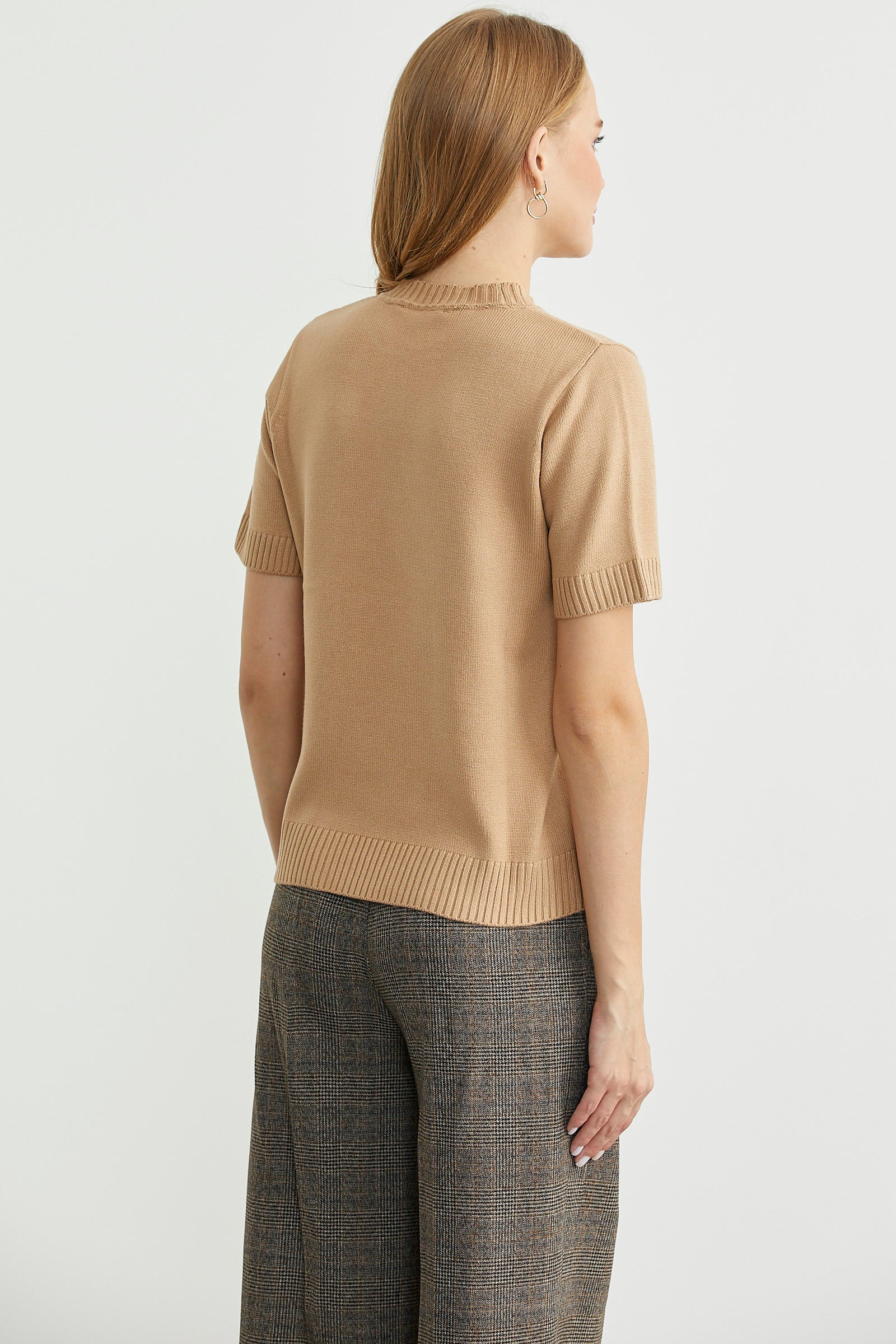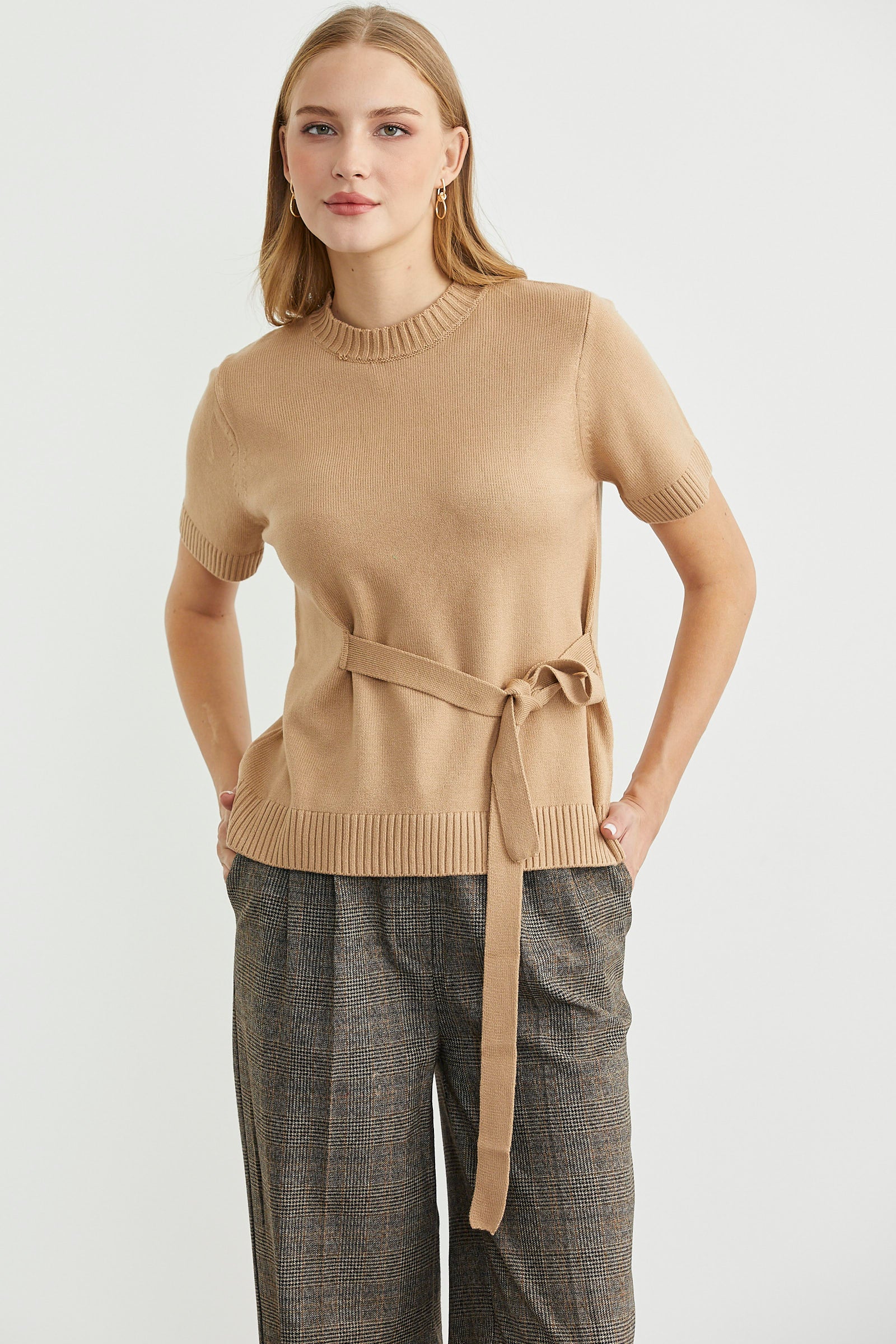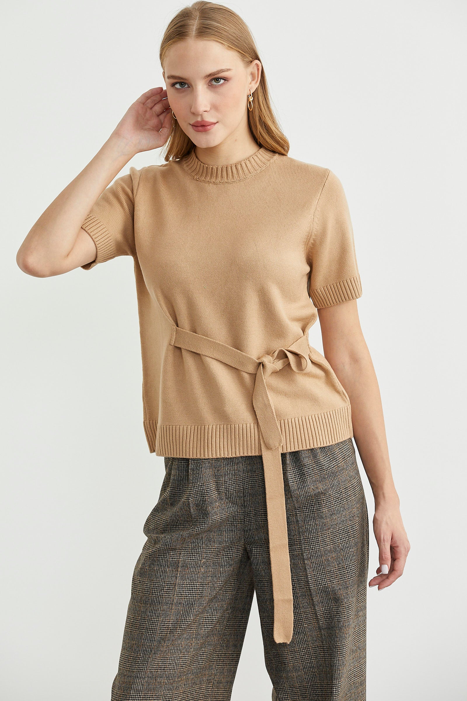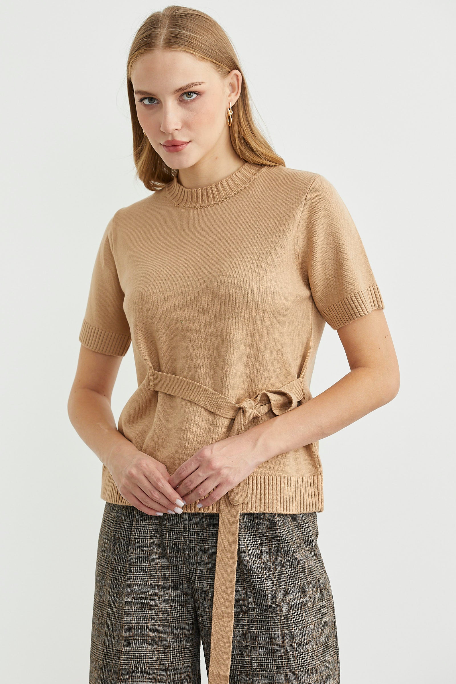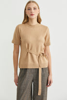 Kuşaklı Kısa Kol Triko Kazak - Kamel
