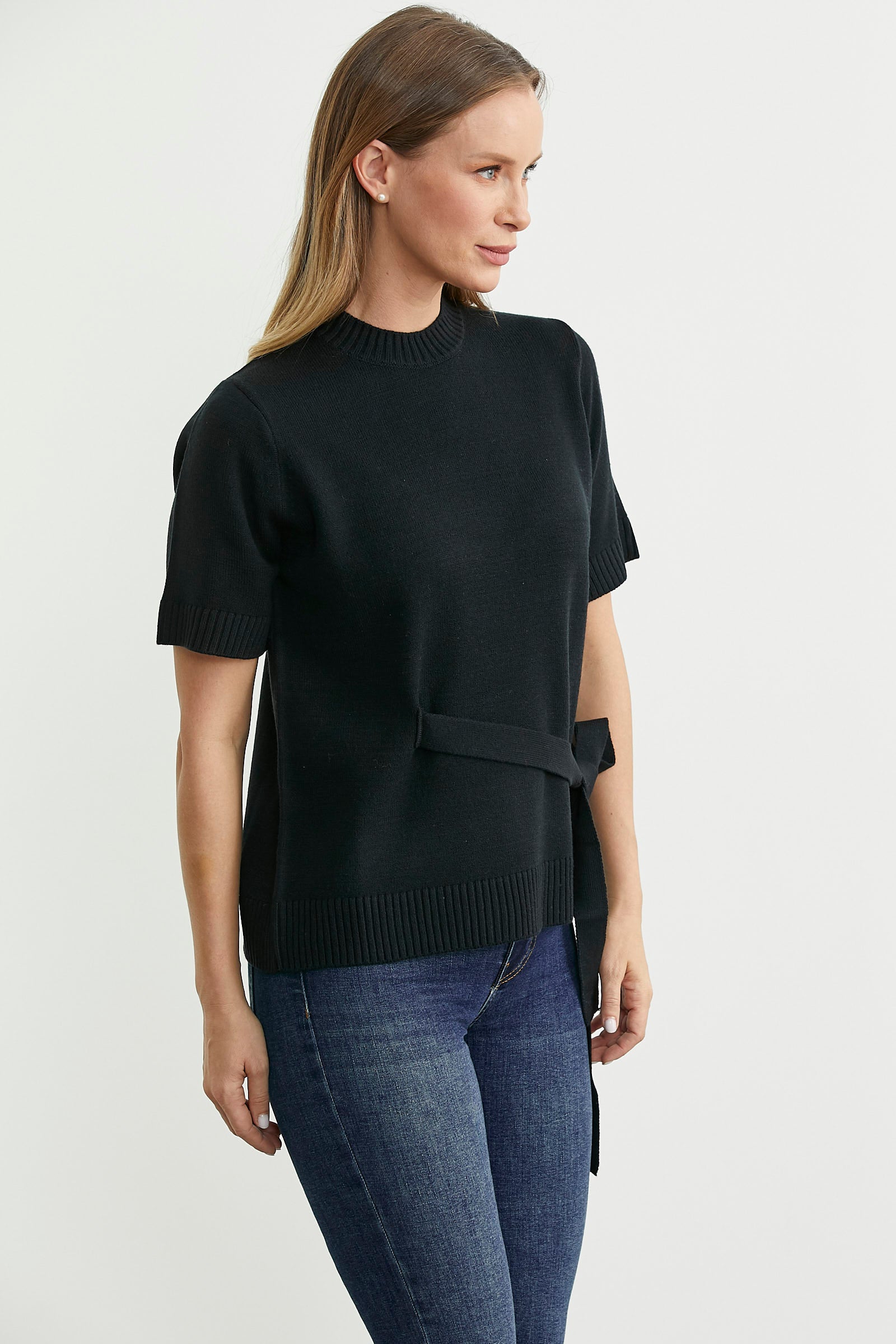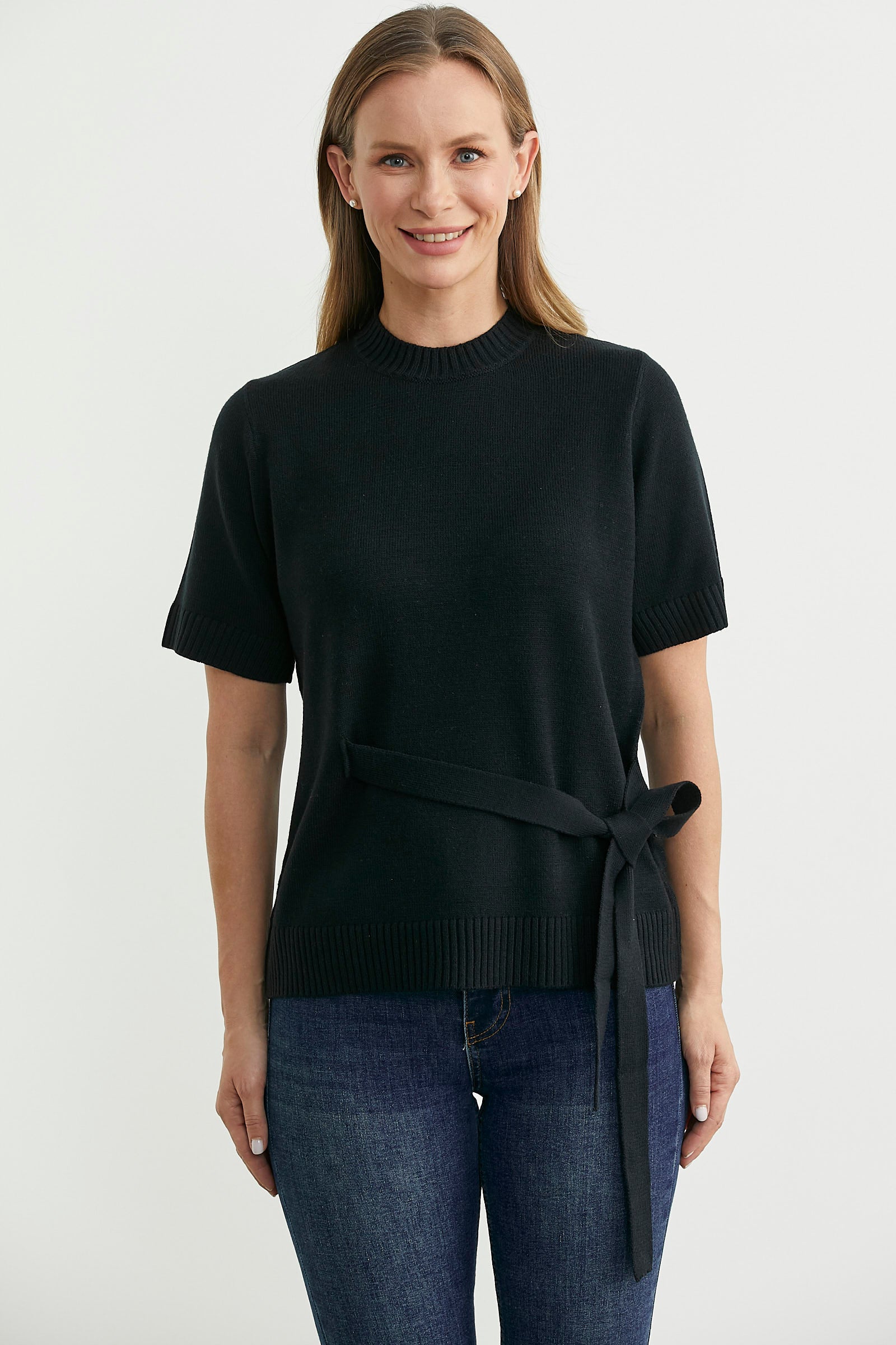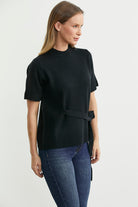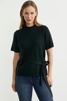 Kuşaklı Kısa Kol Triko Kazak - Siyah