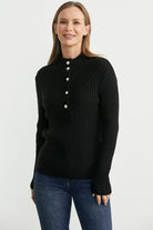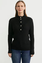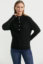 Önü Düğmeli Dik Yaka Triko Kazak - Siyah