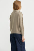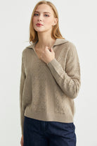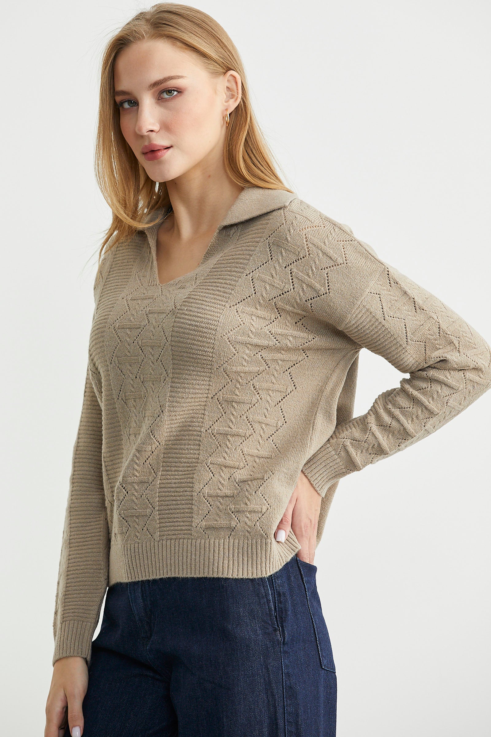 Polo yaka, delik motifli triko kazak.İnce ve esnek yapıda üretilmiştir.