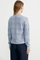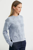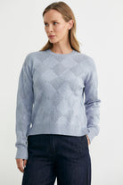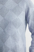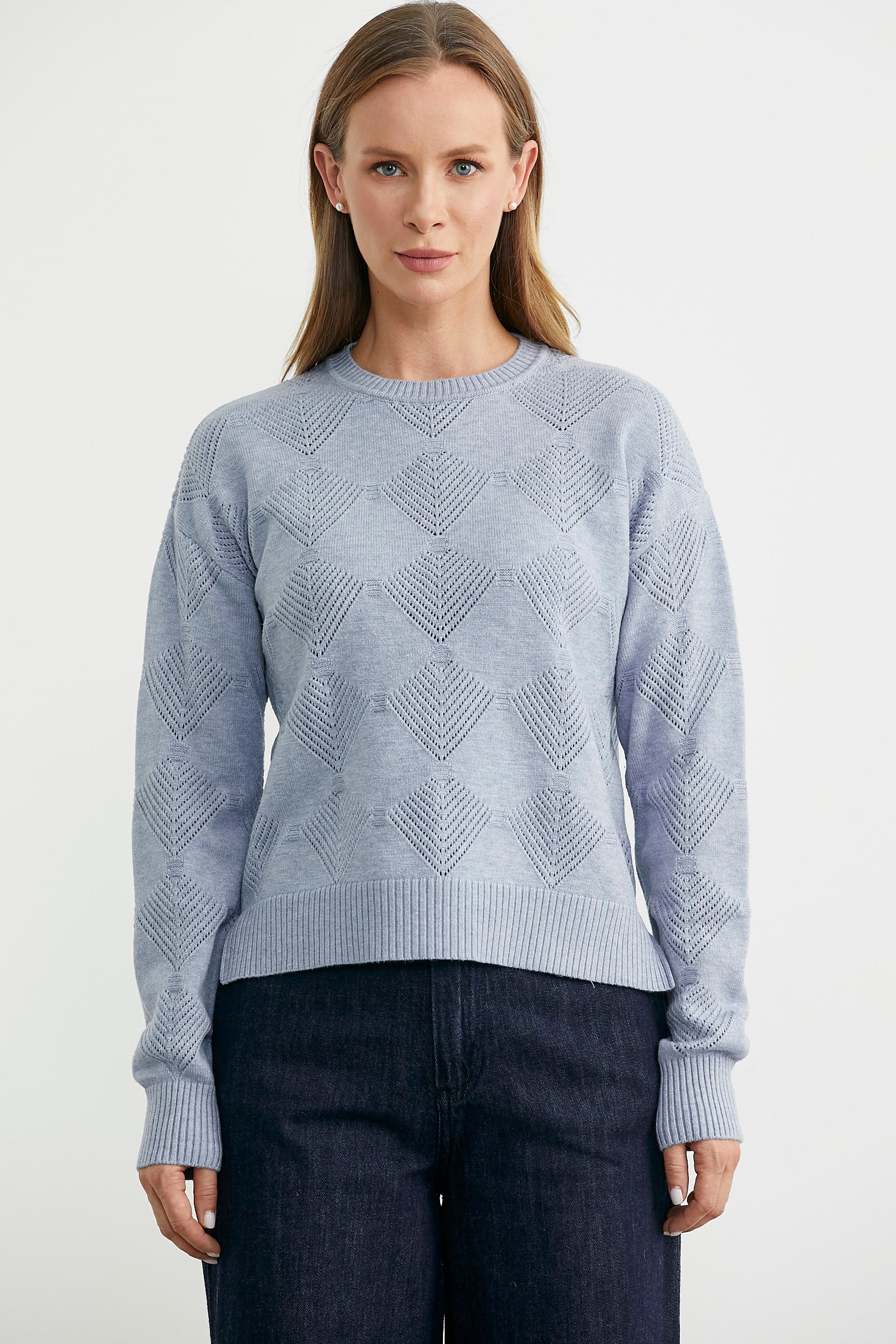 Yuvarlak yakalı, delik desenli, düşük omuzlu. ince triko kazak.