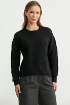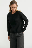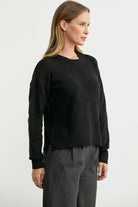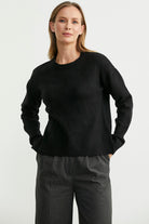 Yuvarlak yakalı, delik desenli, düşük omuzlu. ince triko kazak.
