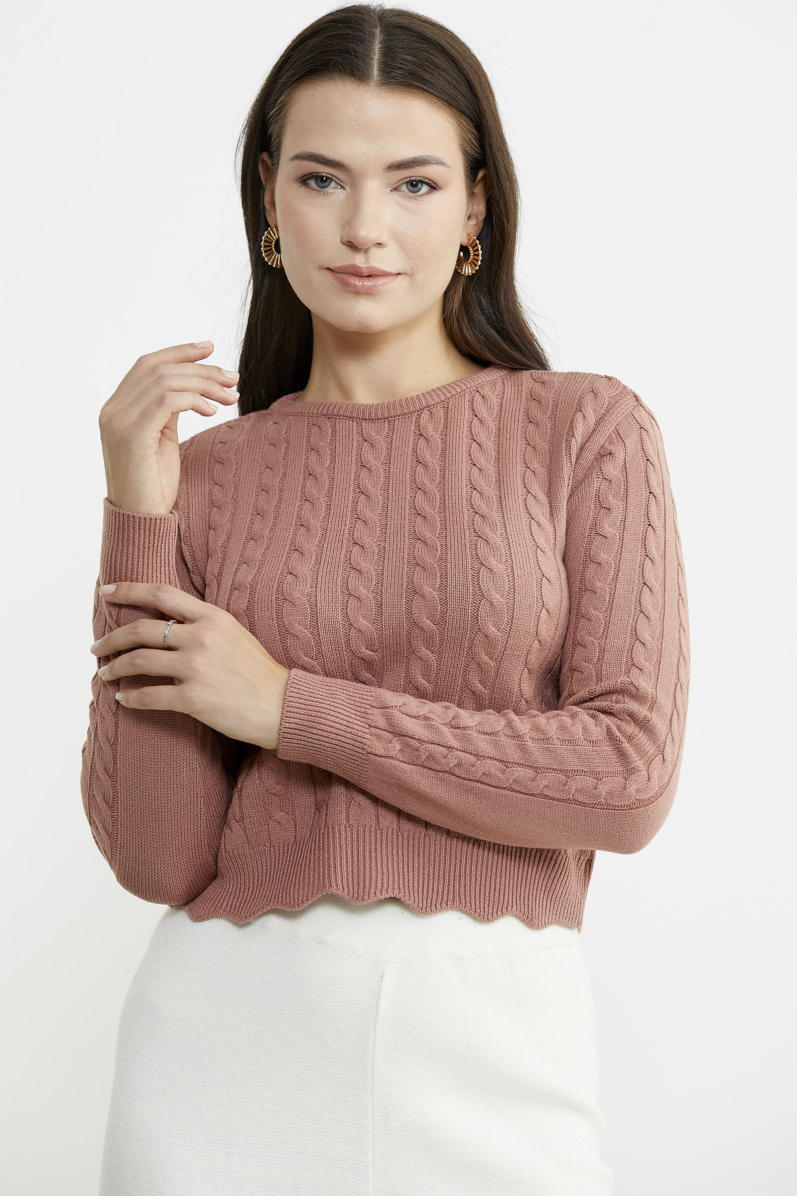Saç Örgü Dilimli Crop Triko Kazak - Gül
