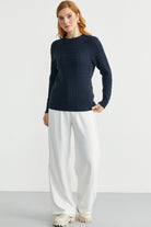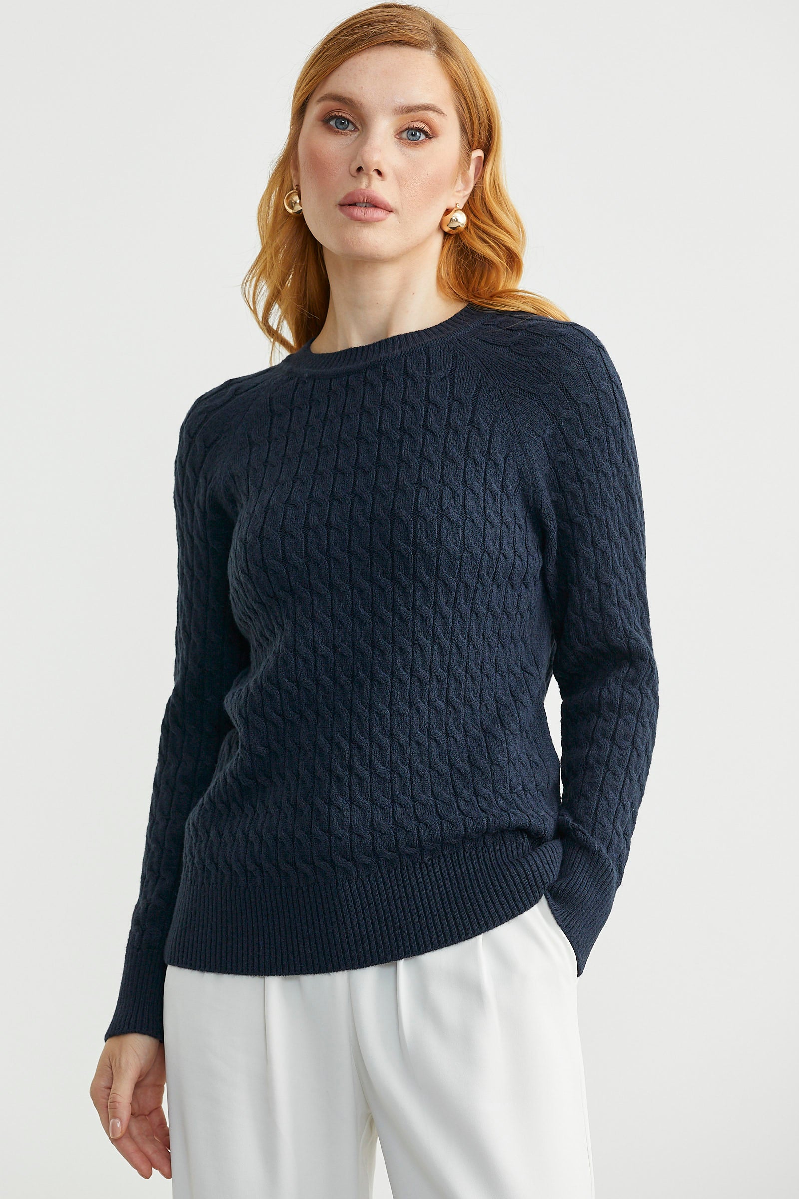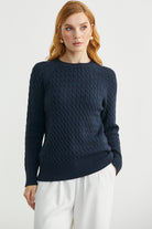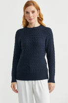 Saç Örgü Motifli Yuvarlak Yaka Triko Kazak - Lacivert