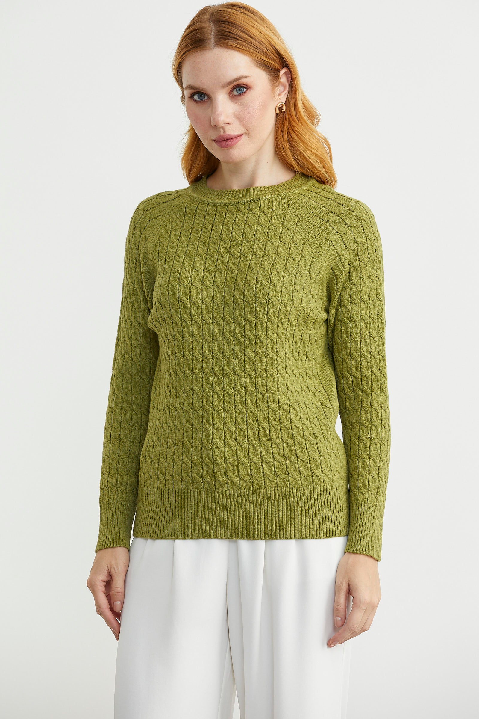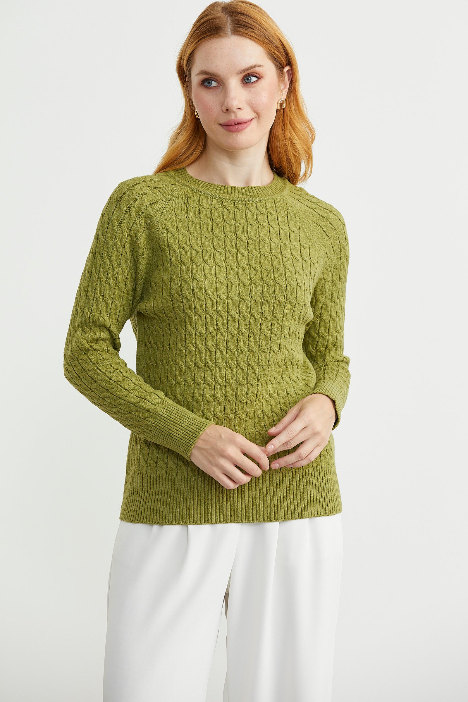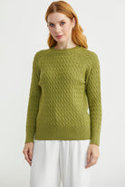 Saç Örgü Motifli Yuvarlak Yaka Triko Kazak - Yeşil